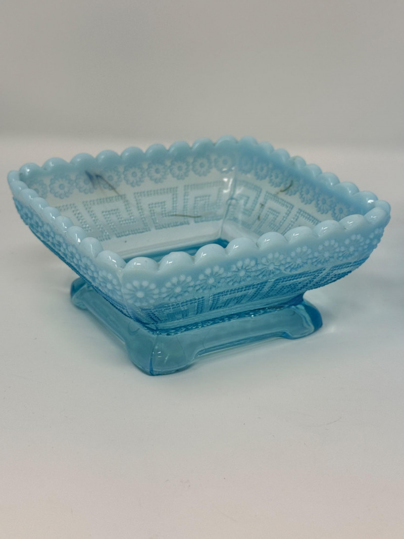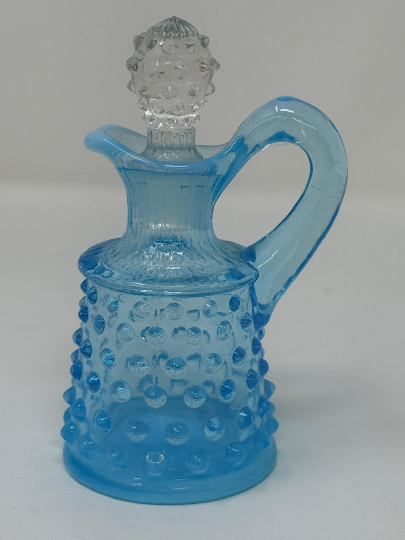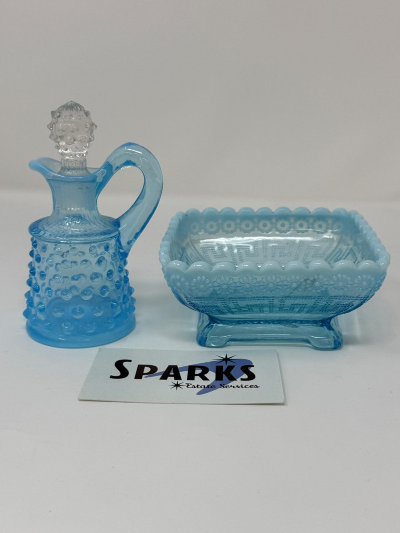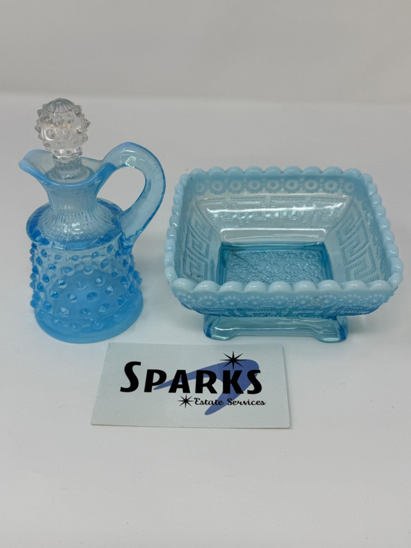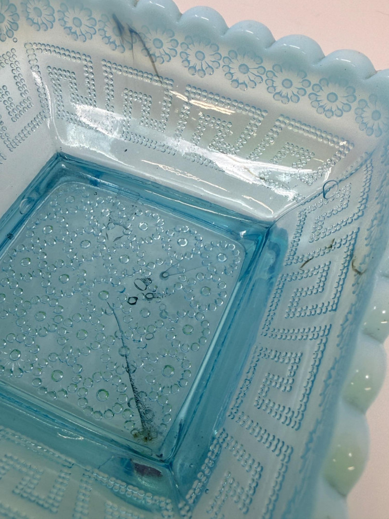 Blue Fenton Cruet & Davidson Daisy Suite 1886 Bowl Vintage Fenton Blue Opalescent Hobnail glass cruet, likely produced between 1942 and 1955. Fenton Glass Company. Blue opalescent art glass with a clear glass stopper. Approximately 4.75 inches tall. The item shown in the image is a Davidson Victorian Blue Pearline Glass "Daisy Suite 1886" George Davidson & Co. Gateshead, England. Daisy Suite Pattern 1886. Victorian pressed glass known as "Pearline" or "Blue Pearline" due to its distinctive opalescent white rim. The bowl features a scalloped edge, a floral daisy pattern around the rim, and a "Greek Key" geometric pattern on the lower section. Approximately 4.25' square by 2".