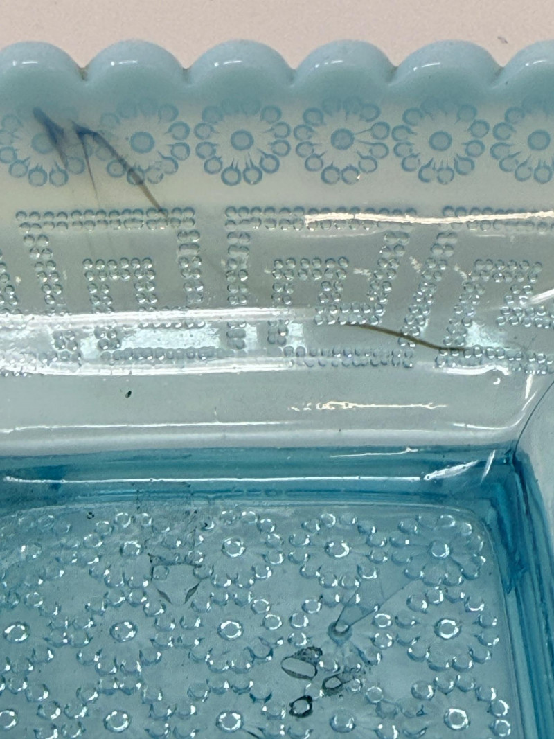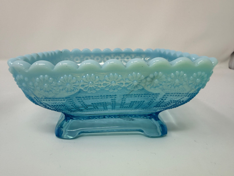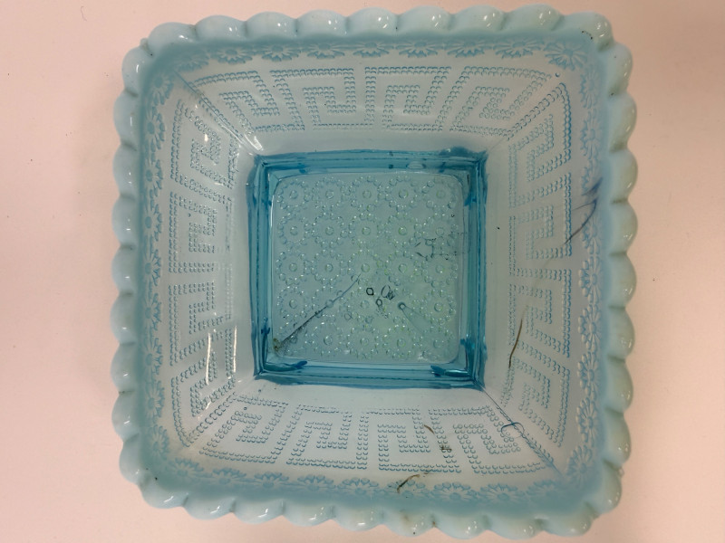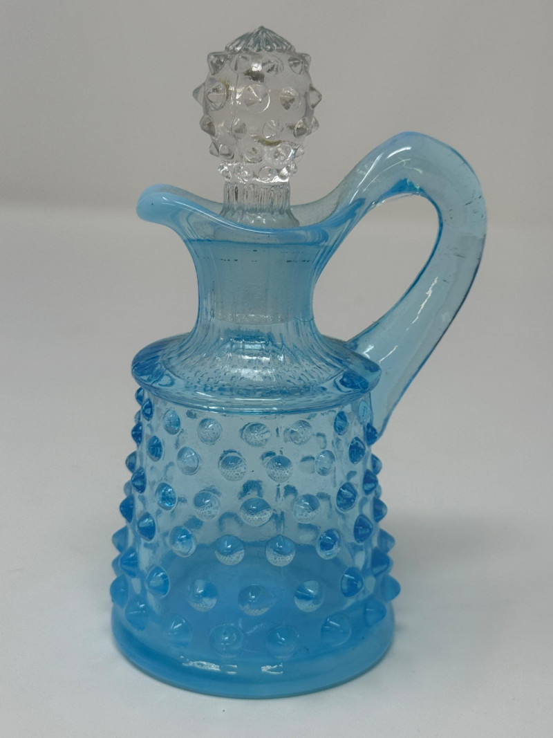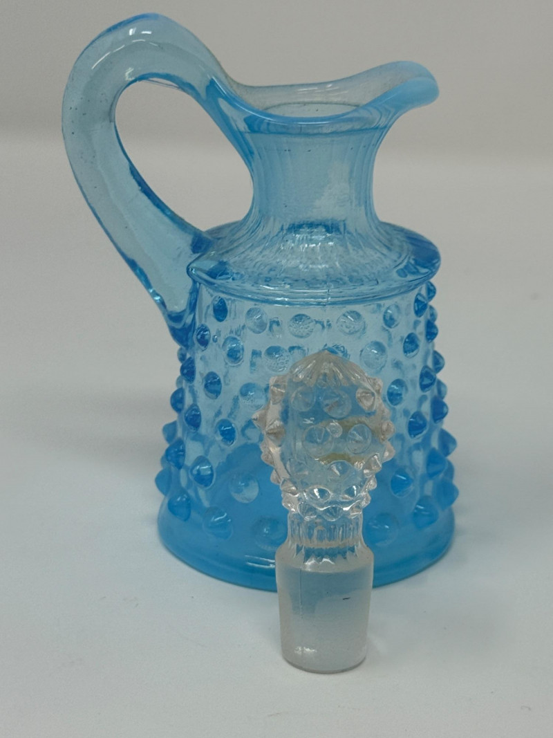 Blue Fenton Cruet & Davidson Daisy Suite 1886 Bowl Vintage Fenton Blue Opalescent Hobnail glass cruet, likely produced between 1942 and 1955. Fenton Glass Company. Blue opalescent art glass with a clear glass stopper. Approximately 4.75 inches tall. The item shown in the image is a Davidson Victorian Blue Pearline Glass "Daisy Suite 1886" George Davidson & Co. Gateshead, England. Daisy Suite Pattern 1886. Victorian pressed glass known as "Pearline" or "Blue Pearline" due to its distinctive opalescent white rim. The bowl features a scalloped edge, a floral daisy pattern around the rim, and a "Greek Key" geometric pattern on the lower section. Approximately 4.25' square by 2".