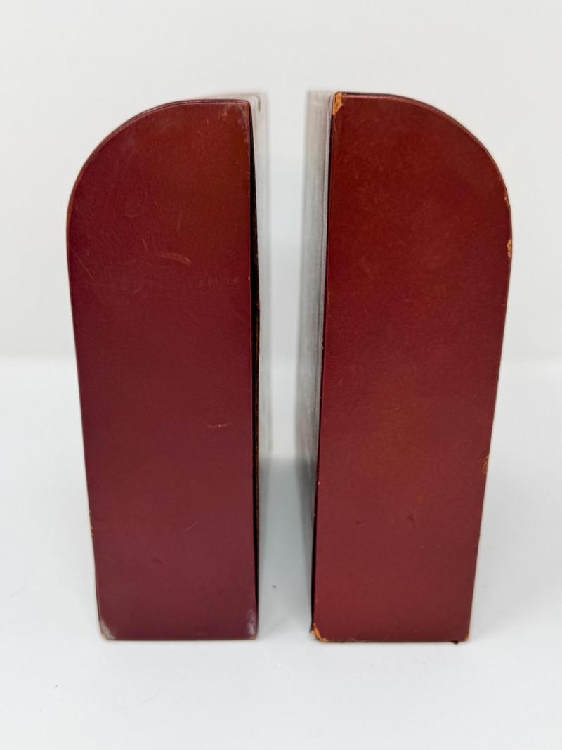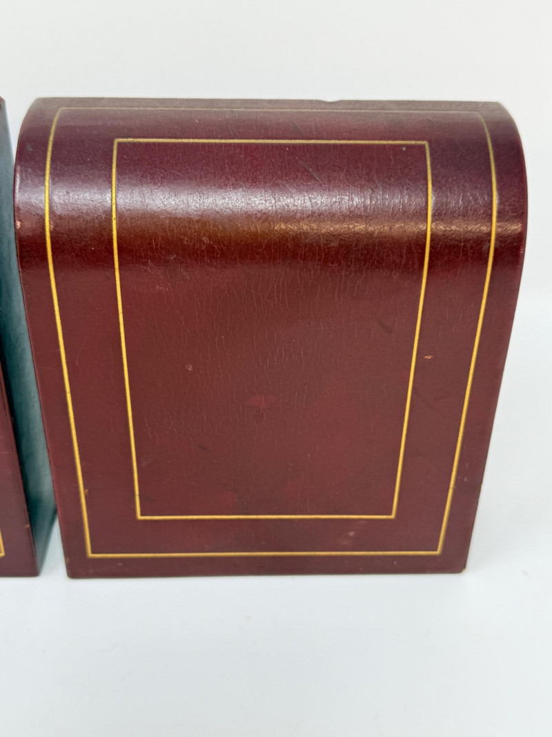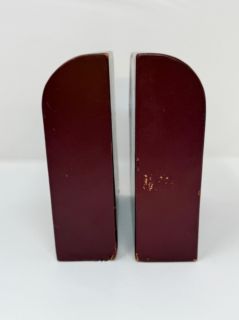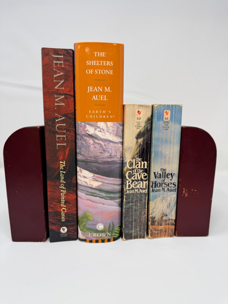 Burgundy Leather & Gold Bookends & Jean M Auel Books These bookends feature a rich red or burgundy bonded leather exterior with elegant gold embossed detailing. The curved, rounded tops and rectangular gold borders give them a classic, library-style aesthetic. Jean M Auel books include: The Land of Painted Caves The Shelters of Stone The Clan of the Cave Bear The Valley of Horses