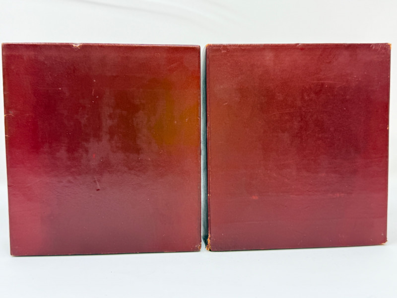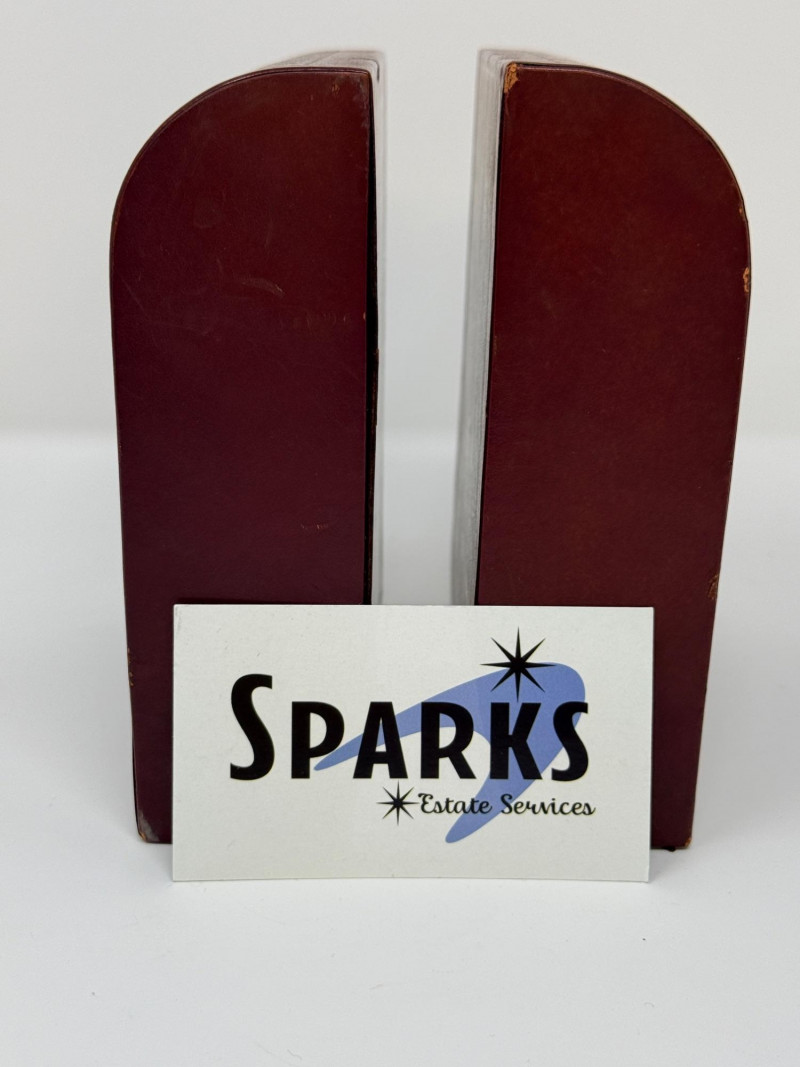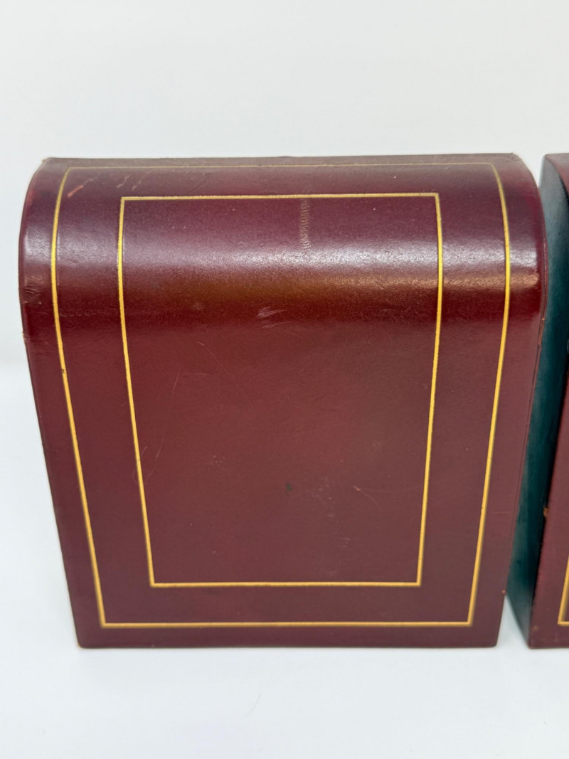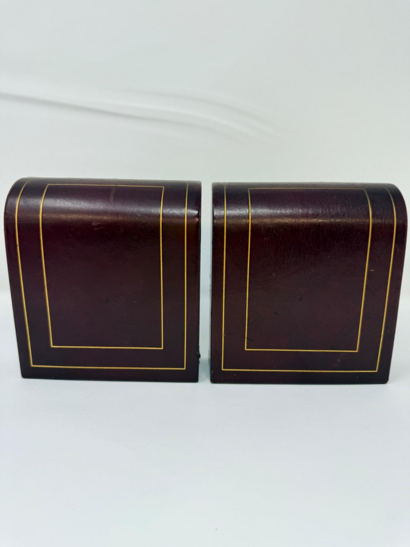 Burgundy Leather & Gold Bookends & Jean M Auel Books These bookends feature a rich red or burgundy bonded leather exterior with elegant gold embossed detailing. The curved, rounded tops and rectangular gold borders give them a classic, library-style aesthetic. Jean M Auel books include: The Land of Painted Caves The Shelters of Stone The Clan of the Cave Bear The Valley of Horses