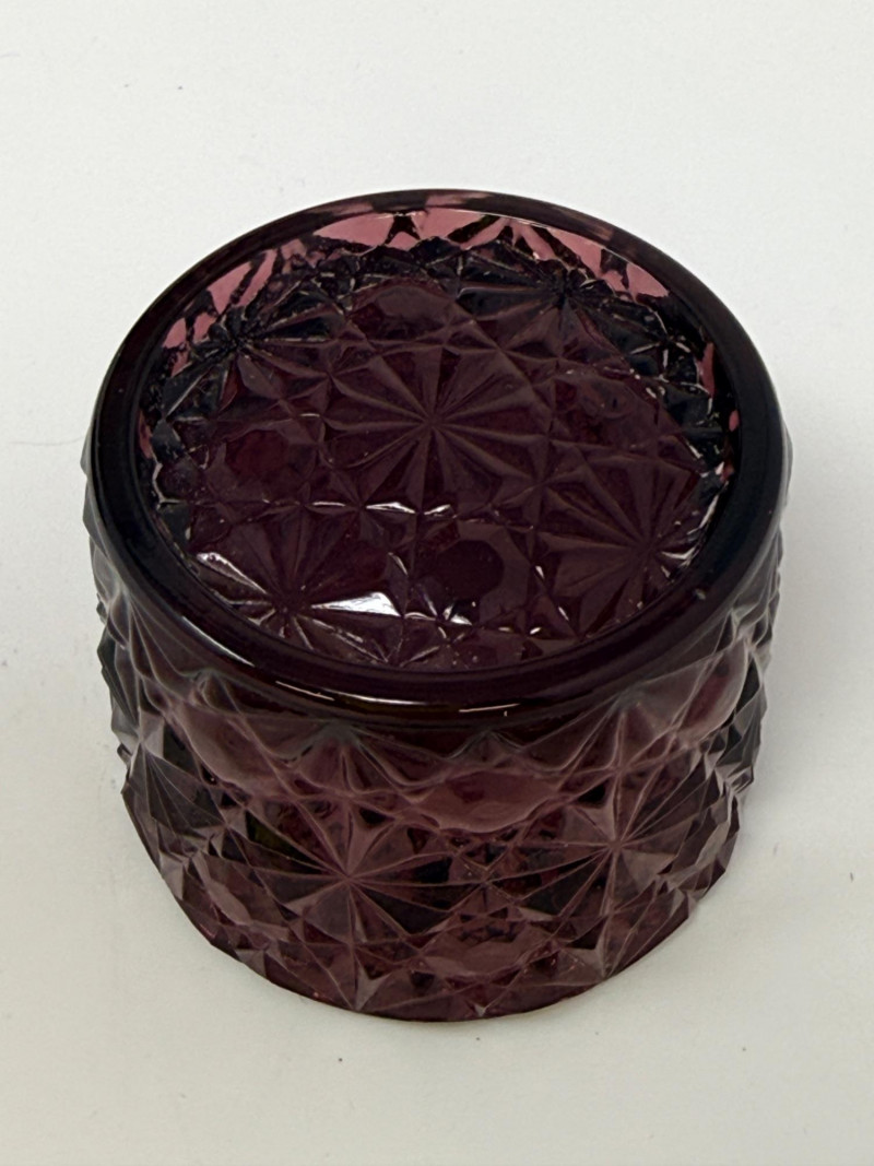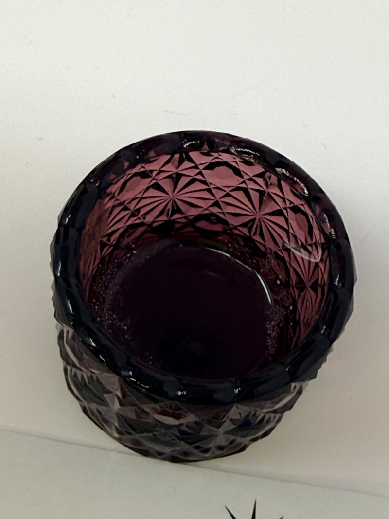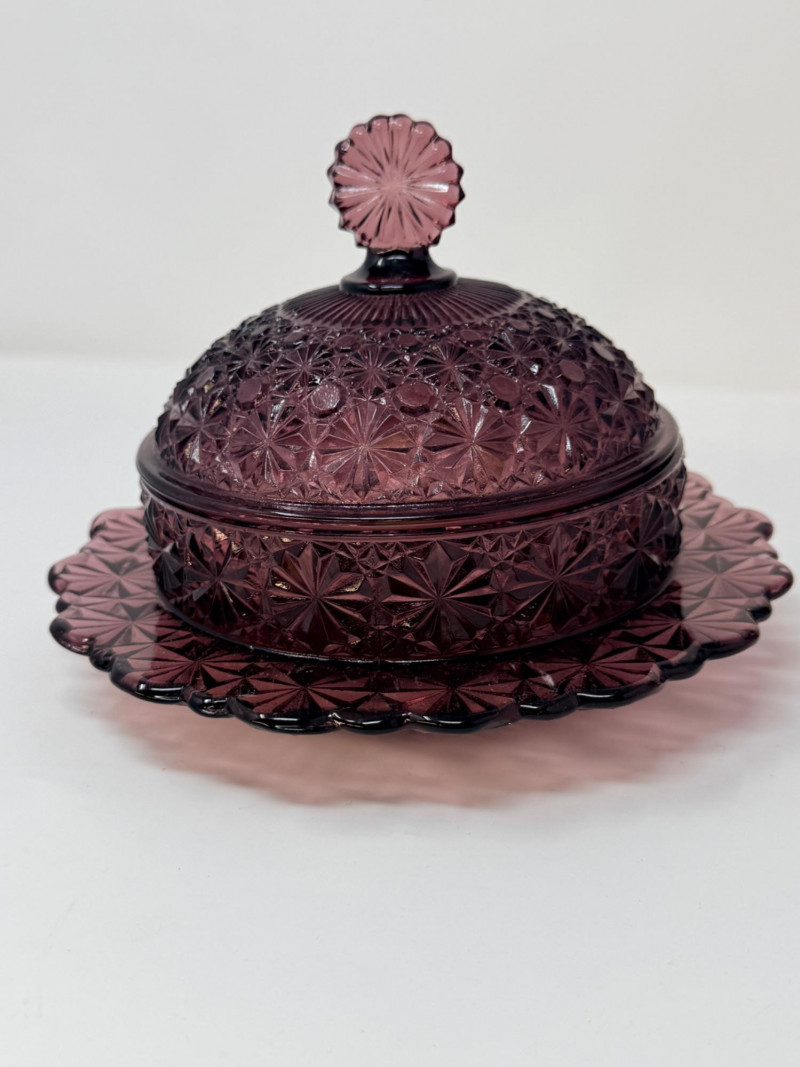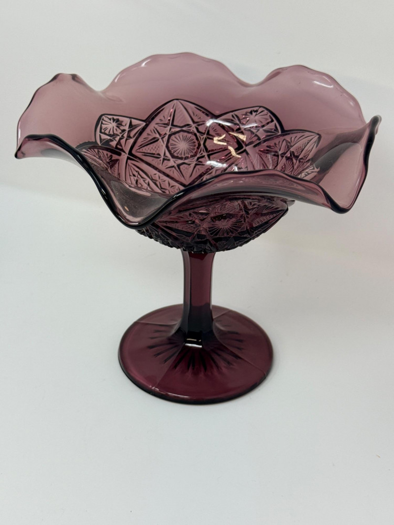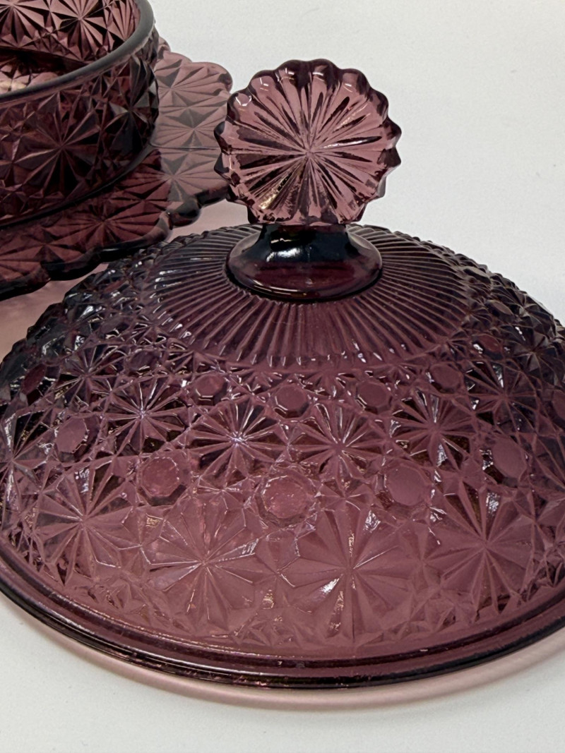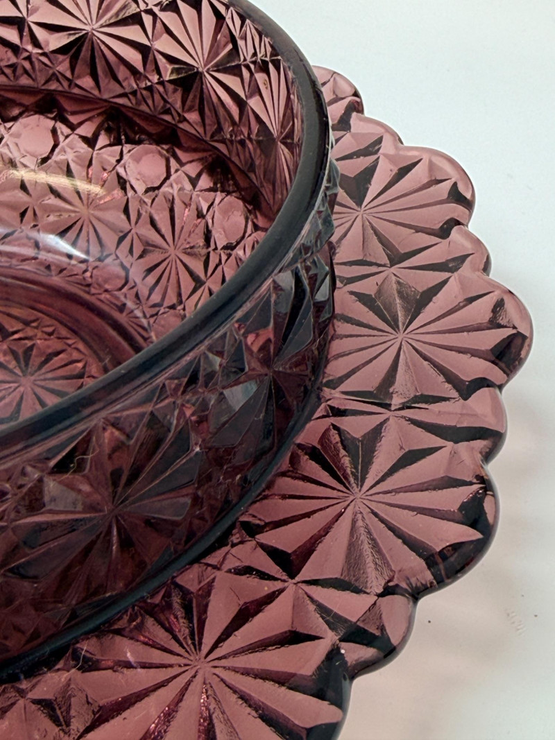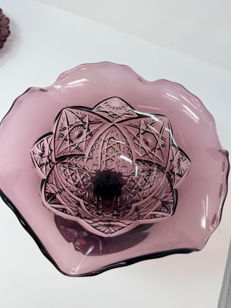 Dark Purple Pressed Glass Covered dish is 7 1/2 x 5 1/2“ Fluted bowl is 8“ x 7“ 1.75” x 1.5”
