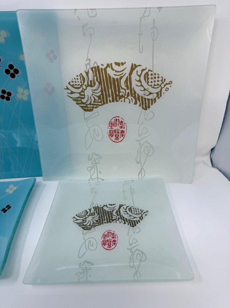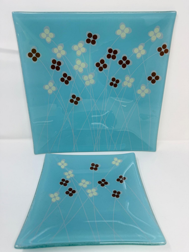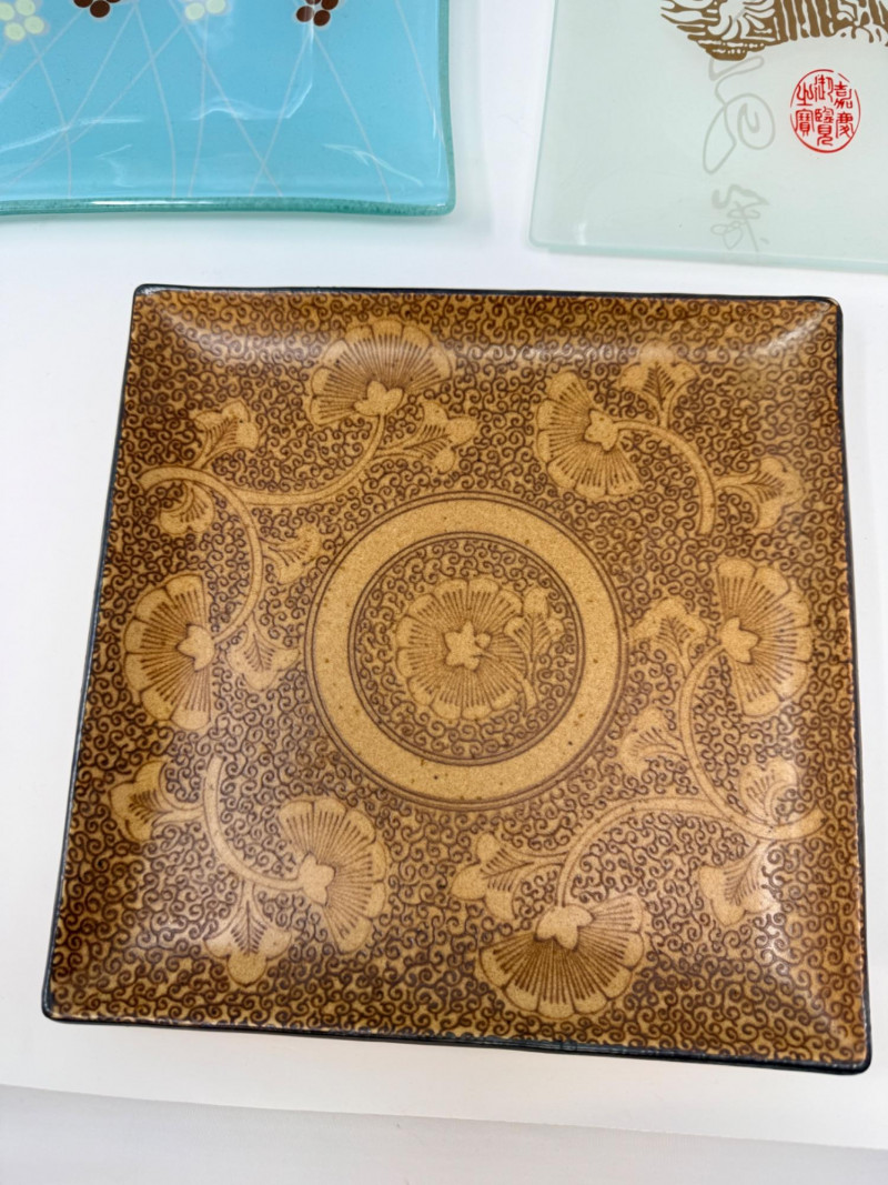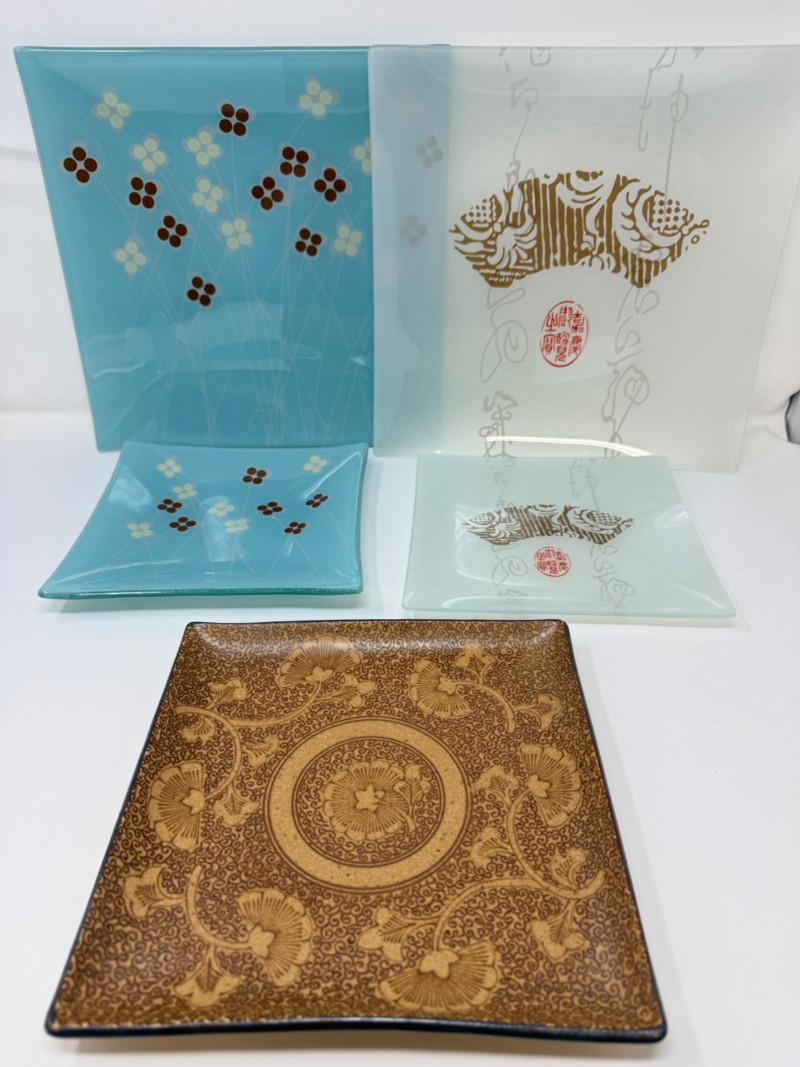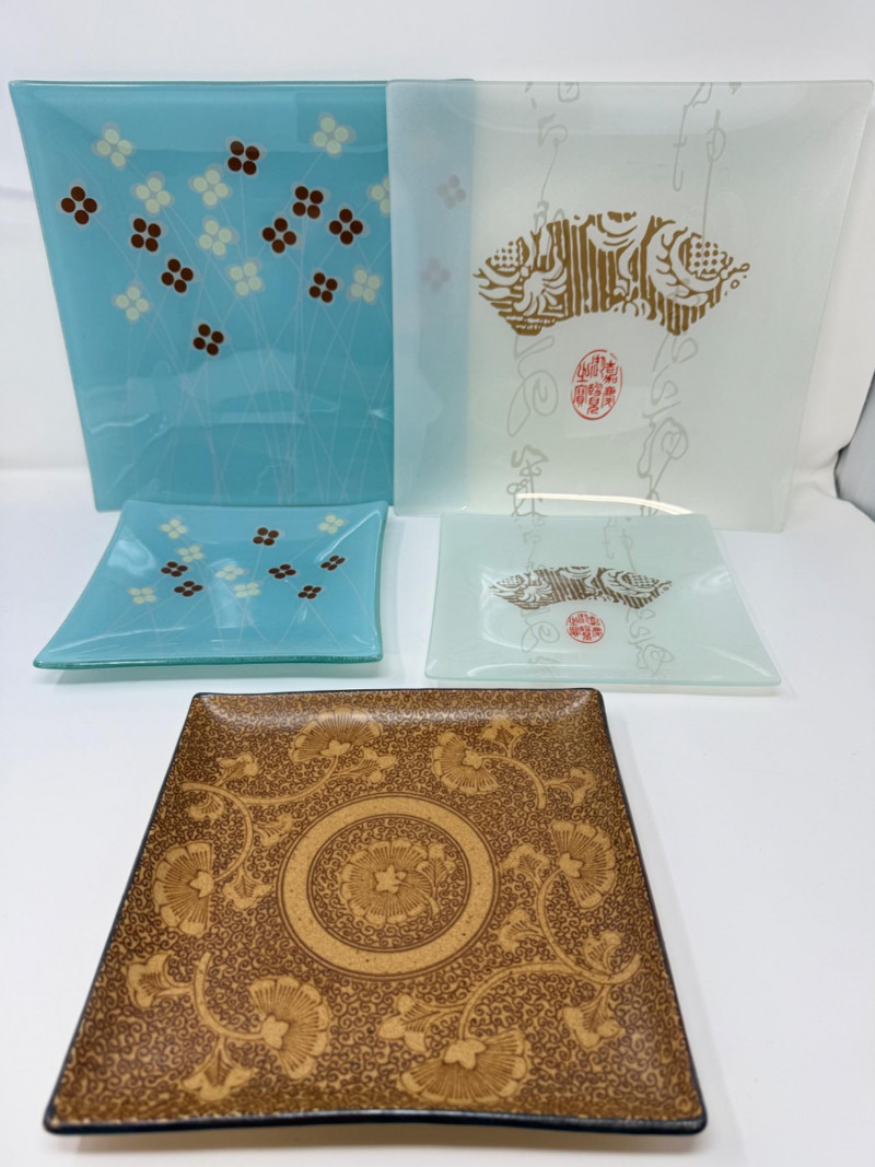 Square Plates & Platters (2)12"x12" Glass platters (2) 7”x7” Glass plates Brown ceramic plate is 8.75” square.