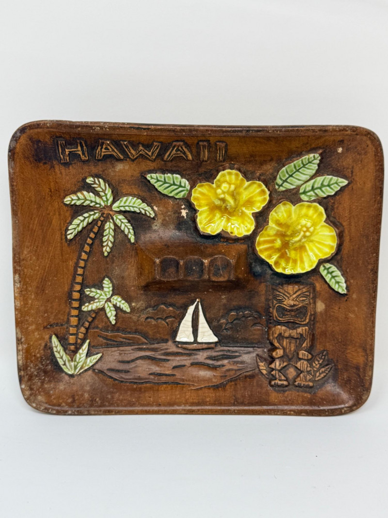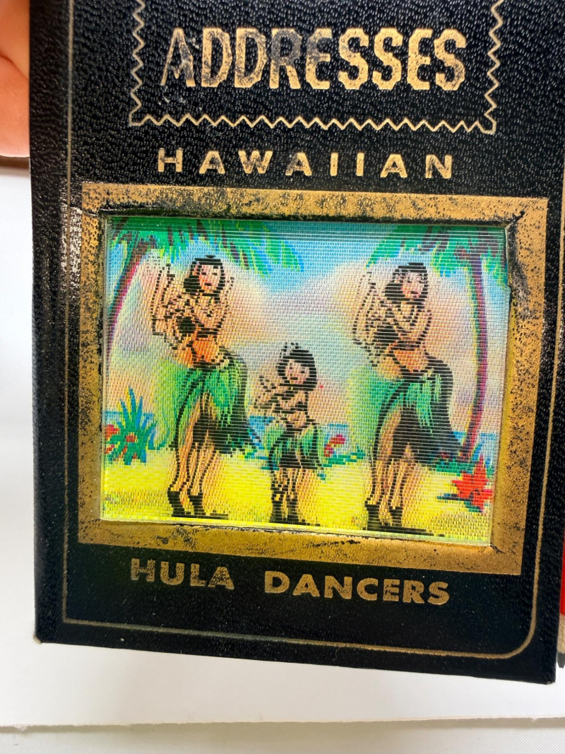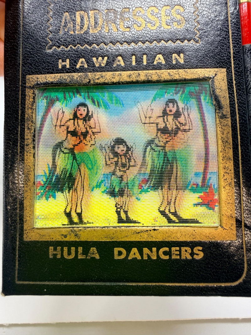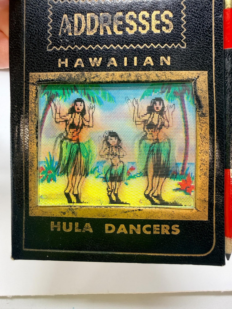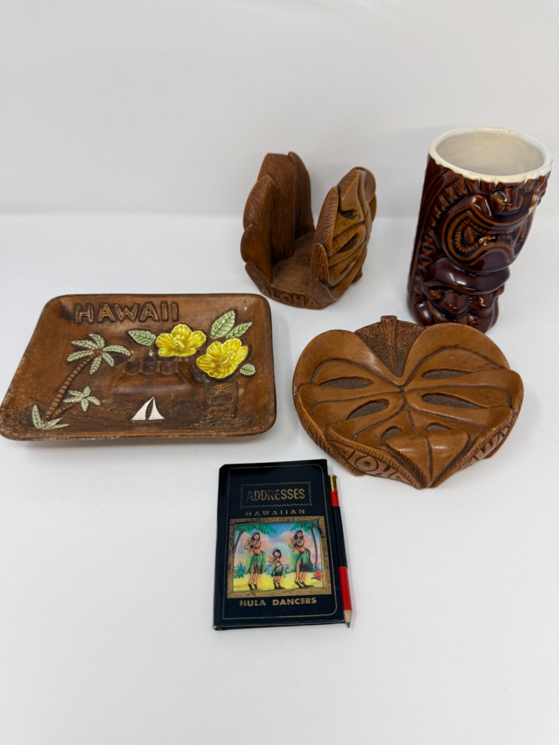 Aloha! Vintage Hawaiian Souveniers Vintage Treasure Craft Hawaii ashtray, featuring a raised ceramic design with hibiscus flowers, palm trees, a sailboat, and a tiki figure. Produced in Kahului, Maui, Hawaii Tiki-style dish crafted from "hapa wood," a synthetic material resembling carved wood, manufactured by Coco Joe's in Hawaii. Intricately carved in the shape of a Monstera leaf with "ALOHA HAWAII" molded into the rim. Designed as a multi-functional piece that can be used as an ashtray, candy dish, nut bowl, or trinket holder. Popular as souvenirs and tiki bar decor during the 1960s and 1970s Vintage Daga Hawaii "Eyeless" Tiki Mug. Features a distinctive "eyeless" or smooth-faced Lono Tiki design. Made of ceramic with a brown glaze finish. Commonly used as drinkware for tropical cocktails or as decorative vases. Approximately 5.5 inches tall. Mini address book with hula dancers that sway when moving the book.
