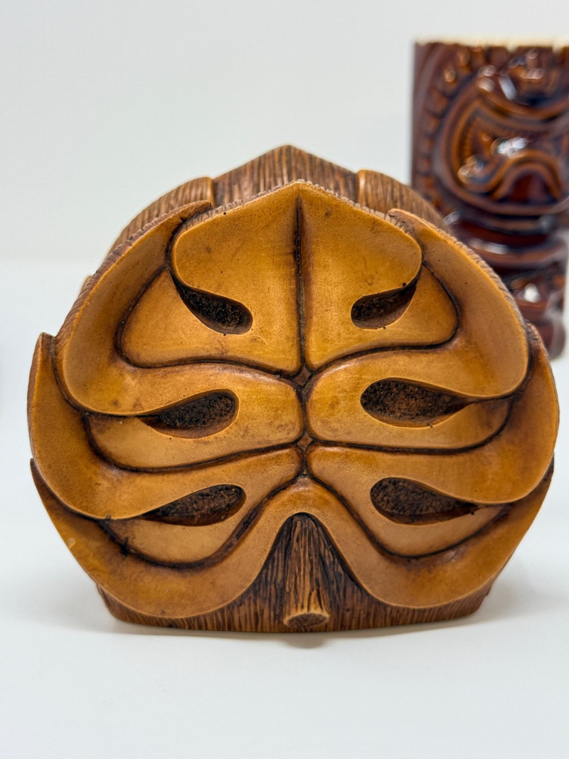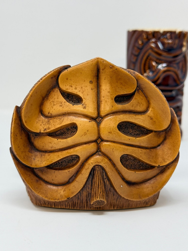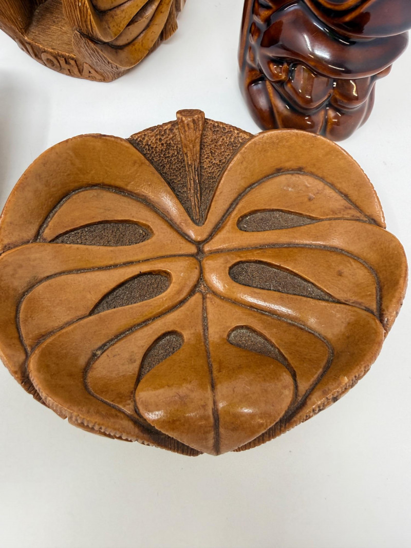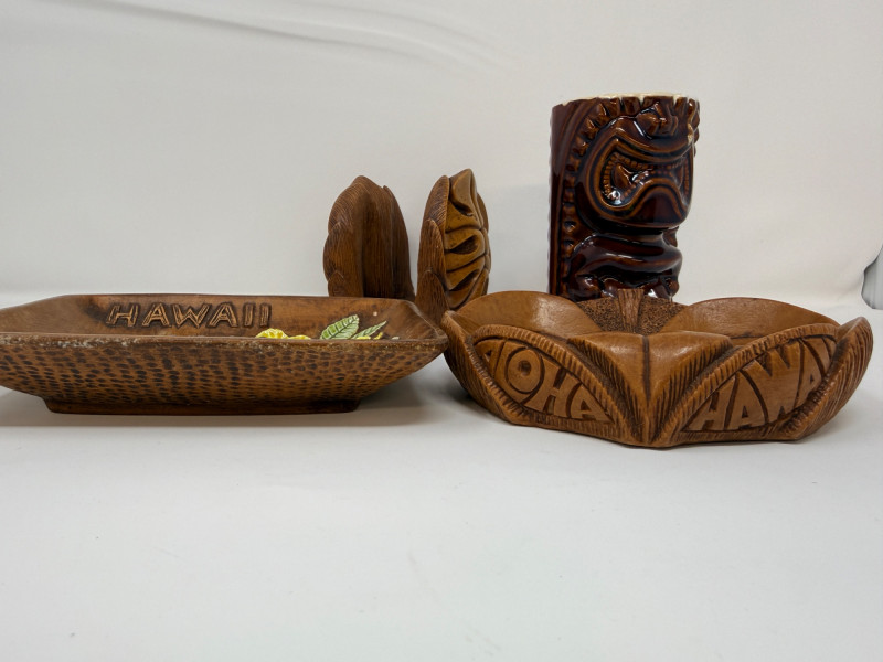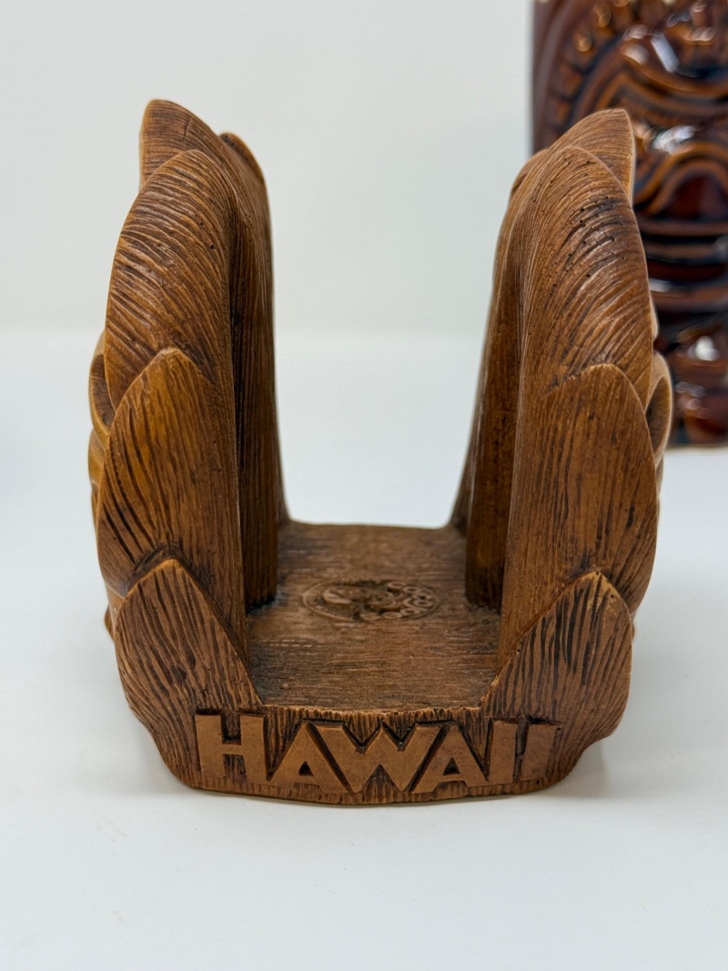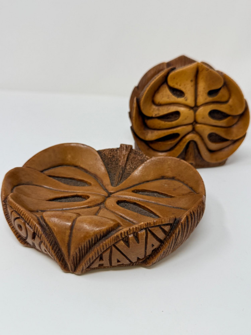 Aloha! Vintage Hawaiian Souveniers Vintage Treasure Craft Hawaii ashtray, featuring a raised ceramic design with hibiscus flowers, palm trees, a sailboat, and a tiki figure. Produced in Kahului, Maui, Hawaii Tiki-style dish crafted from "hapa wood," a synthetic material resembling carved wood, manufactured by Coco Joe's in Hawaii. Intricately carved in the shape of a Monstera leaf with "ALOHA HAWAII" molded into the rim. Designed as a multi-functional piece that can be used as an ashtray, candy dish, nut bowl, or trinket holder. Popular as souvenirs and tiki bar decor during the 1960s and 1970s Vintage Daga Hawaii "Eyeless" Tiki Mug. Features a distinctive "eyeless" or smooth-faced Lono Tiki design. Made of ceramic with a brown glaze finish. Commonly used as drinkware for tropical cocktails or as decorative vases. Approximately 5.5 inches tall. Mini address book with hula dancers that sway when moving the book.
