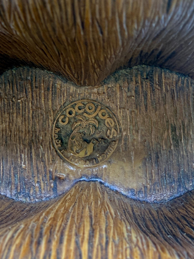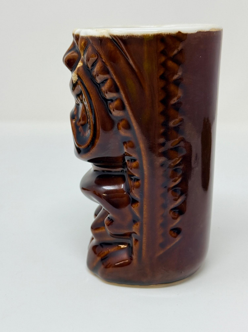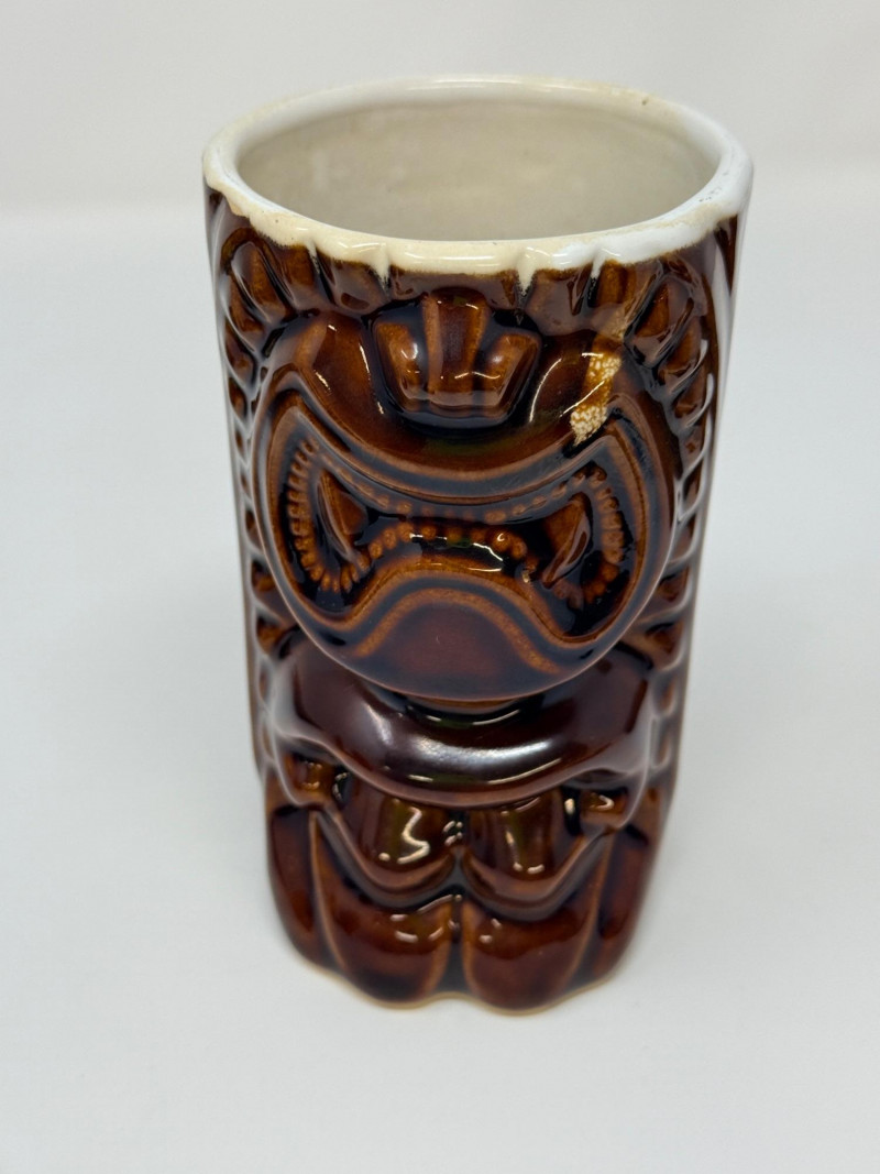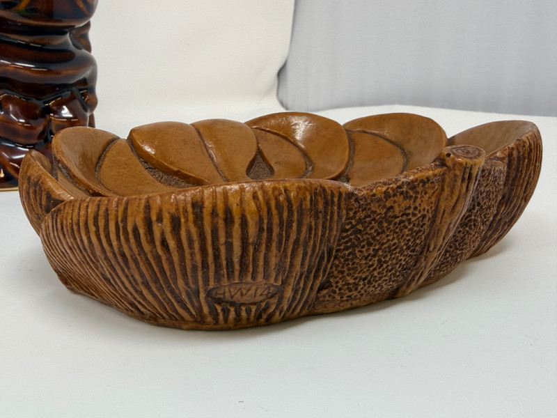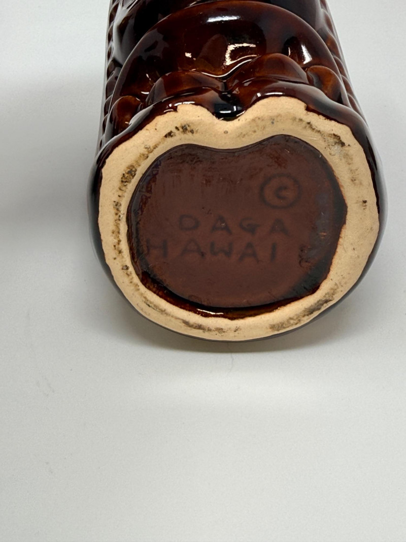 Aloha! Vintage Hawaiian Souveniers Vintage Treasure Craft Hawaii ashtray, featuring a raised ceramic design with hibiscus flowers, palm trees, a sailboat, and a tiki figure. Produced in Kahului, Maui, Hawaii Tiki-style dish crafted from "hapa wood," a synthetic material resembling carved wood, manufactured by Coco Joe's in Hawaii. Intricately carved in the shape of a Monstera leaf with "ALOHA HAWAII" molded into the rim. Designed as a multi-functional piece that can be used as an ashtray, candy dish, nut bowl, or trinket holder. Popular as souvenirs and tiki bar decor during the 1960s and 1970s Vintage Daga Hawaii "Eyeless" Tiki Mug. Features a distinctive "eyeless" or smooth-faced Lono Tiki design. Made of ceramic with a brown glaze finish. Commonly used as drinkware for tropical cocktails or as decorative vases. Approximately 5.5 inches tall. Mini address book with hula dancers that sway when moving the book.