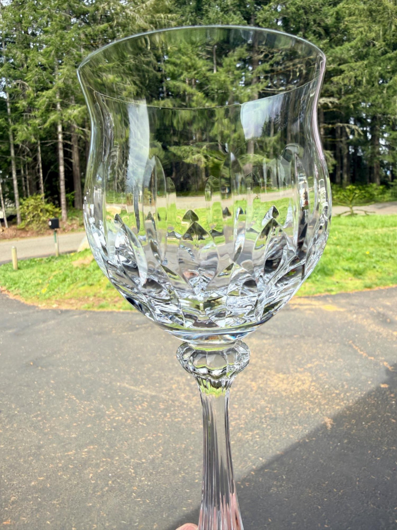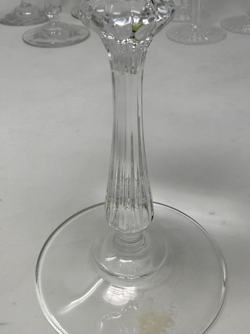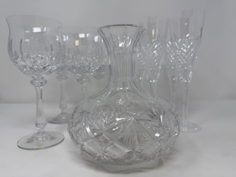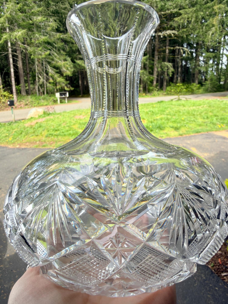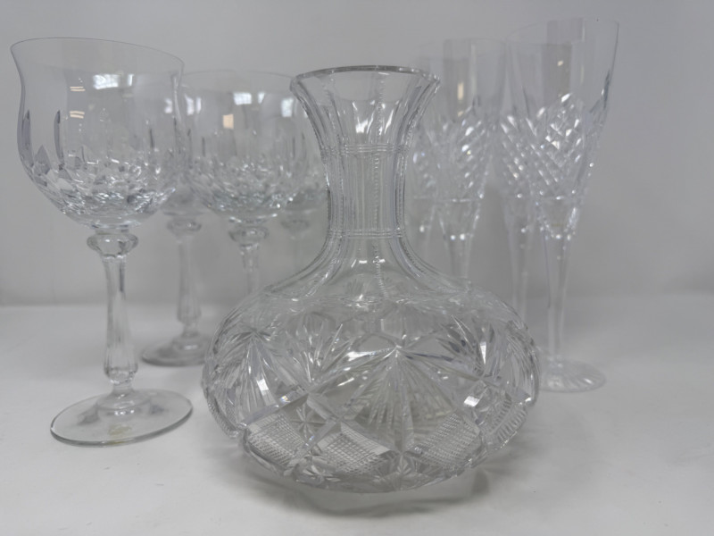 Antique American Brilliant Decanter & Stem Sets Intricate geometric and floral hand-cut patterns. Origin: United States. Historically used as a decorative vessel for serving wine or water 2 sets of 4 Crystal Stemware
