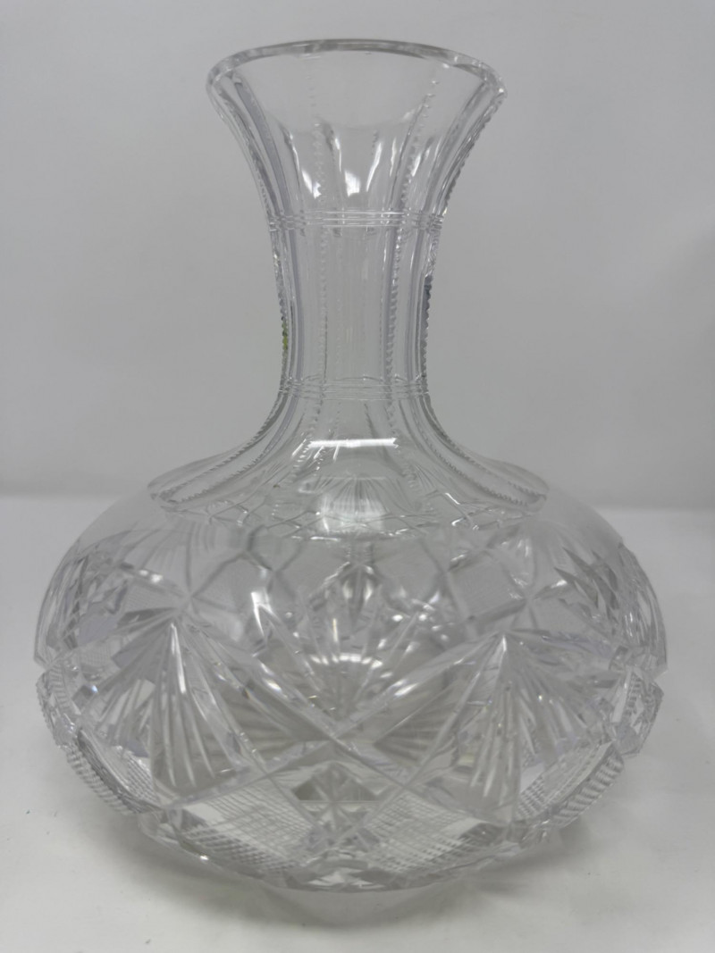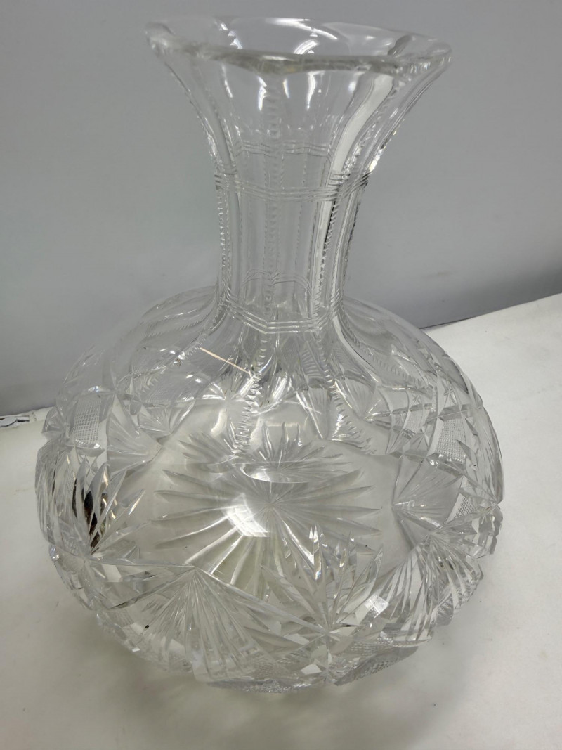 Antique American Brilliant Period (circa 1876-1916) cut crystal carafe or decanter, featuring intricate patterns like pinwheels, stars, and zippered necks.