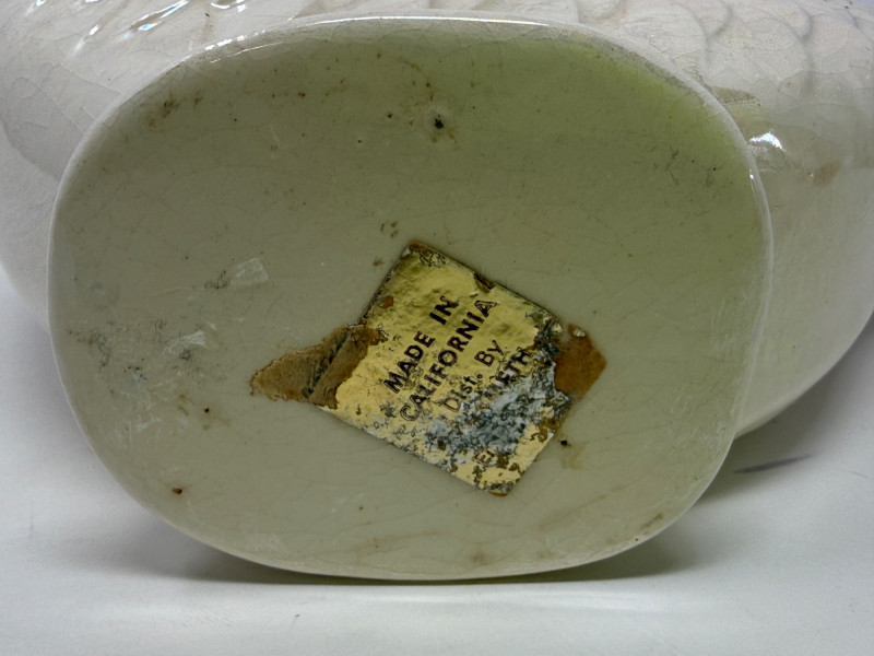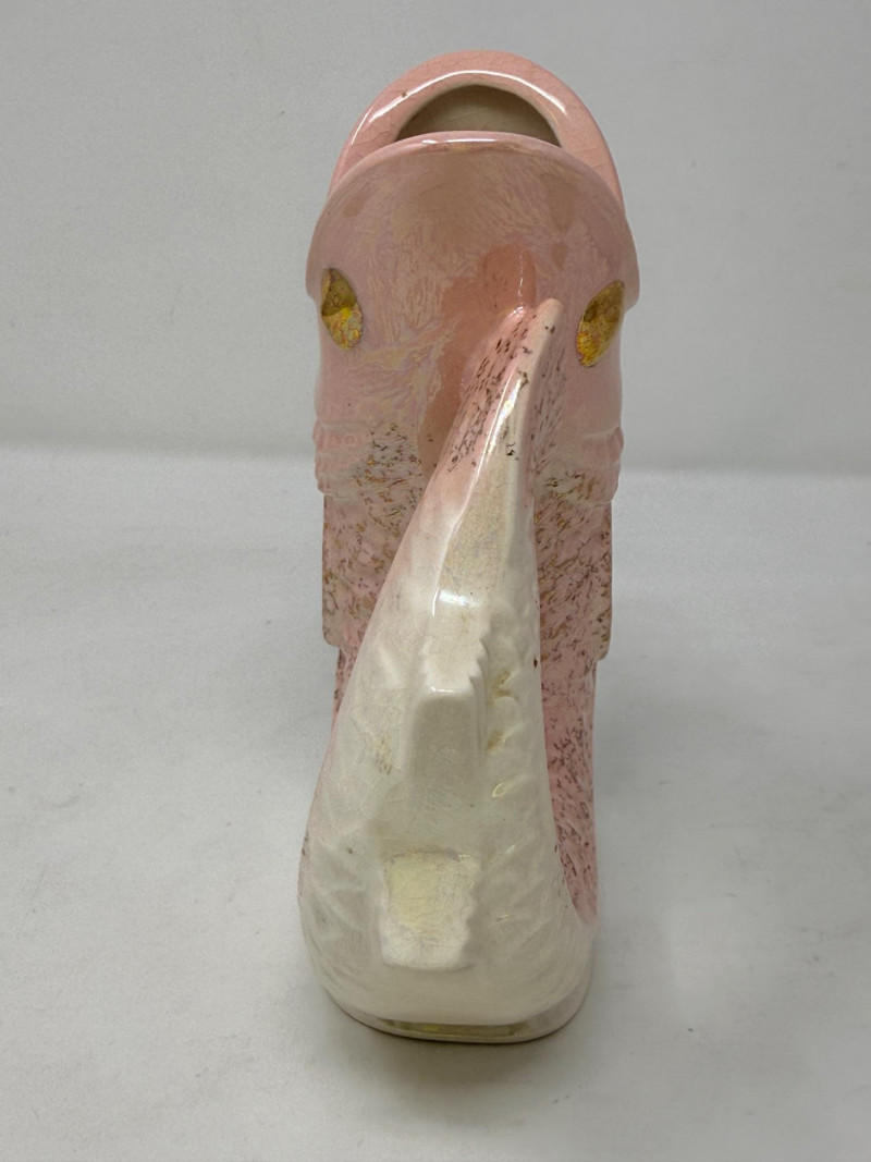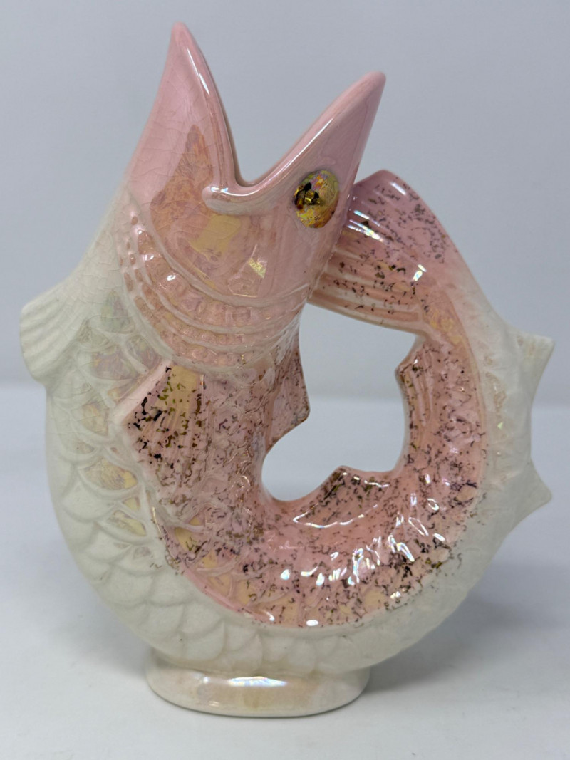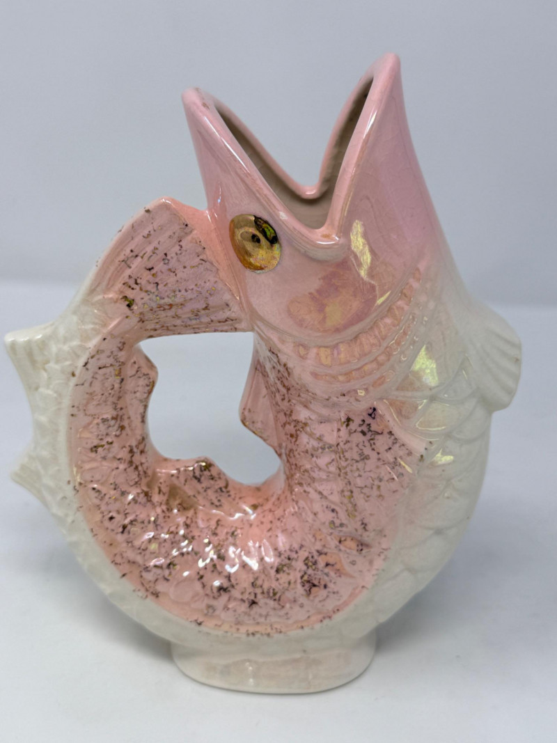 Vintage pink and white ceramic fish pitcher or "Gluggle Jug" The jug is shaped like a fish, with the mouth acting as a spout and the tail forming the handle. It is designed to produce a "glug-glug" sound when pouring liquid, originally created to be functional water pitchers