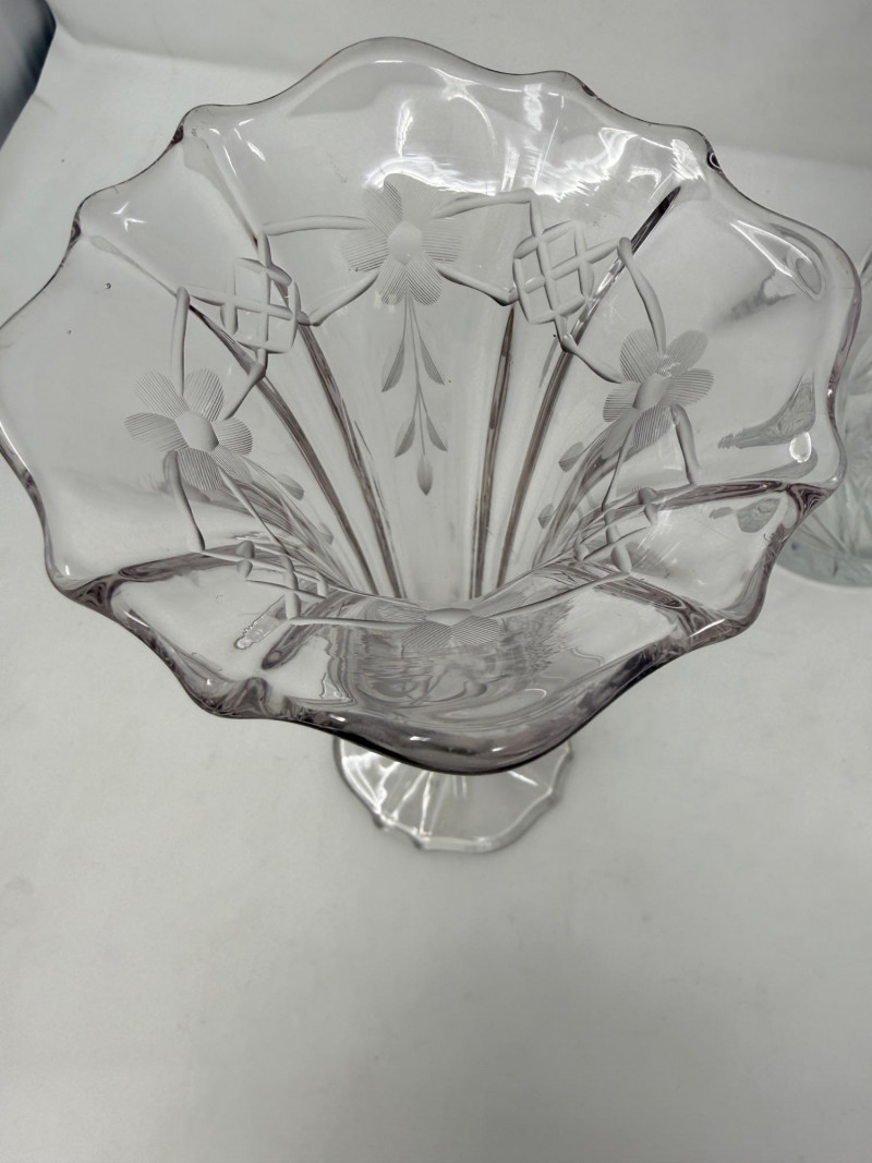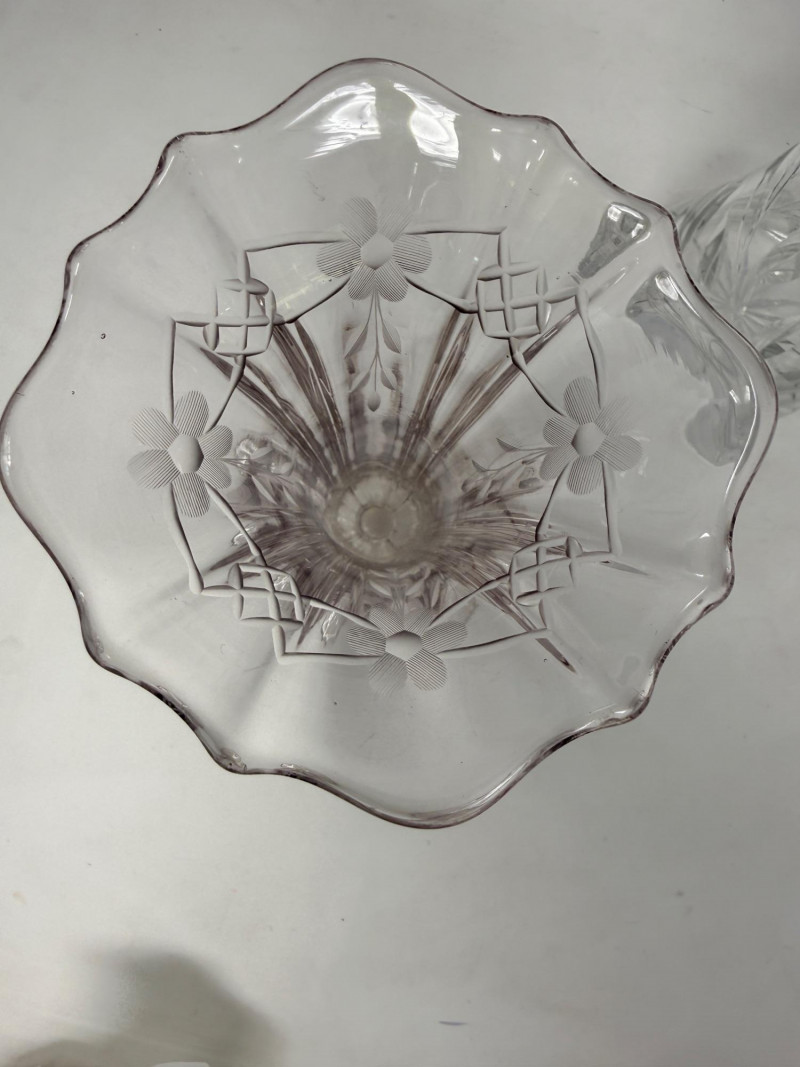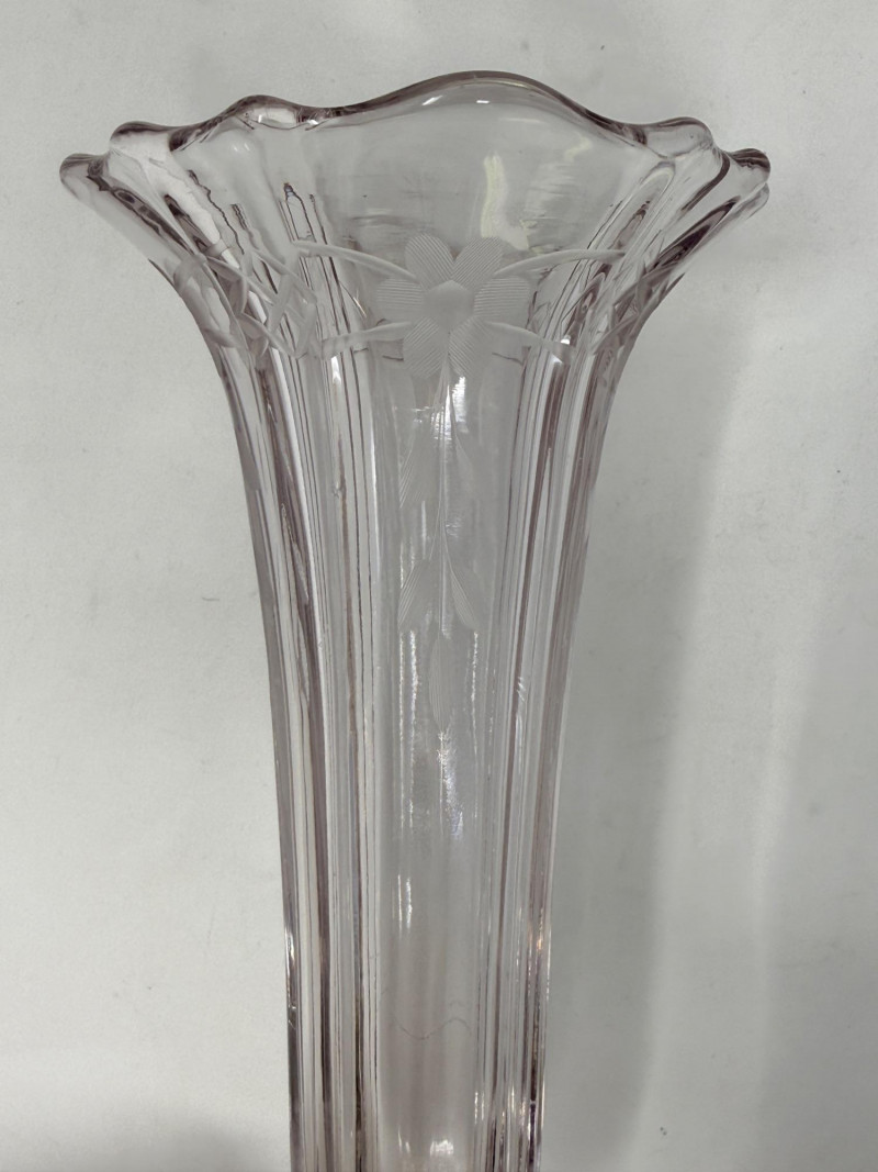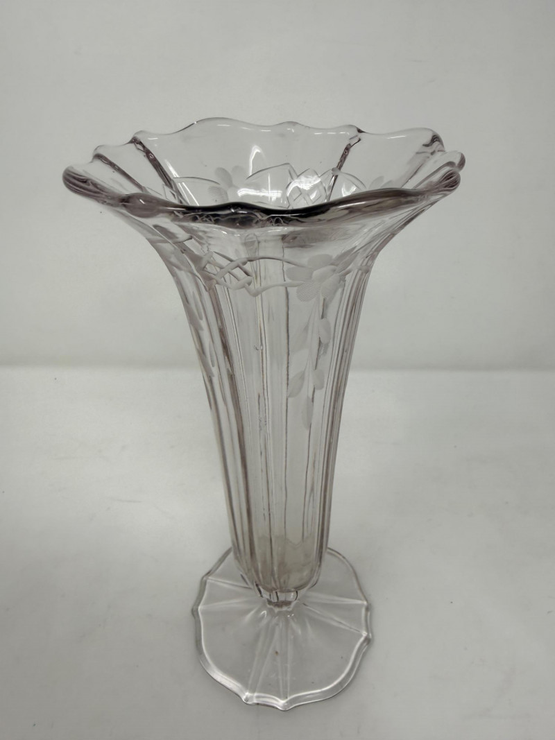 vintage crystal or glass vase, likely manufactured between the 1920s and 1940s, featuring a flared, scalloped rim and often found with etched floral designs. Design: The vase typically has a fluted or molded base with a radial pattern and a trumpet-shaped body. Style: Often categorized as Art Deco or classical crystal glass