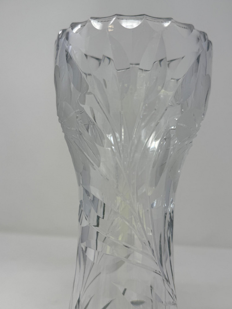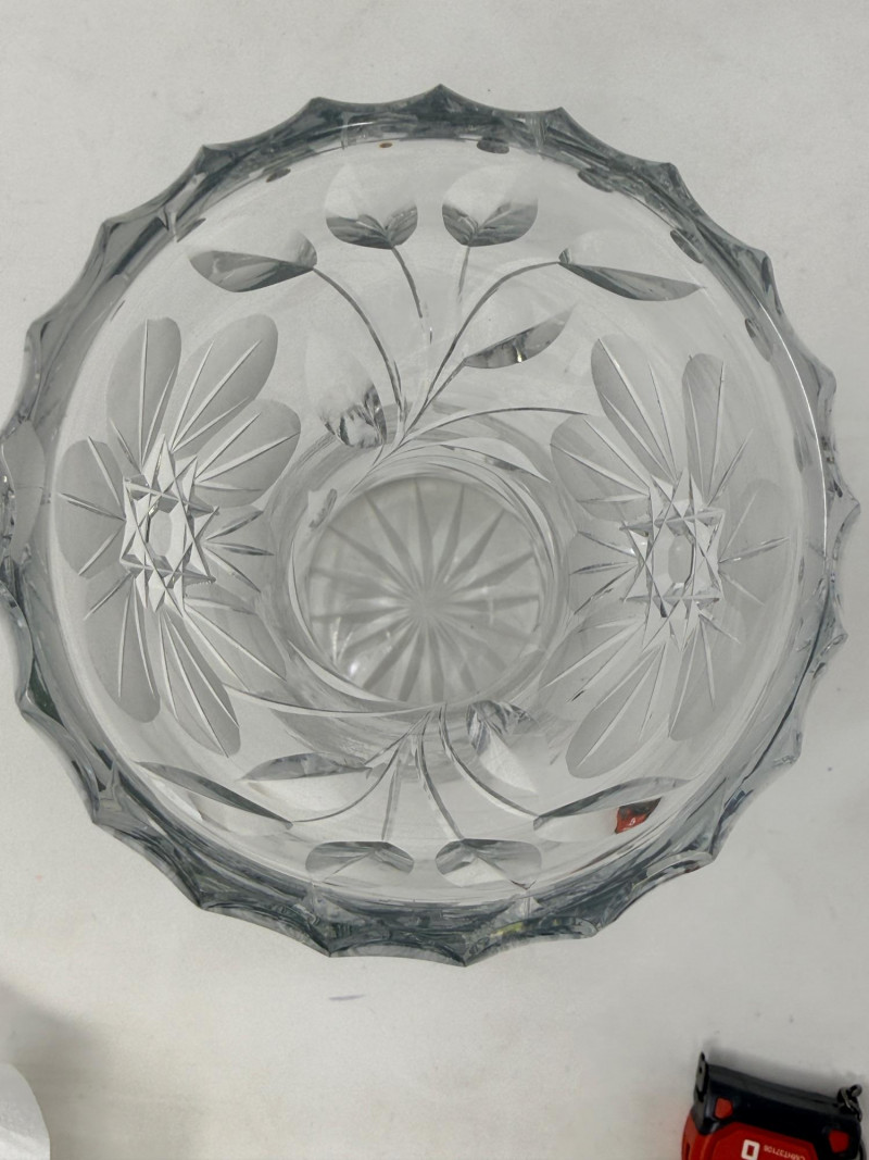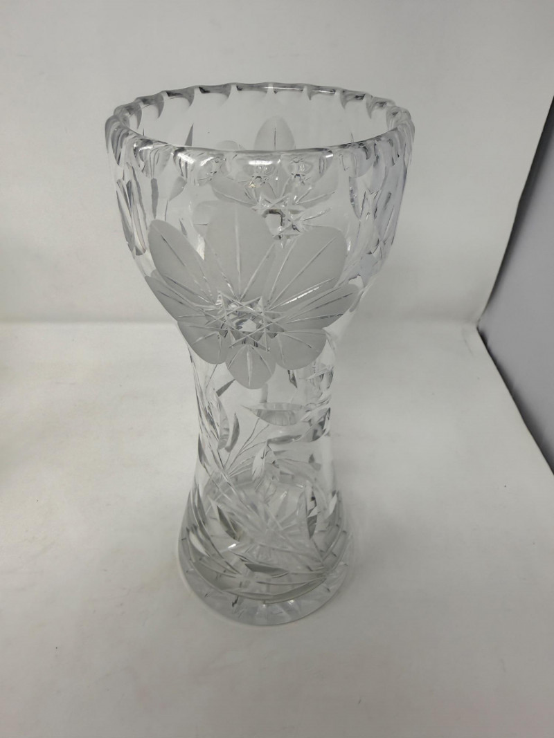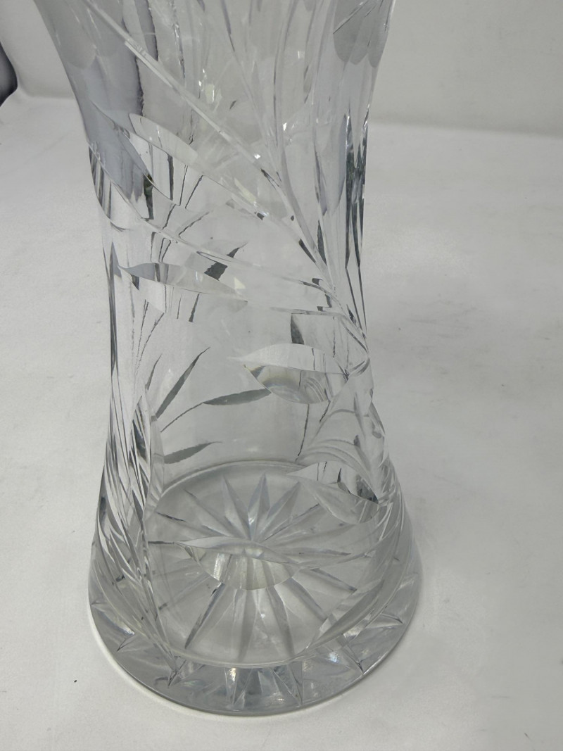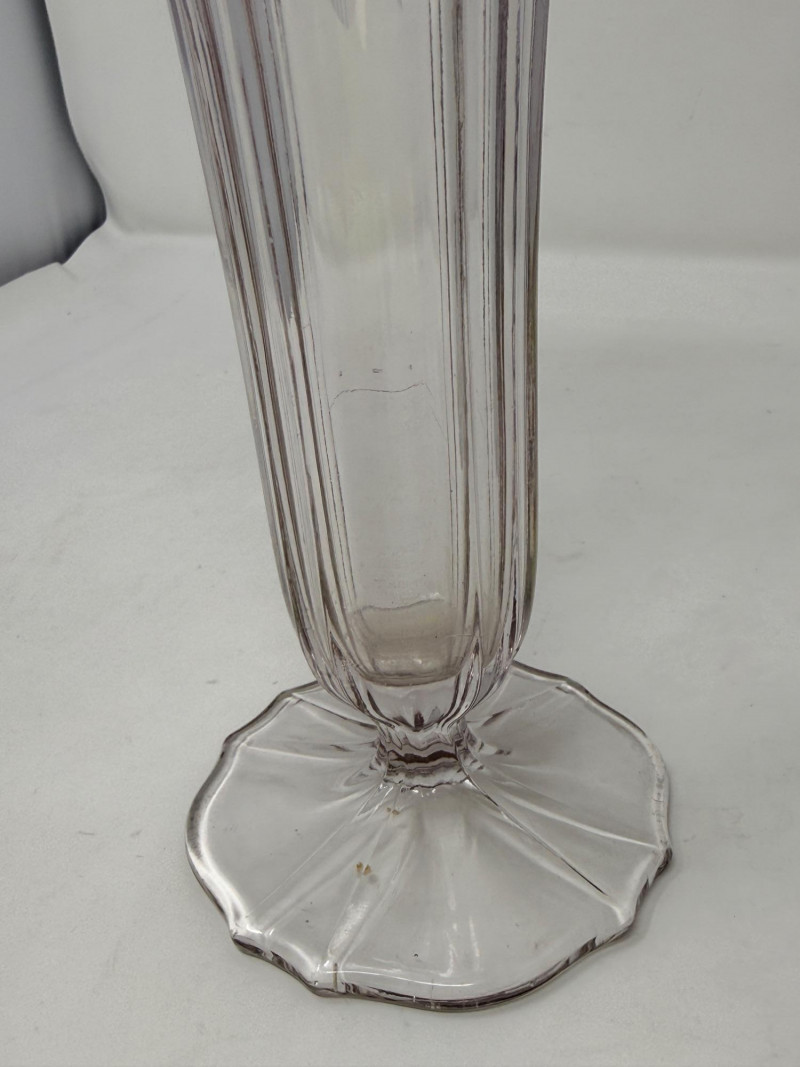 vintage crystal or glass vase, likely manufactured between the 1920s and 1940s, featuring a flared, scalloped rim and often found with etched floral designs. Design: The vase typically has a fluted or molded base with a radial pattern and a trumpet-shaped body. Style: Often categorized as Art Deco or classical crystal glass