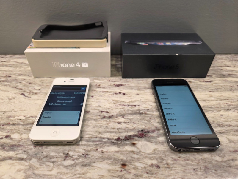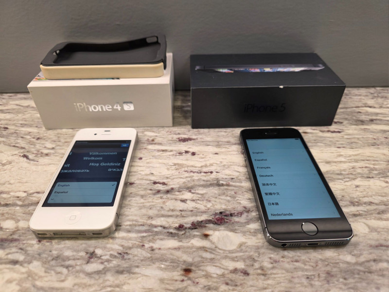 Apple iPhone 4s & iPhone 5s With Original Boxes Apple iPhone 4s, model number A1387 Released in 2011 "World Phone" that supports both GSM and CDMA cellular networks Display: 3.5-inch Retina display with 960x640 resolution Processor: Dual-core Apple A5 chip Camera: 8MP rear camera capable of 1080p HD video recording; 0.3MP (VGA) front camera Storage: Originally available in 16GB, 32GB, and 64GB capacities, with an 8GB version released later Connectivity: Features a 30-pin dock connector (pre-Lightning), Bluetooth 4.0, and 802.11b/g/n Wi-Fi (2.4GHz only) Software: Shipped with iOS 5 and is upgradable to iOS 9.3.6 Apple iPhone 5s, model number A1533. Released in 2013 "North American" variant that supports both GSM and CDMA networks Touch ID: It was the first iPhone to feature a fingerprint sensor integrated into the sapphire crystal Home button 64-bit Architecture: It featured the A7 chip, making it the first smartphone with a 64-bit desktop-class processor Retina Display: A 4-inch (diagonal) widescreen display with a resolution of 1136x640 at 326 ppi Camera: An 8-megapixel iSight camera with a "True Tone" dual-LED flash and 1080p HD video recording Software Support: Originally shipped with iOS 7 and can be updated to a maximum of iOS 12.5.7 Both iPhone look to be in nice condition (see pics) Both include original boxes and the iPhone 4s includes a power cable Both iPhone had all data erased and now boot to the initial "choose your language" screen Both Tested - Both Work!
