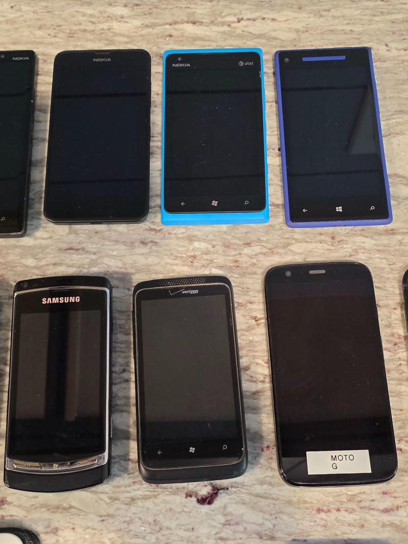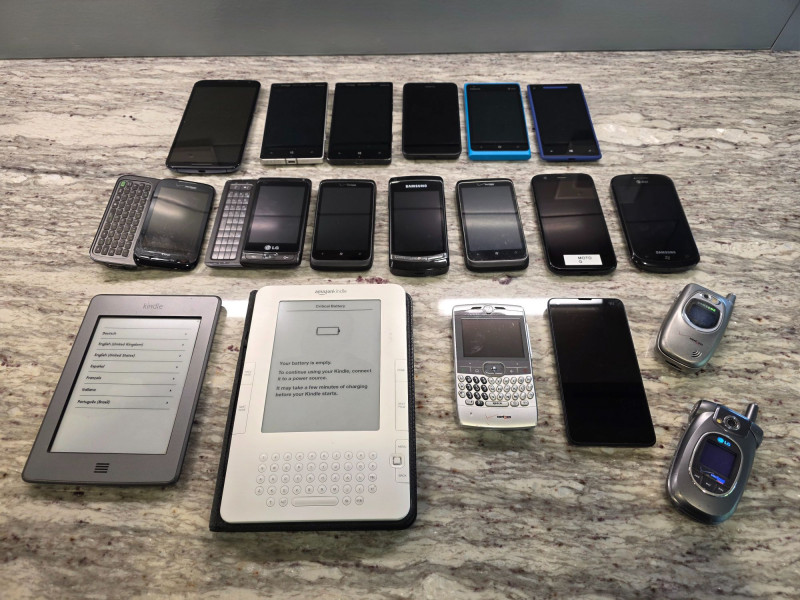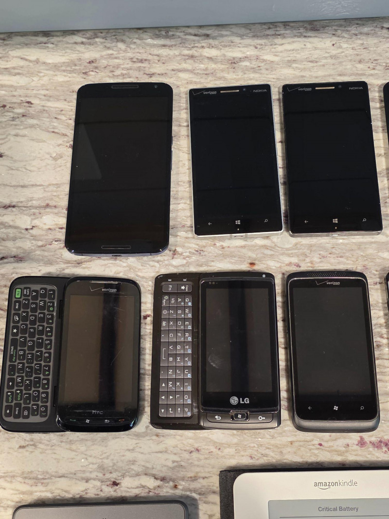Huge Lot Of Old Cell Phones & Kindles! Microsoft, Nokia, Samsung, LG, HTC, Motorola and more! Phones & Kindles only, no cables included (some of the cell phones use older style USB cables that I didn't have) Some tested briefly when powered on, some didn't seem to take a charge The gray Kindle has been erased and reset The white Kindle has an empty battery, didn't take a charge 19 devices in all!