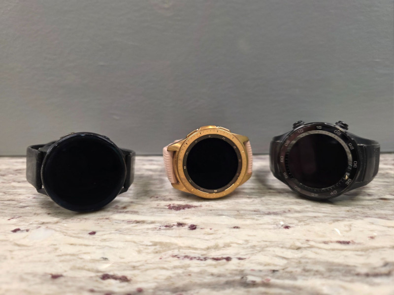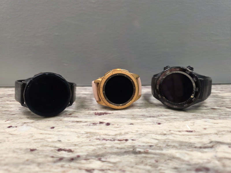 (3) Smartwatches - Samsung & Huawei (1) Samsung Galaxy Watch Active2 Model Number: SM-R820 Black case with rubber strap 44mm Aluminum Rated for 5 ATM water resistance (up to 50 meters) Includes GPS, heart rate monitoring, and Bluetooth connectivity Originally ran on the Tizen operating system (1) Samsung Galaxy Watch in Rose Gold Model Number SM-R810 Rose Gold case with pink silicone strap 42mm Stainless Steel In Rose Gold Features a circular face with a rotating bezel and was released with both Bluetooth and LTE connectivity options. The watch uses a 42mm AMOLED screen. The watch is designed with military-grade durability and water resistance. (1) Huawei Watch 2 Black case with rubber strap Features: Heart rate monitoring, built-in GPS, and Android Wear 2.0 operating system Components: Rear battery cover with magnetic charging pins and sensors Includes charger All Untested!