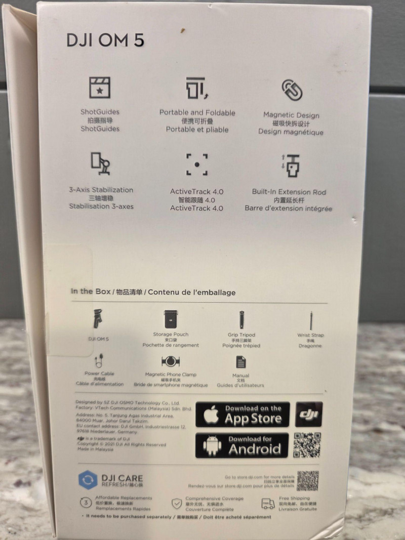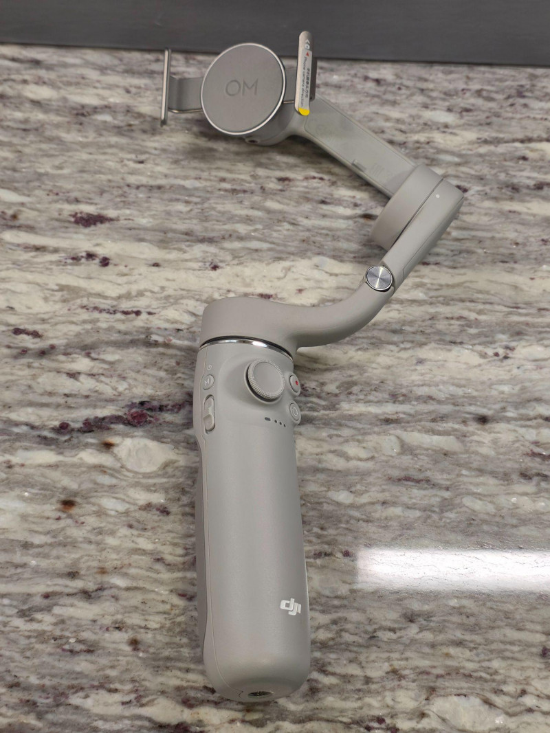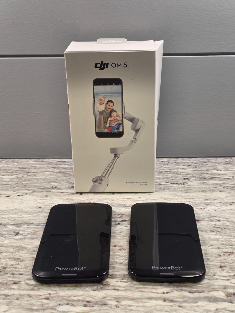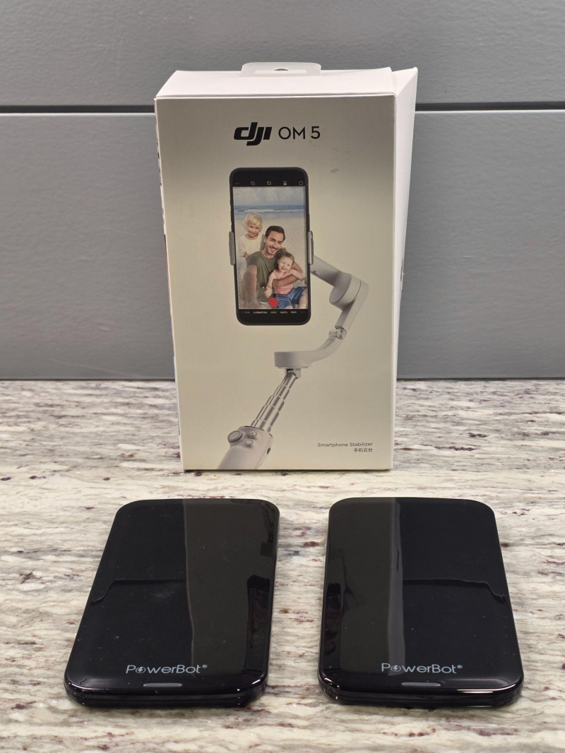 DJI OM 5 Smartphone Gimbal Stabilizer & (2) PowerBot Wireless Chargers (1) DJI OM 5 Smartphone Gimbal Stabilizer Features a foldable, lightweight design for portability Includes a built-in extension rod for selfies and low-angle filming Utilizes a magnetic quick-release clamp for easy smartphone attachment Provides 3-axis motorized stabilization for smooth video recording Nearly new in box, appears complete! Untested! (2) PowerBot Wireless Chargers - PB1021 Portable induction power bank that offers both wired and wireless charging capabilities Features a 5000mAh capacity and supports Qi-enabled devices Supports both wired charging via USB cable and wireless charging for Qi-compatible smartphones Input: 5V / 1.5A via a Micro-USB port, using a 2.1A AC adapter is recommended Output: 5V / 1A maximum for wireless charging Portability: Slim "hockey puck" form factor designed for easy travel Tested - Works!