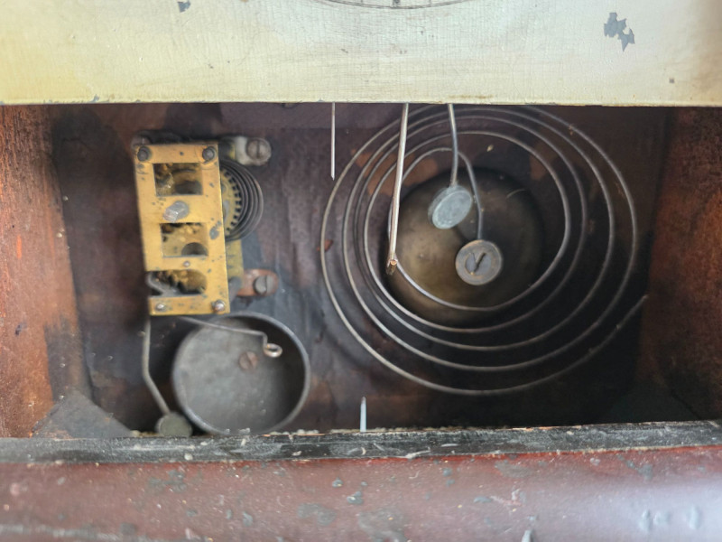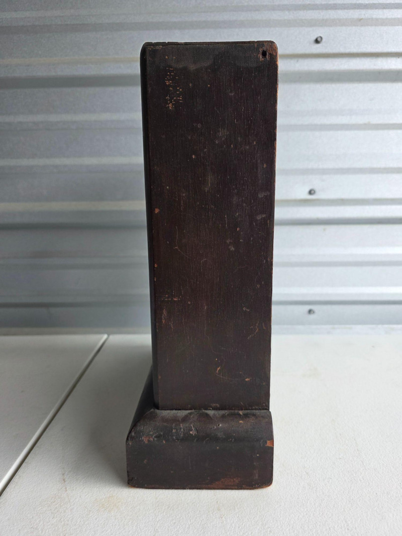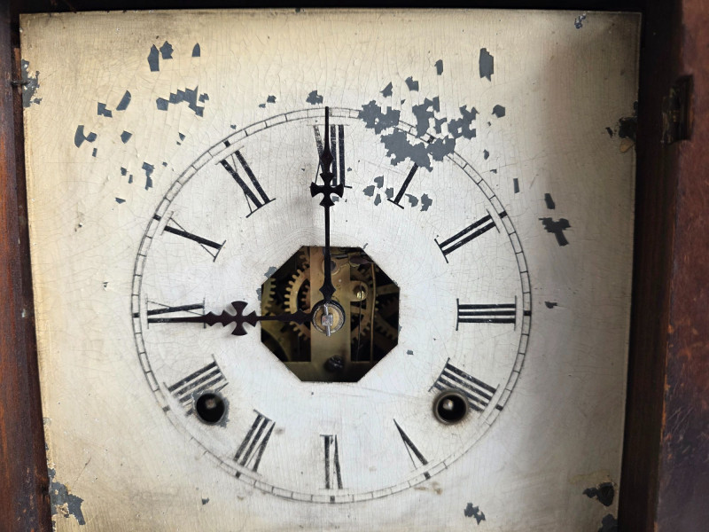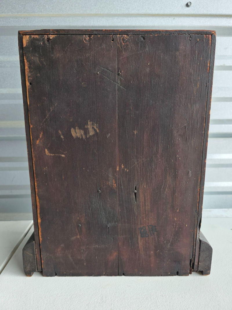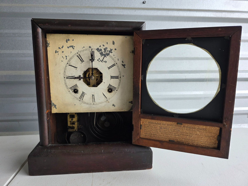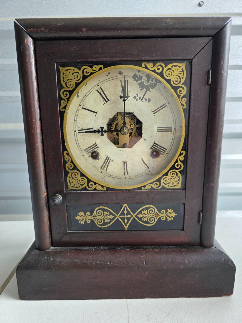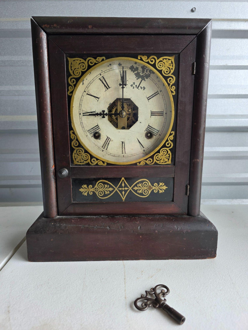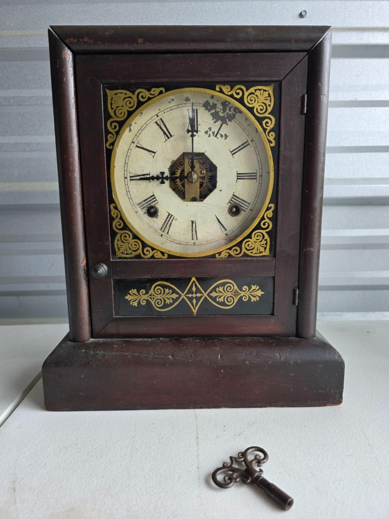 Antique Jerome & Company Shelf Clock & Key This cottage-style mantel clock features a compact wooden cases with decorative gold-colored accents Clocks with this specific label and style were commonly manufactured between the 1870s and 1880s While Chauncey Jerome was a legendary innovator who pioneered mass-produced brass clock movements, the "Jerome & Co." name was primarily a trade name used by the New Haven Clock Company after Jerome's company went bankrupt in 1856 New Haven Clock Co. used the Jerome name because it was highly recognized and respected, particularly in international markets These clocks typically contain a 30-hour spring-driven movement, often supplied by Noah Pomeroy or manufactured directly by New Haven The clock shows a classic painted dial with Roman numerals and a decorative glass panel (tablet) at the bottom The accompanying key is essential for winding the movement Includes key (pendulum not included) Untested! 13"T x 10.75"W x 4.5"D