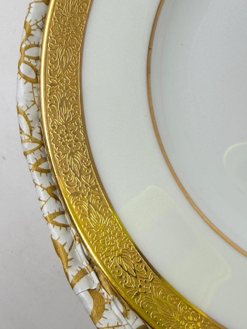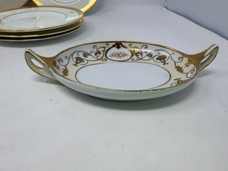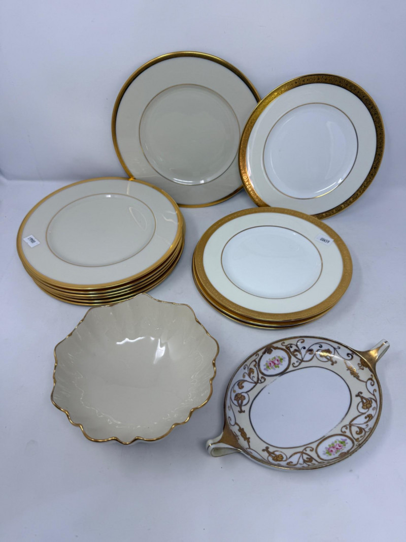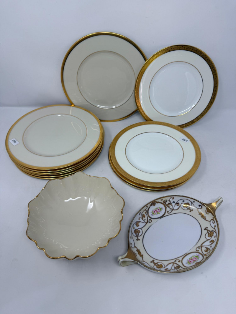 Minton - Lenox - Nippon Gold Rim Plates and Dishes (4) Minton gold rim plates 7.75” (4) Minton gold rim small plates 6.25” (6) Minton gold rim saucers (8) cups Nippon double handle dish 8.5”x5” Lenox scalloped edge bowl 6”x2.25”
