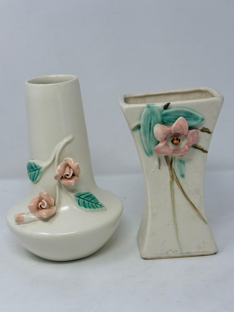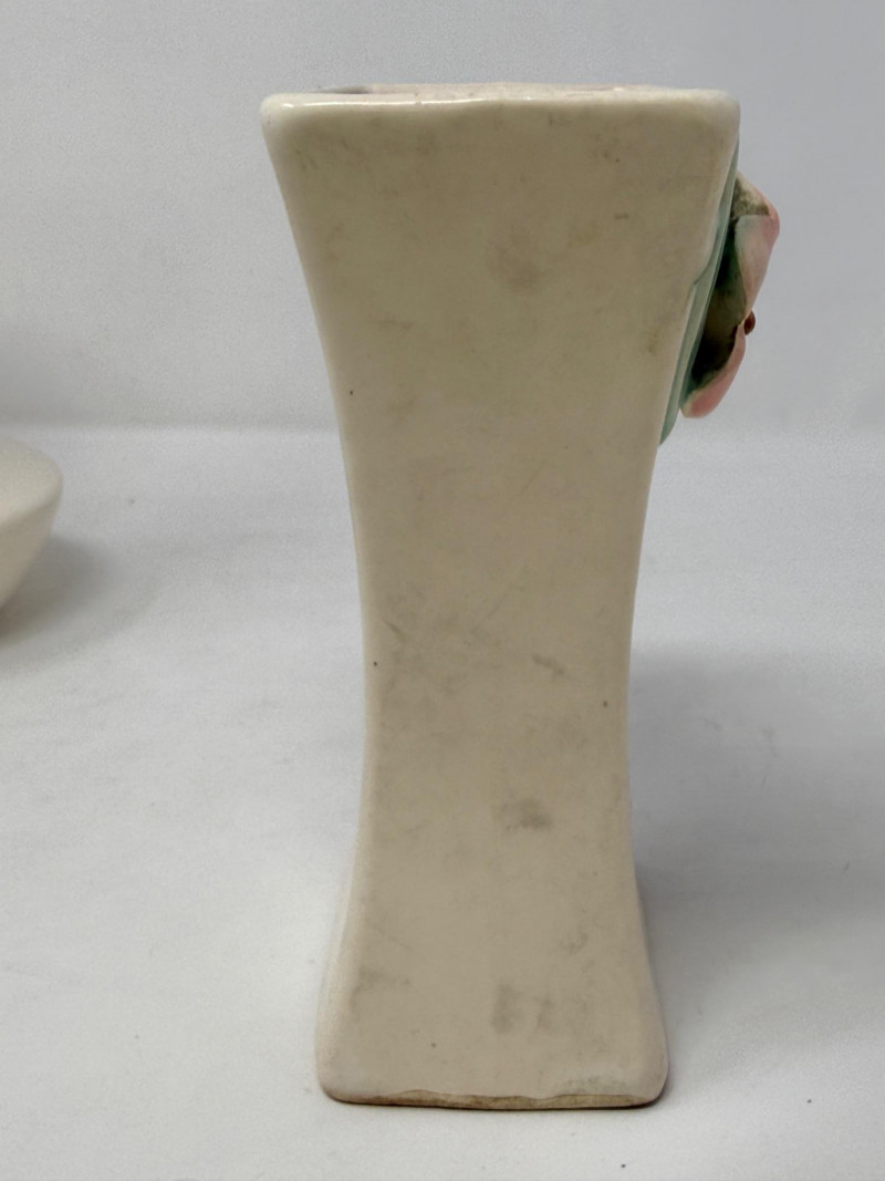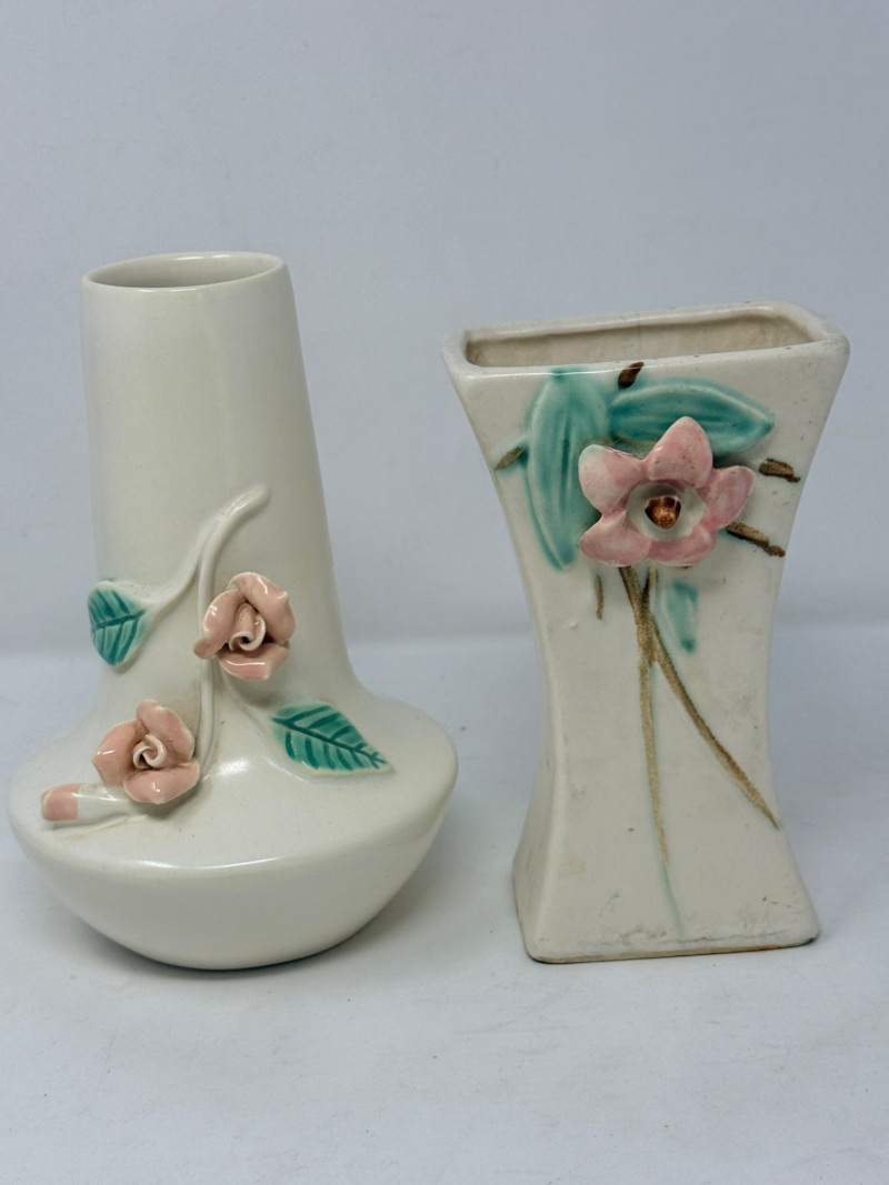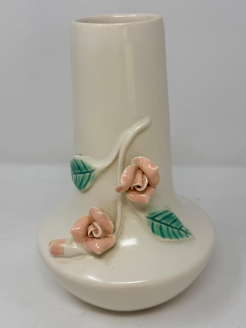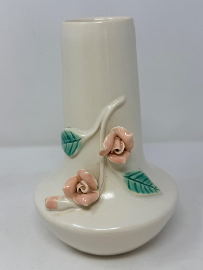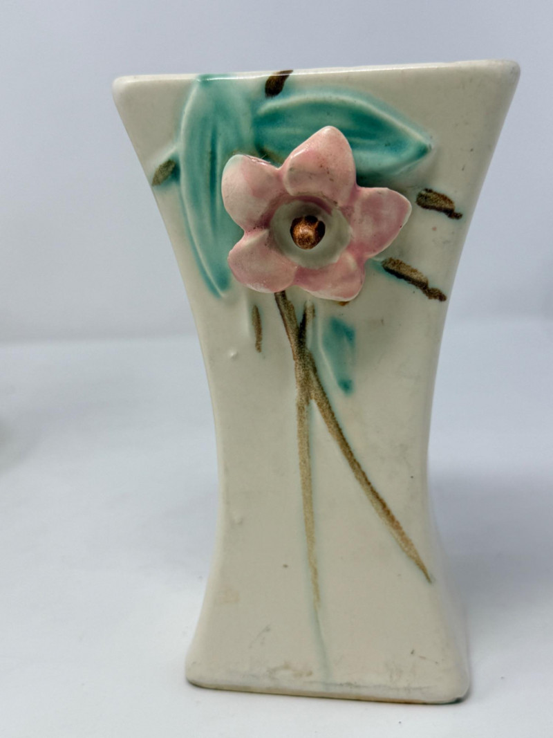 Vintage Caliente and McCoy Pottery Vases Features a creamy ivory matte glaze with a dimensional, hand-painted pastel pink flower and green leaves. Made by the Nelson McCoy Pottery Company in the USA 4”x3”x6.5” Features an applied, three-dimensional pink rose and green leaf design against a cream-colored ceramic body. 567 USA on the bottom. 7.5 inches tall.