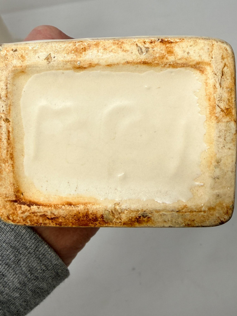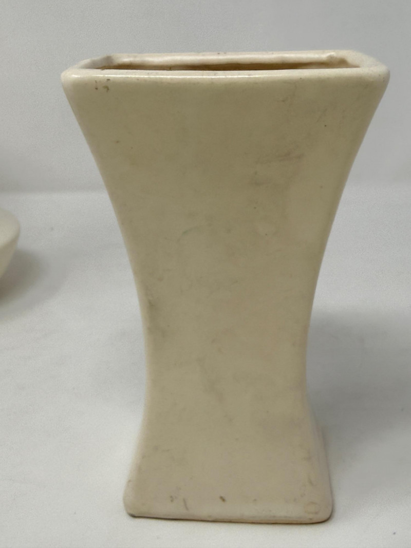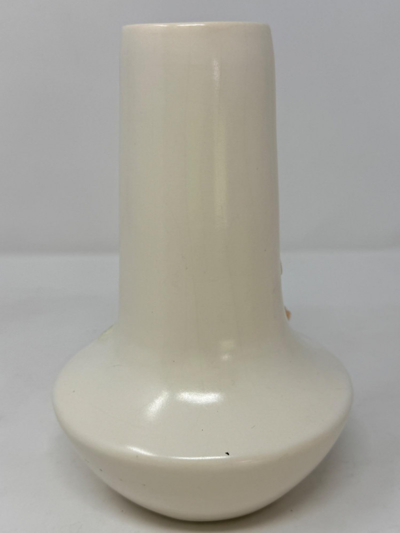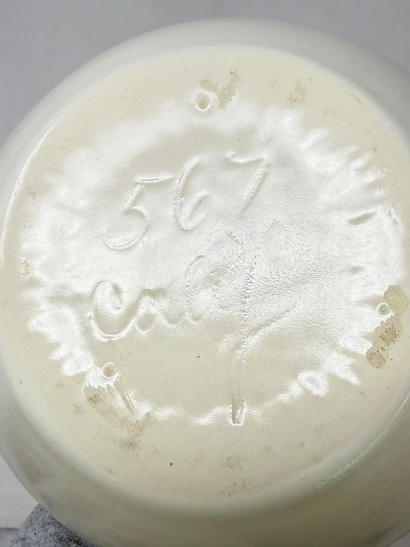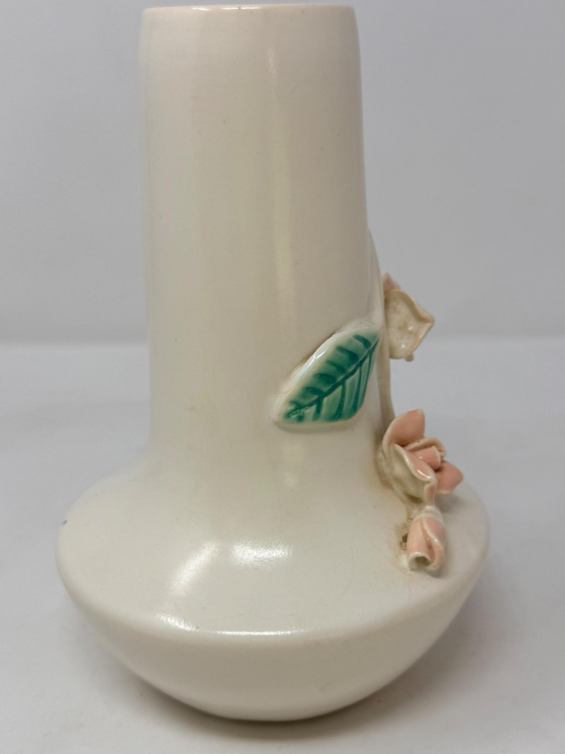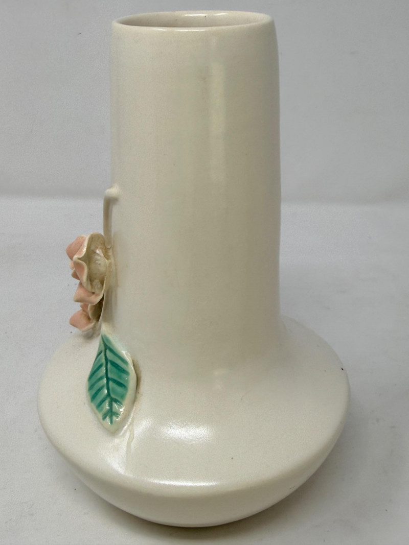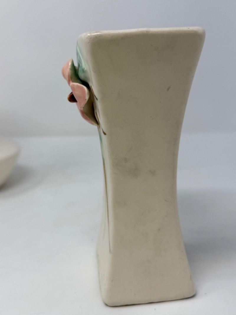 Vintage Caliente and McCoy Pottery Vases Features a creamy ivory matte glaze with a dimensional, hand-painted pastel pink flower and green leaves. Made by the Nelson McCoy Pottery Company in the USA 4”x3”x6.5” Features an applied, three-dimensional pink rose and green leaf design against a cream-colored ceramic body. 567 USA on the bottom. 7.5 inches tall.