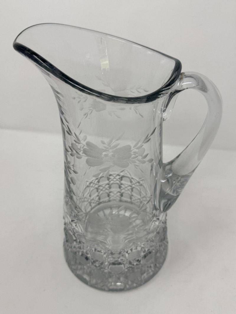 Vintage American Brilliant Period cut crystal water pitcher. Material: Heavy, clear lead crystal glass. Design: Features intricate hand-cut diamond patterns on the base and delicate etched floral designs on the body. 11” tall Decanter is 11” (3) Thick wall shot glasses (4) Delicate cordials