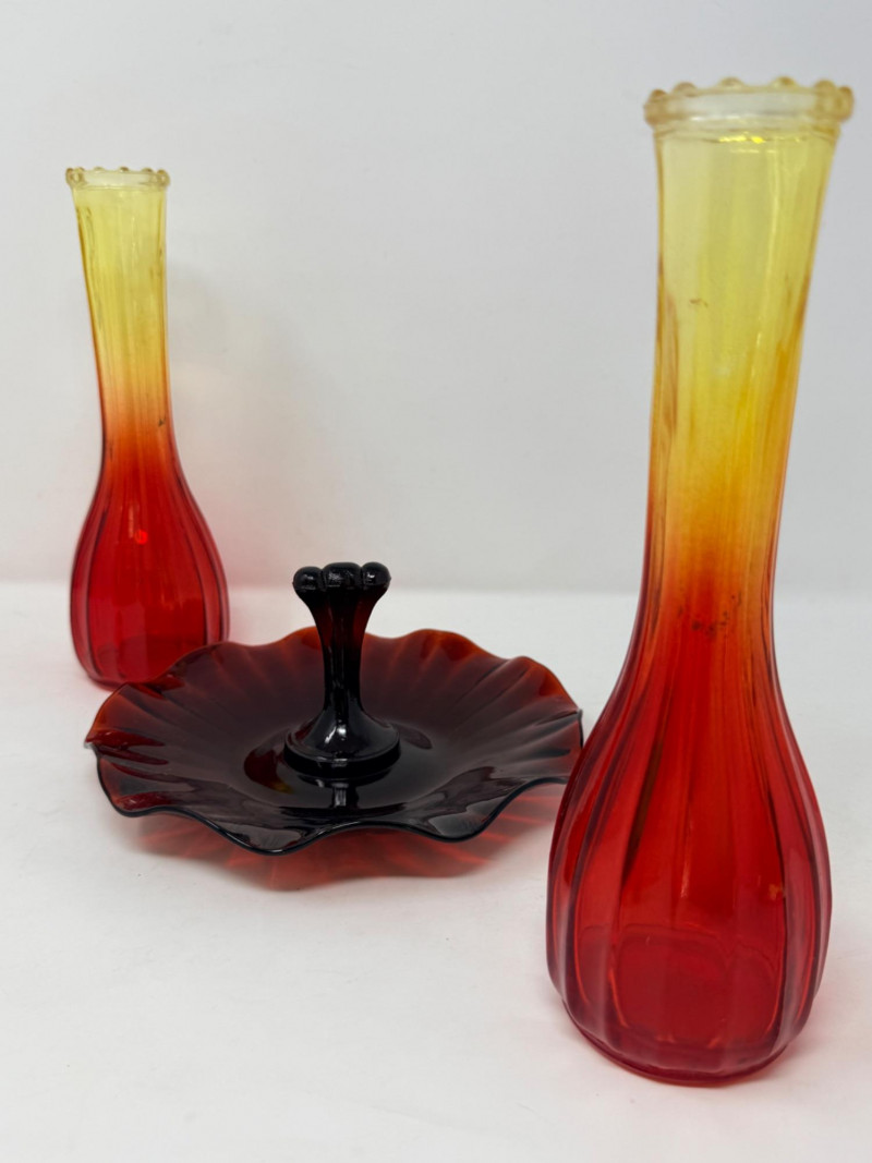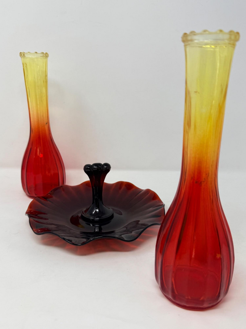 (2) Jeannette Amberina Vases - Ruby Red Anchor Hocking Tidbit Tray