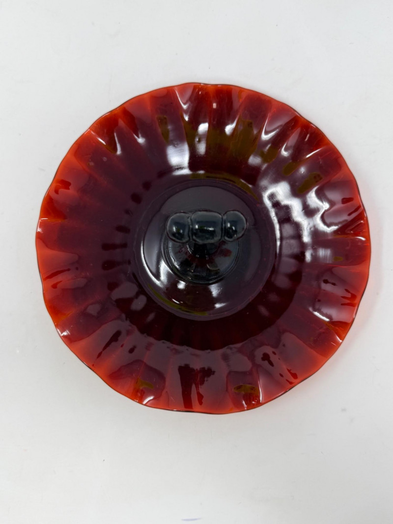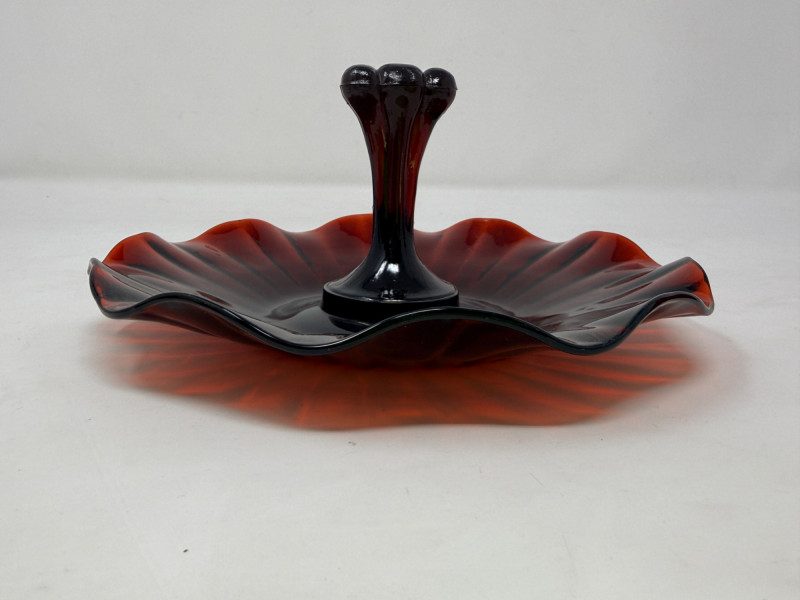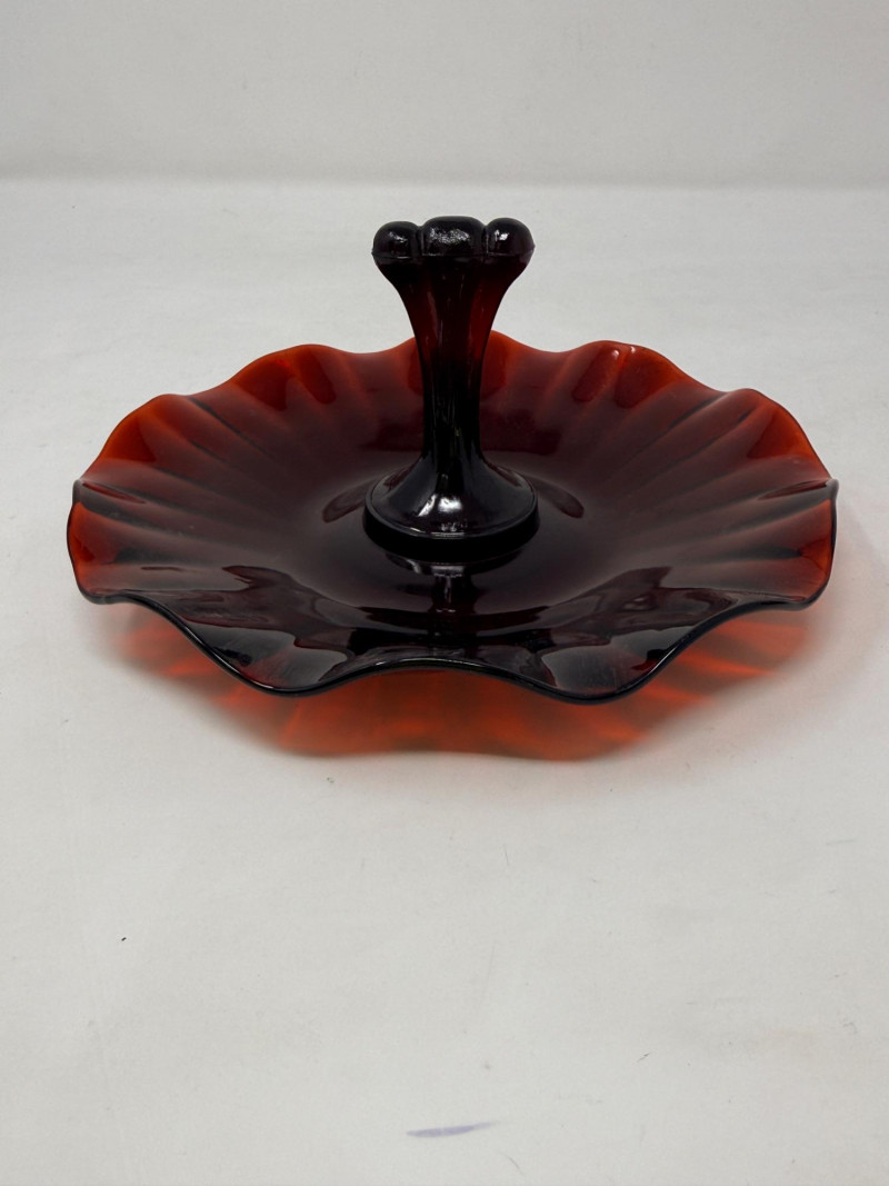 vintage Anchor Hocking Royal Ruby tidbit tray or serving dish. Manufacturer: Anchor Hocking. Pattern/Color: Royal Ruby Red. Features: Ruffled edge and a central art deco style handle. Dimensions: Approximately 7 1/4 inches in diameter