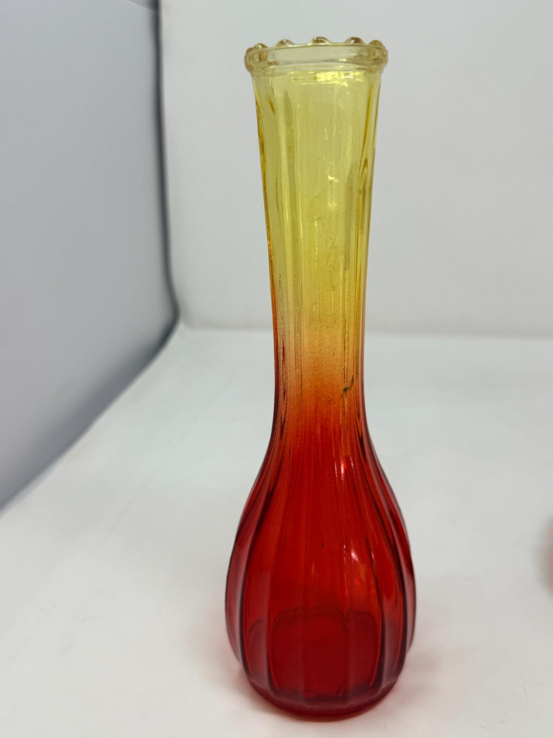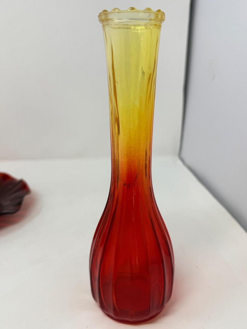 a vintage Jeannette Glass Amberina bud vase, featuring a distinctive color gradient that transitions from red at the base to yellow at the top. Brand: Jeannette Glass Company. Pattern/Style: Amberina (red-to-yellow gradient) with vertical ribbing. Height: Approximately 8.75 inches tall. Features: Scalloped rim.