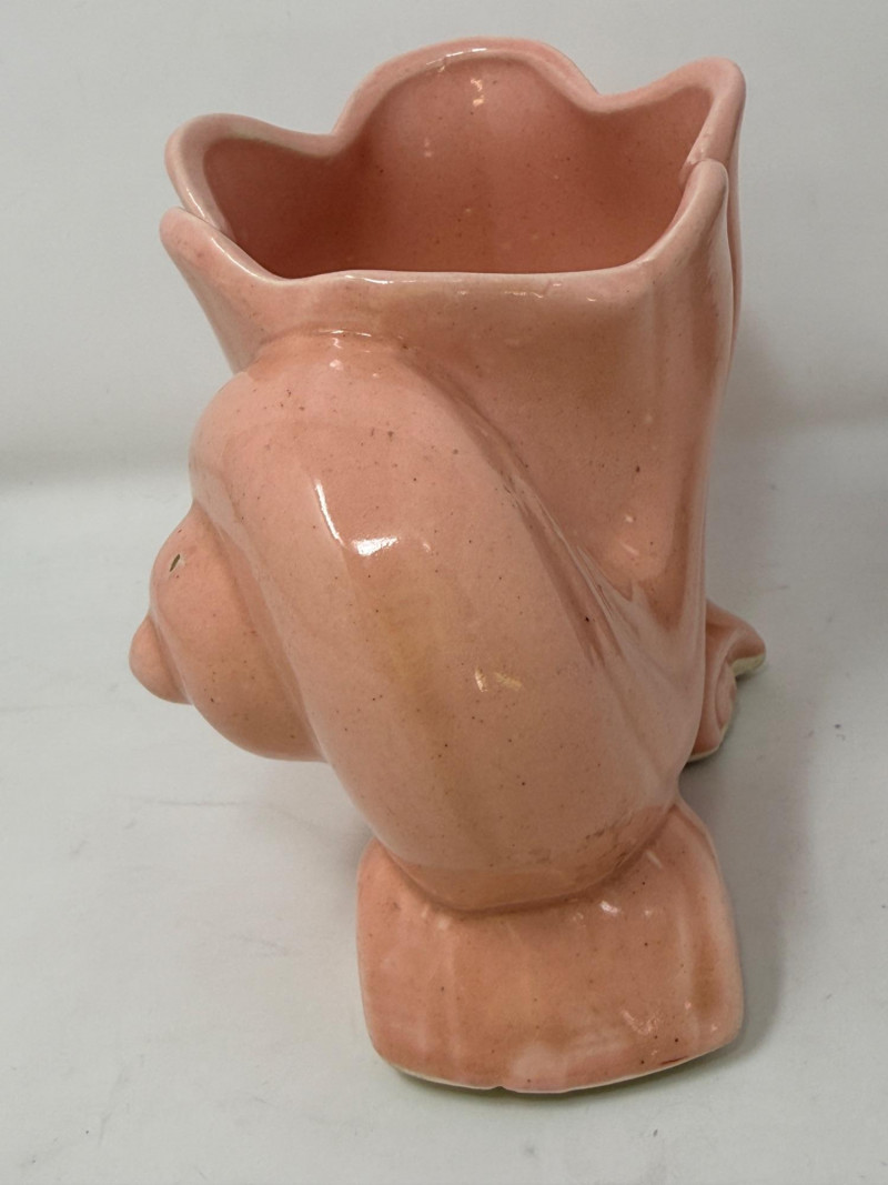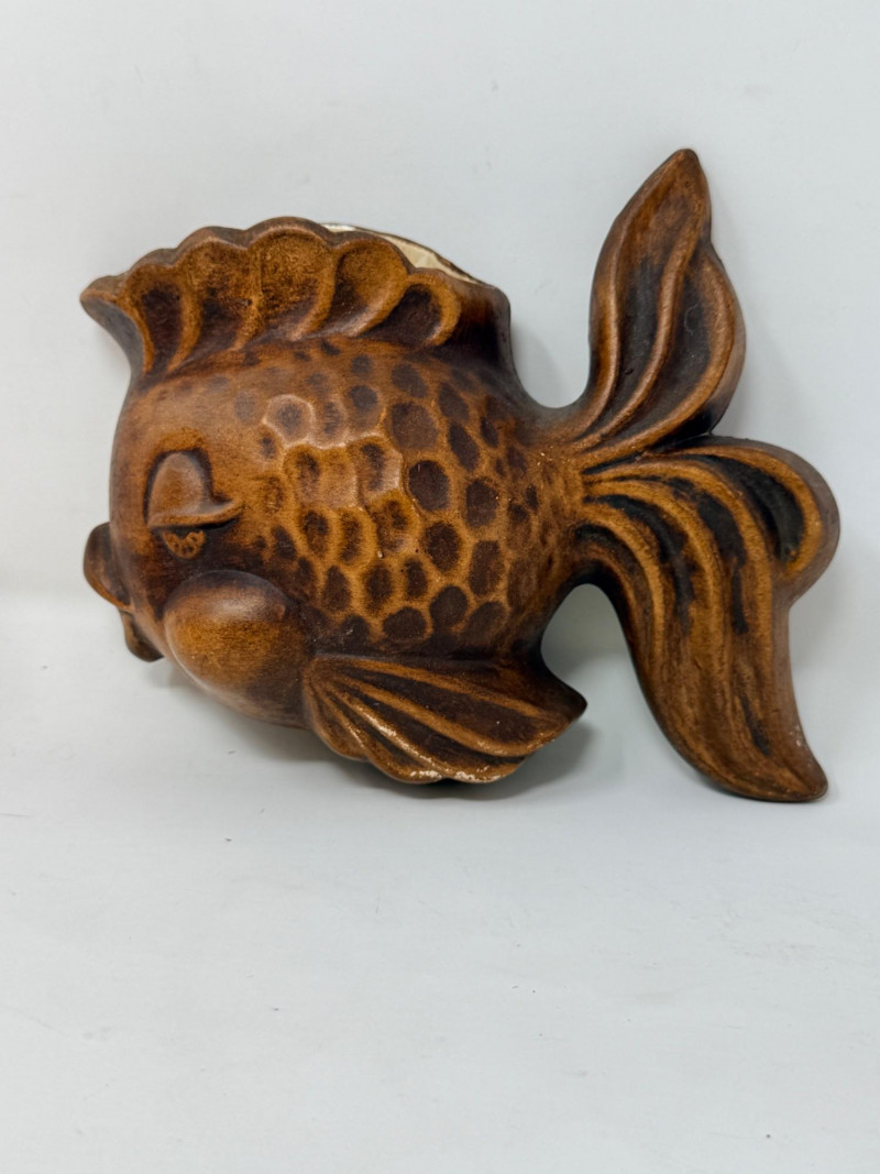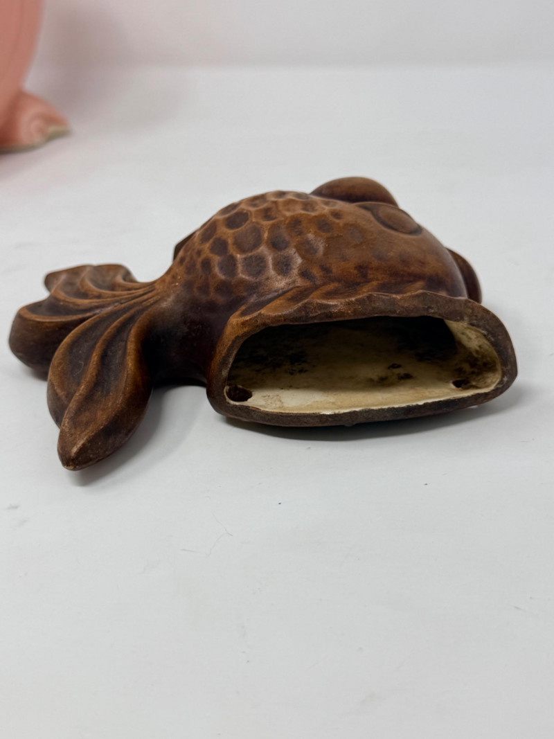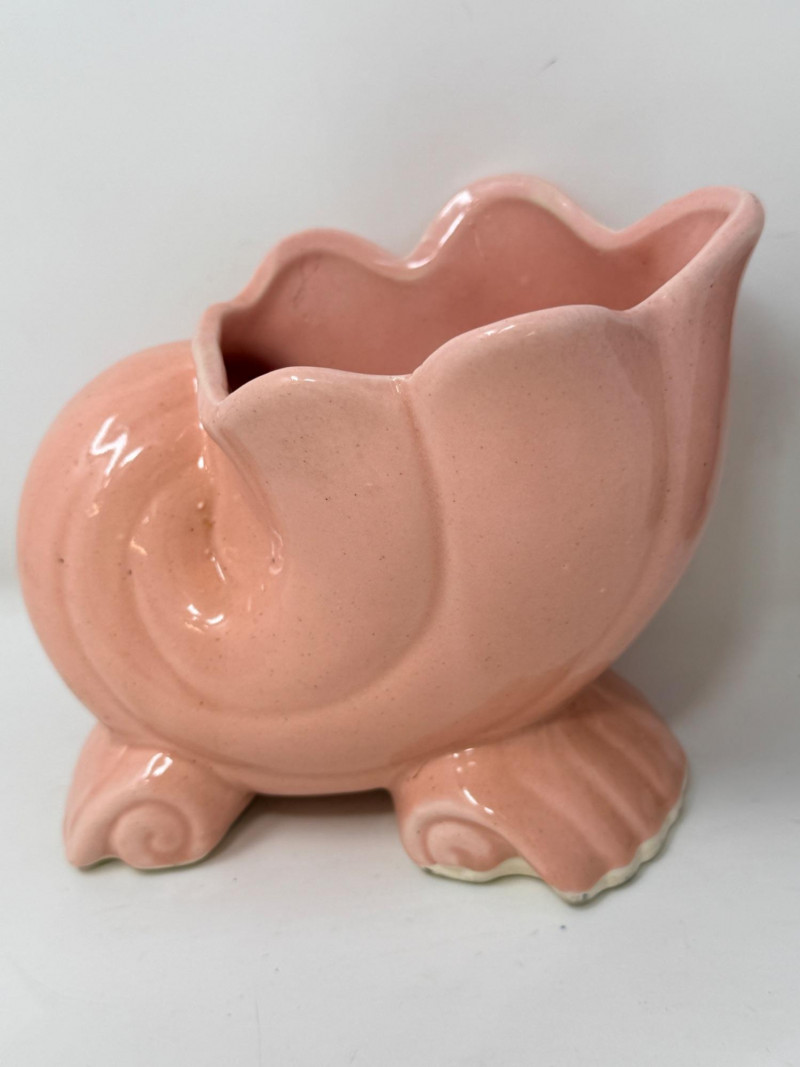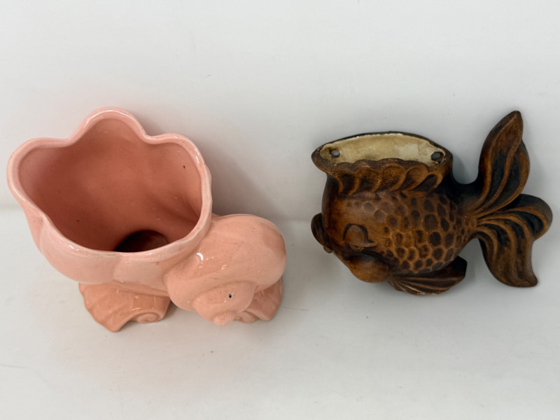 Vintage ceramic shell planter or vase, often attributed to producers like McCoy Pottery or Haegar USA Pottery from the 1950s Mid-Century Modern (MCM) era. It features a blush or pastel pink glaze, a scalloped rim, and a nautilus or conch shell shape with scroll-footed legs. It typically measures approximately 4 to 5 inches in height and 5 to 6 inches in length Vintage goldfish wall pocket planter, typically identified as a mid-century "kitsch" decorative piece from around 1957. 6”x5”