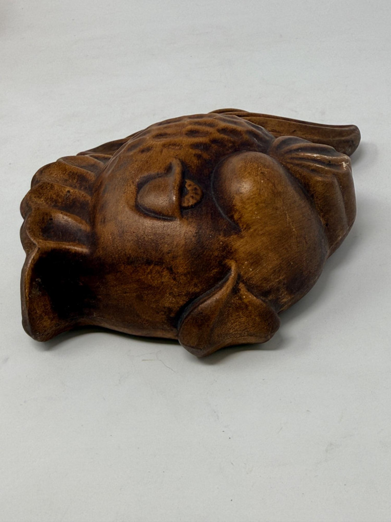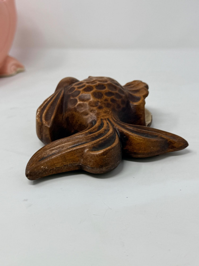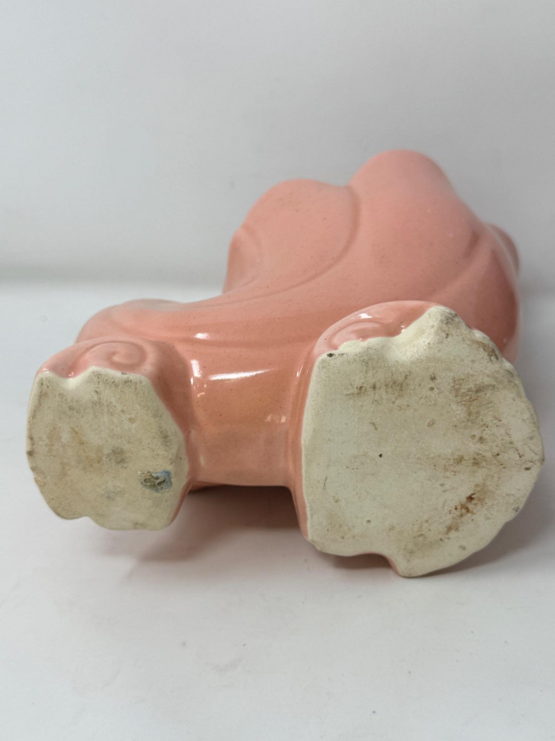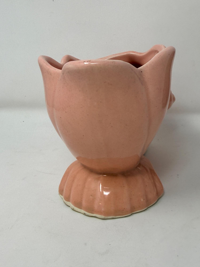 Vintage ceramic shell planter or vase, often attributed to producers like McCoy Pottery or Haegar USA Pottery from the 1950s Mid-Century Modern (MCM) era. It features a blush or pastel pink glaze, a scalloped rim, and a nautilus or conch shell shape with scroll-footed legs. It typically measures approximately 4 to 5 inches in height and 5 to 6 inches in length Vintage goldfish wall pocket planter, typically identified as a mid-century "kitsch" decorative piece from around 1957. 6”x5”