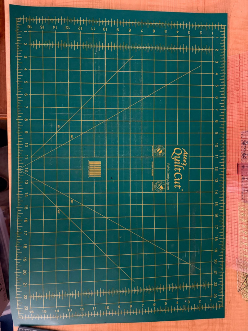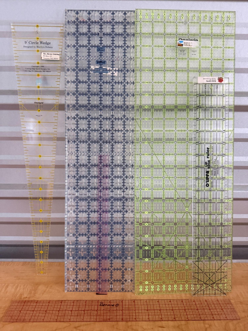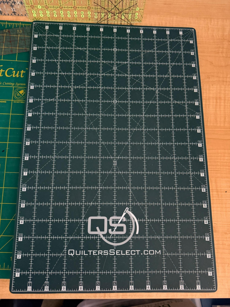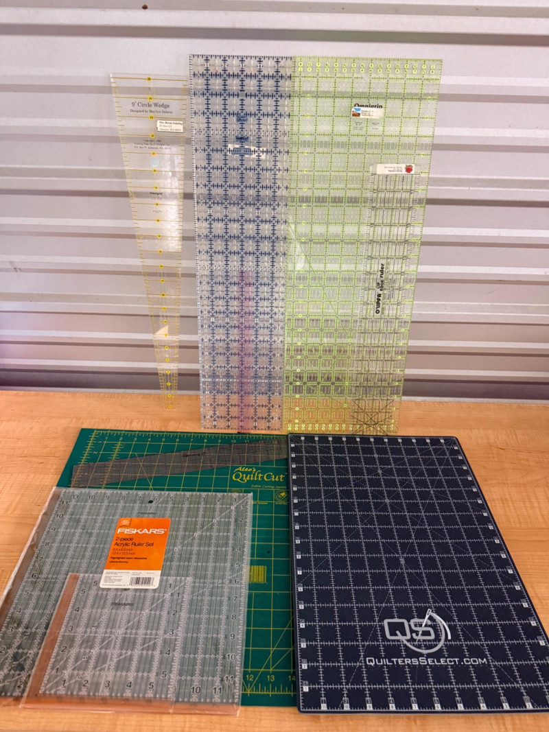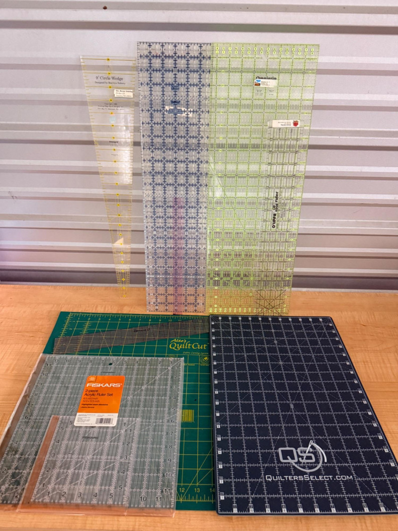 Quilter’s Grids & Cutting Mats Lip edge grids 9 degree circle wedge Fiskars 2 piece ruler set Omnigrid 24”x8” Quilters Select cutting mat 11”x17” Alto’s Quilt Cut 24”x17” cutting mat