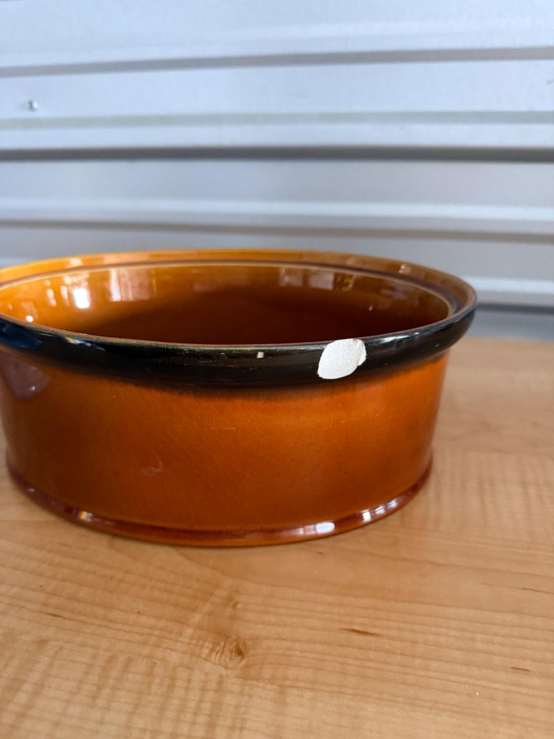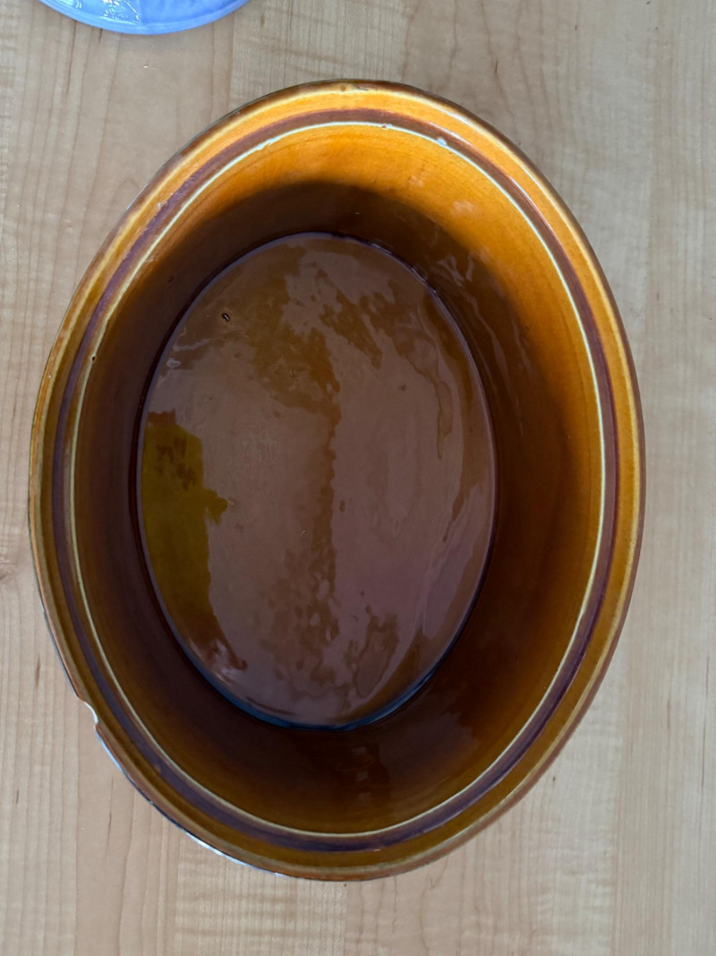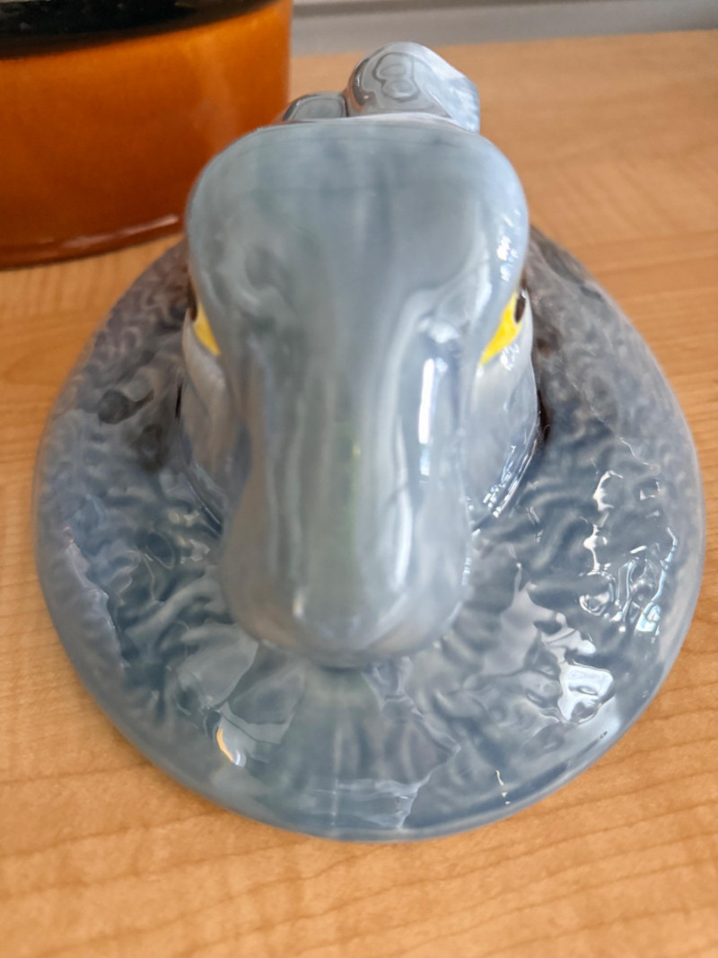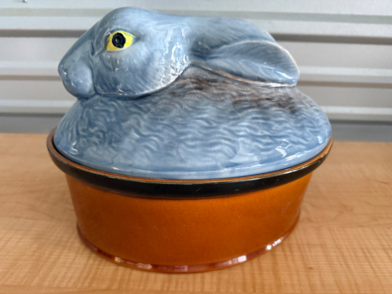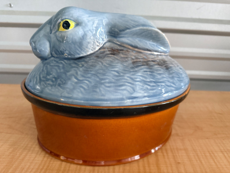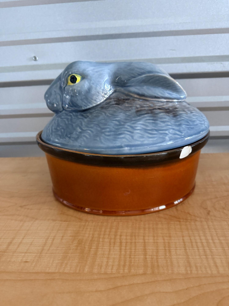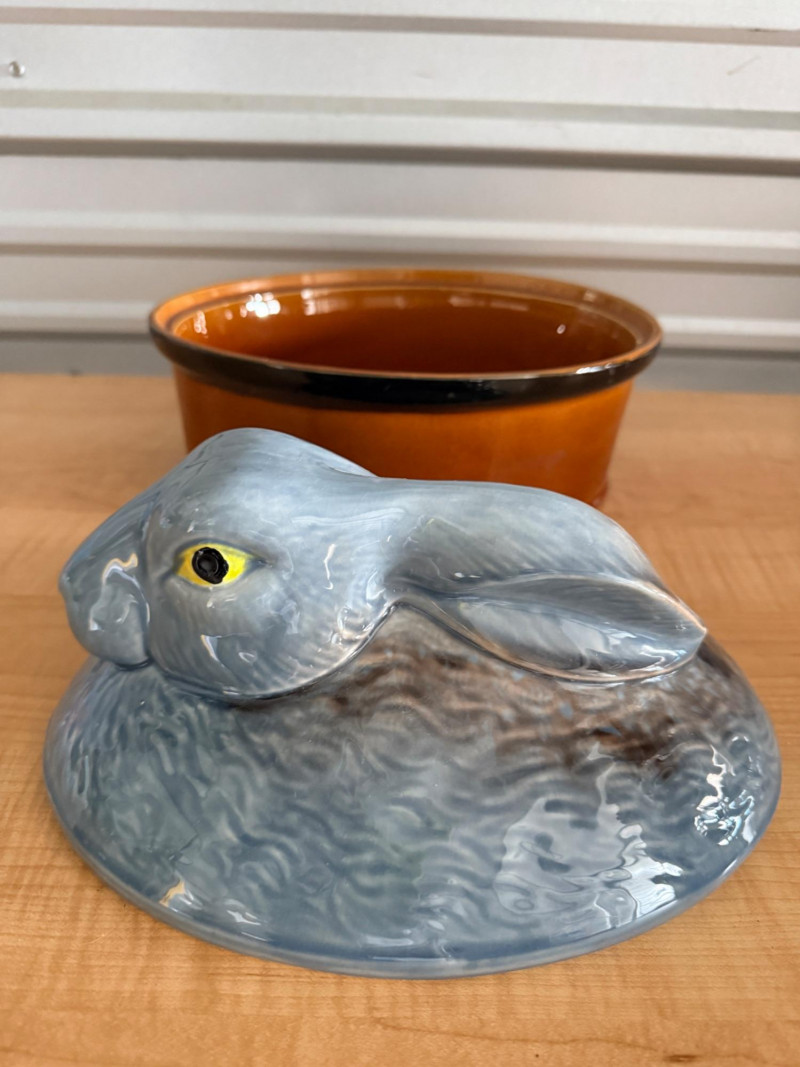 Portugese SECLA Pottery Rabbit Head Tureen Design: Features a blue glazed rabbit lid and a brown ochre base. Material: Ceramic pottery Usage: Commonly used for serving pâté or as decorative kitchenware. .75” Chip on tureen rim 11”x8”x8.5”