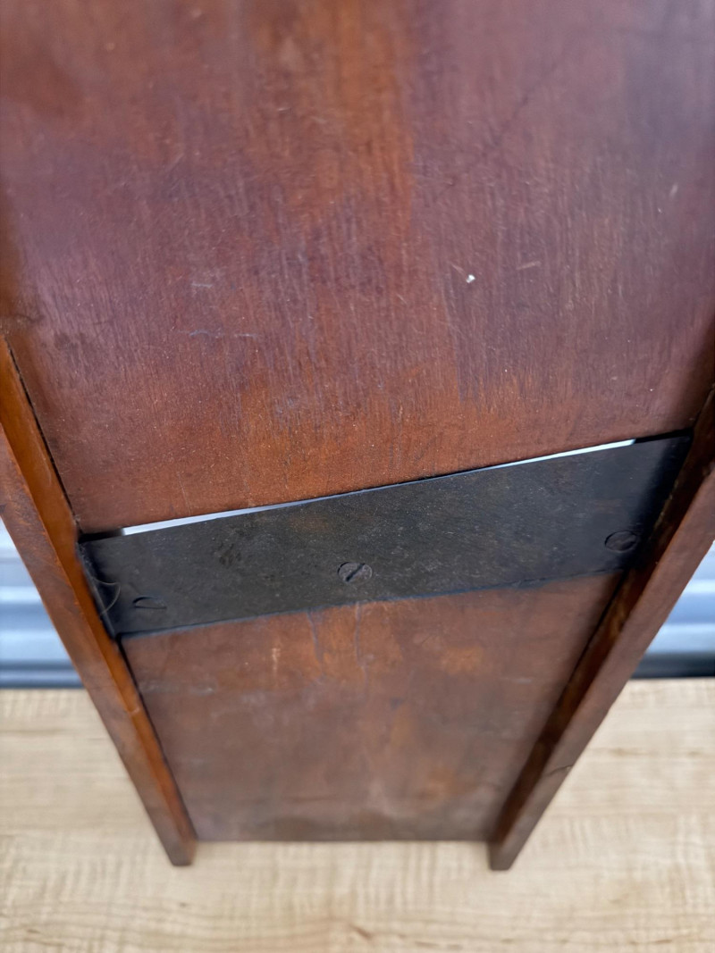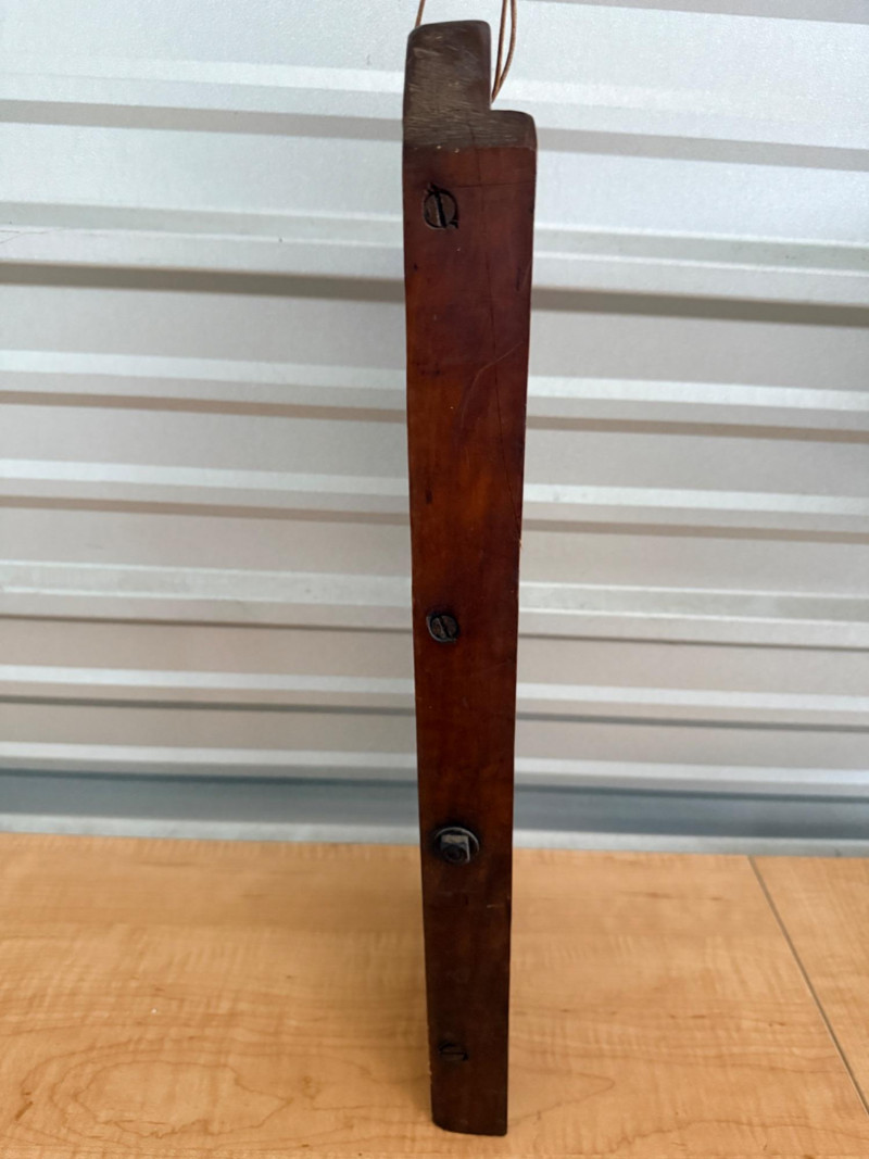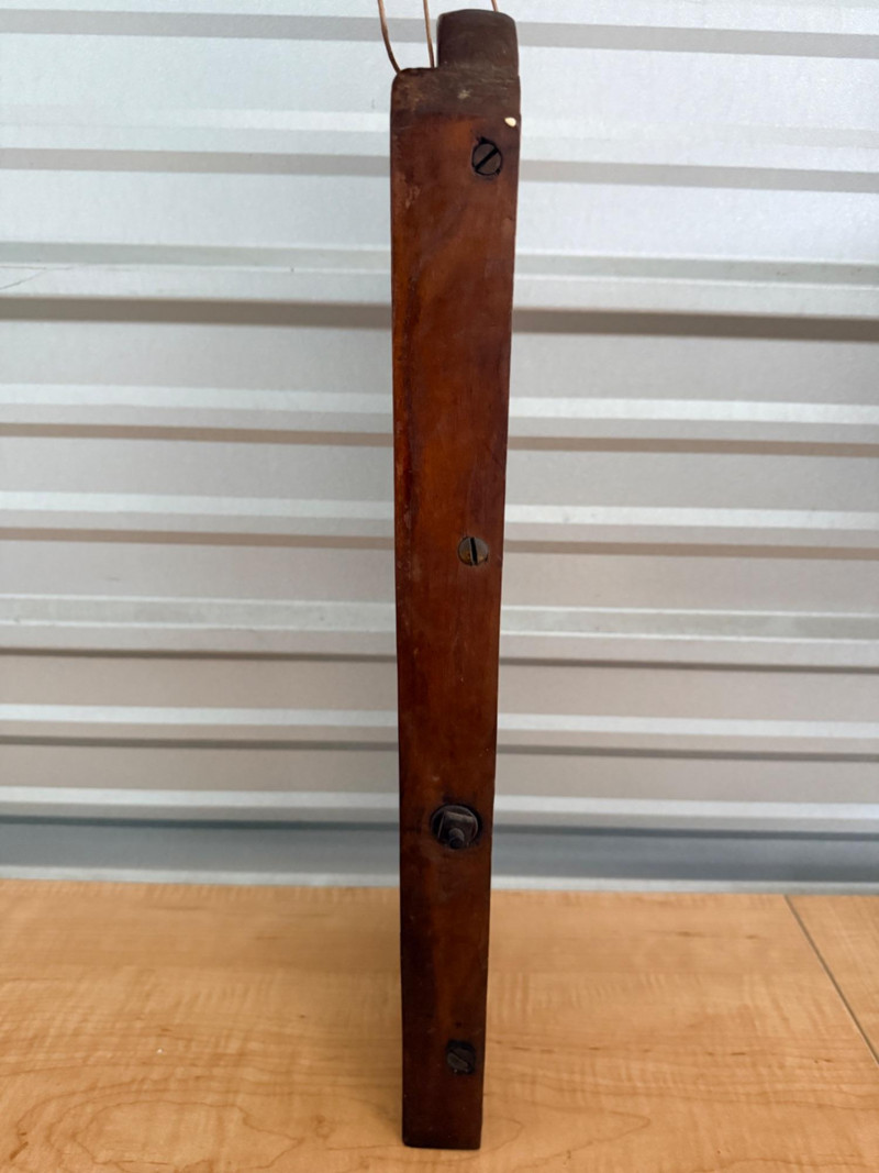 Vintage wooden mandolin slicer, commonly used as a kraut cutter or cabbage shredder. Features a wooden board with a diagonal metal blade. Crafted from wood with leather hanging straps and metal blades 7.25”x19.25”x1.5”