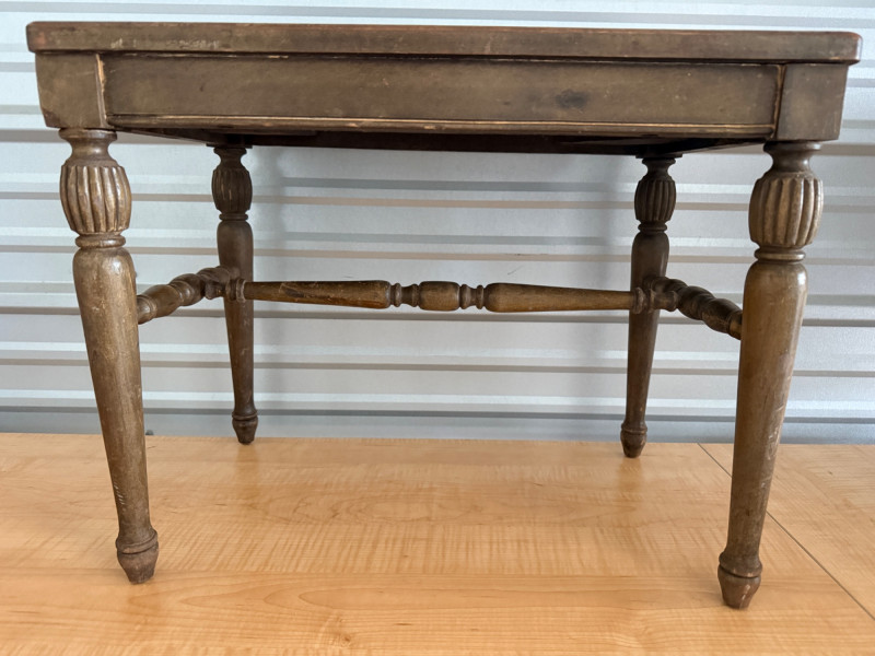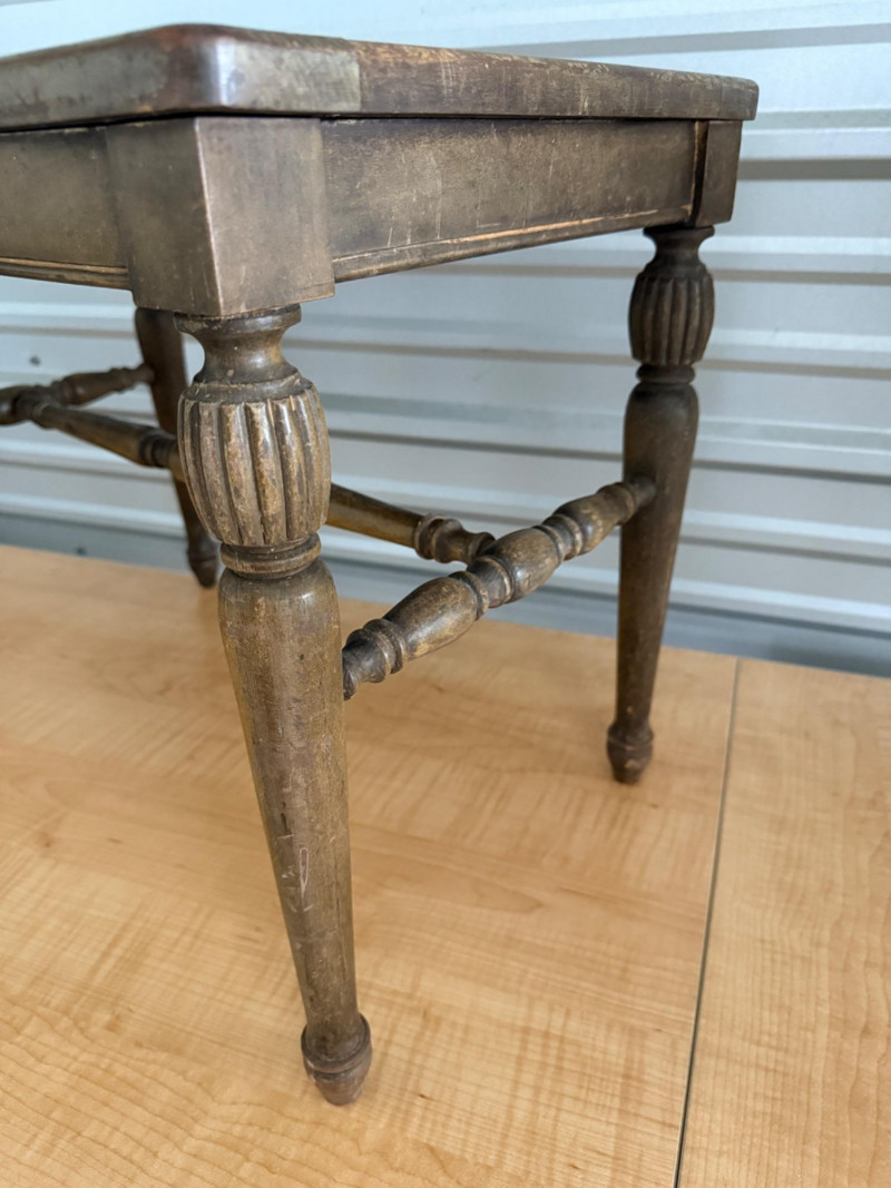 Vintage wooden stool or side table featuring a woven Viennese wickerwork cane top, intricately turned legs.