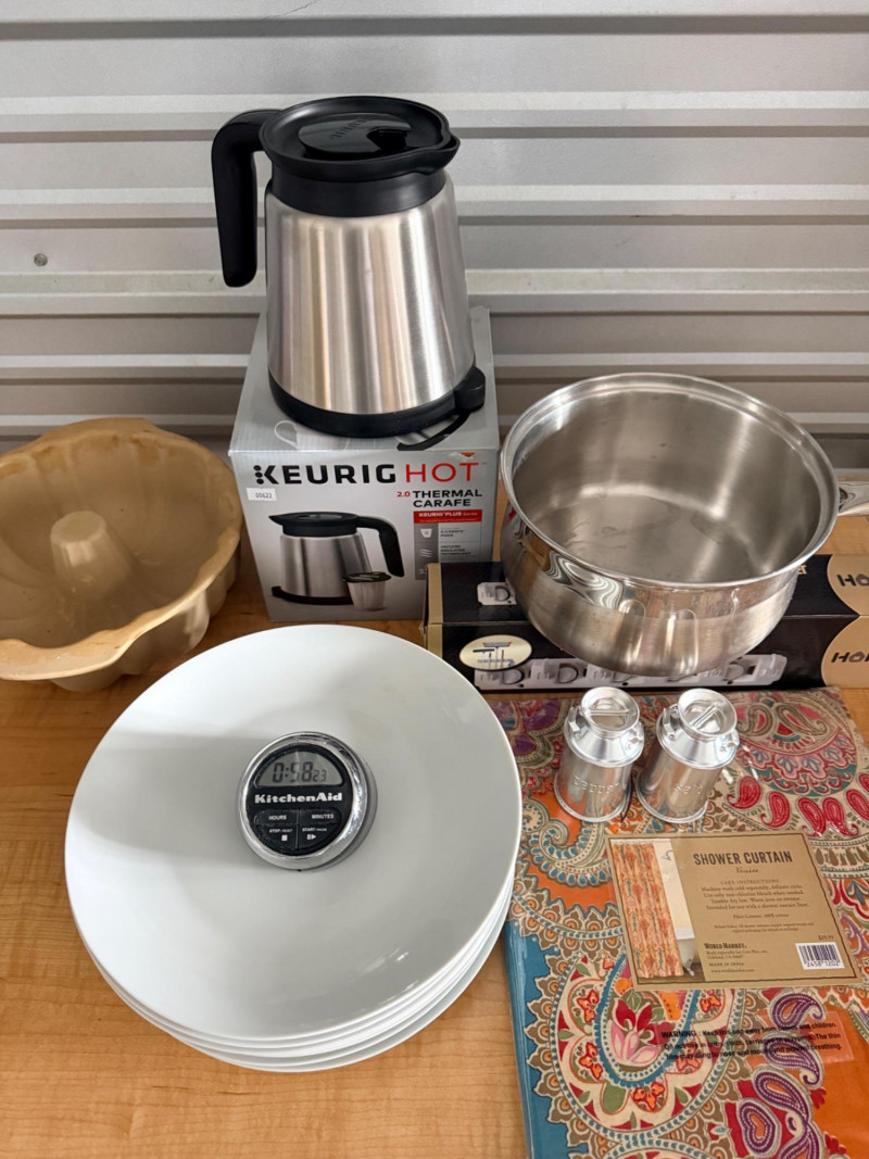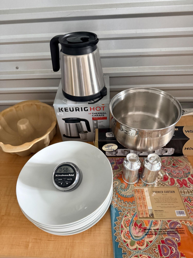 Home Goods Collection World Market “Venice” Shower Curtain NIP Home It - Track Organizer Long Handle Tool Wall Organizer Keurig Hot 32oz Thermal Carafe Culinary Comfort 3 qt saucepan Pampered Chef Stoneware Bundt Cake Pan (9) Mikasa “Aspen” Dishwasher and Microwave safe plates Aluminum milk can salt and pepper shakers KitchenAid Kitchen Timer