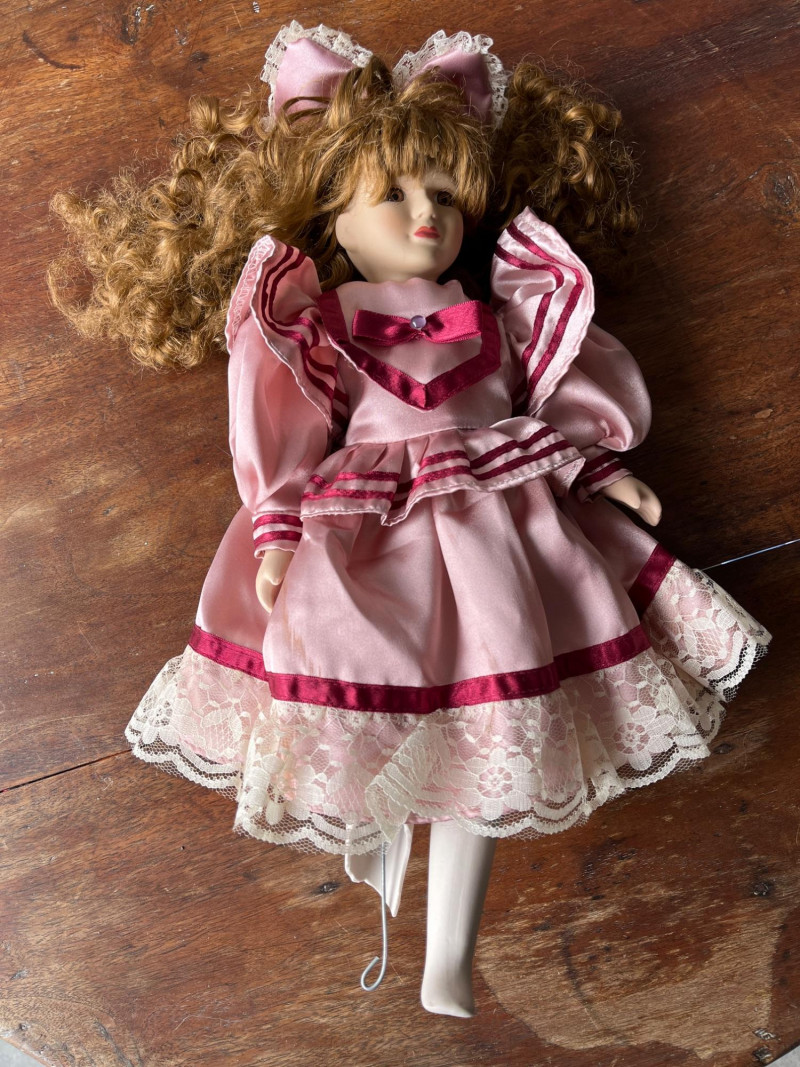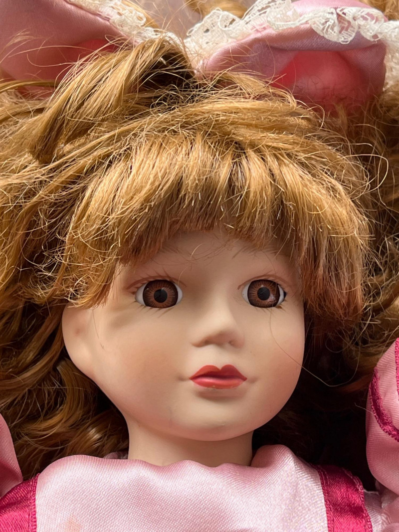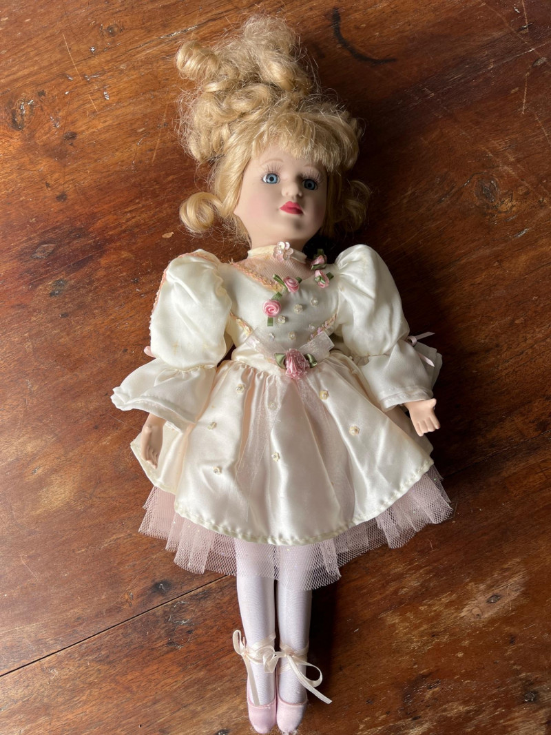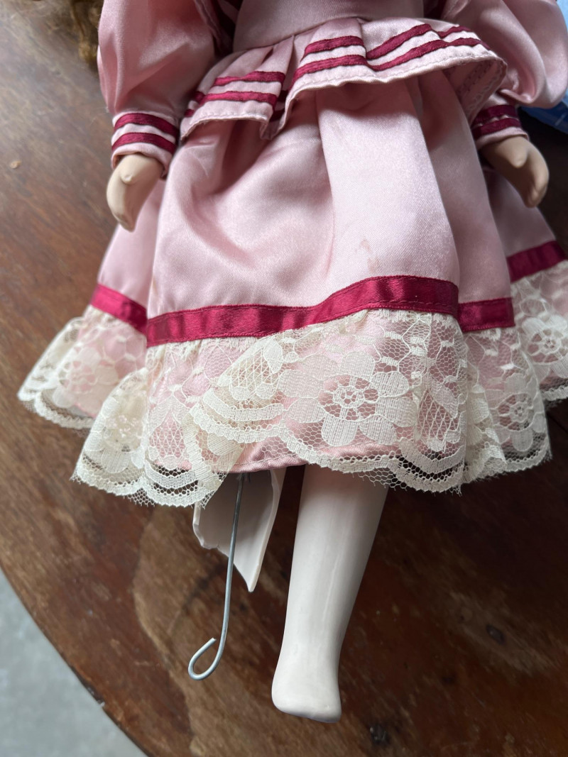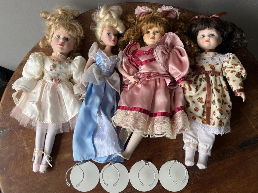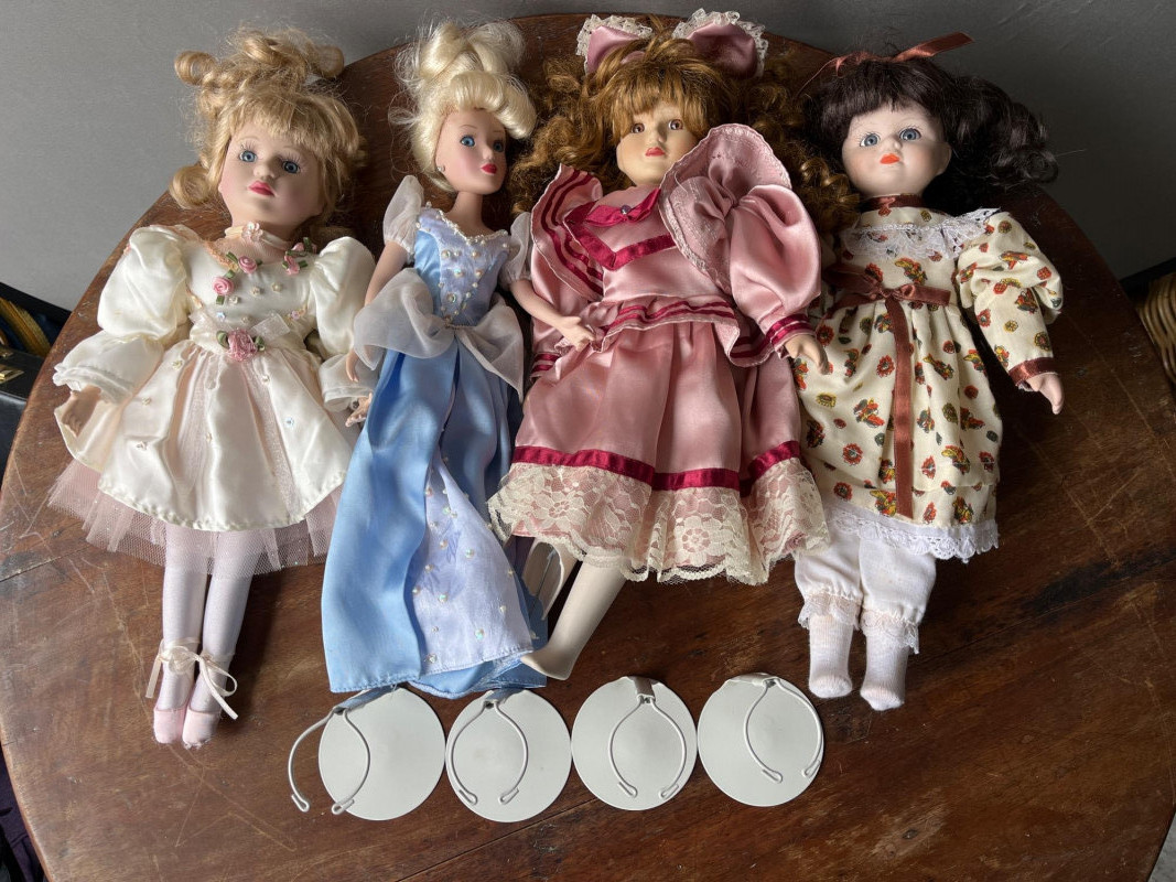 (4) Porcelain Dolls The Brass Key Victorian-style ballerina porcelain doll. 16” tall. Curly red haired Victorian-style porcelain doll. 16” tall. One foot is broken, see pictures for details. Disney’s Cinderella Keepsake Porcelain doll. 14” tall. Brunette porcelain doll with patterned dress. 16” tall Includes four stands.