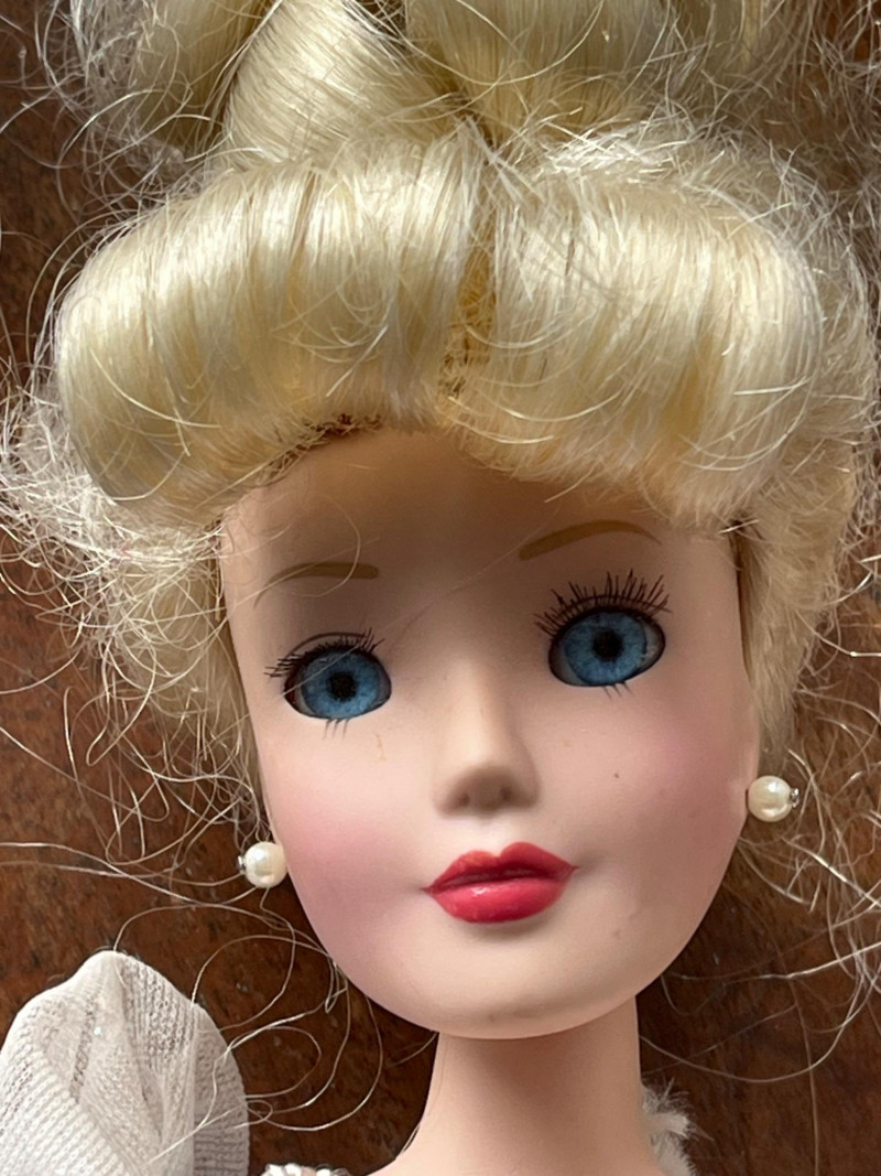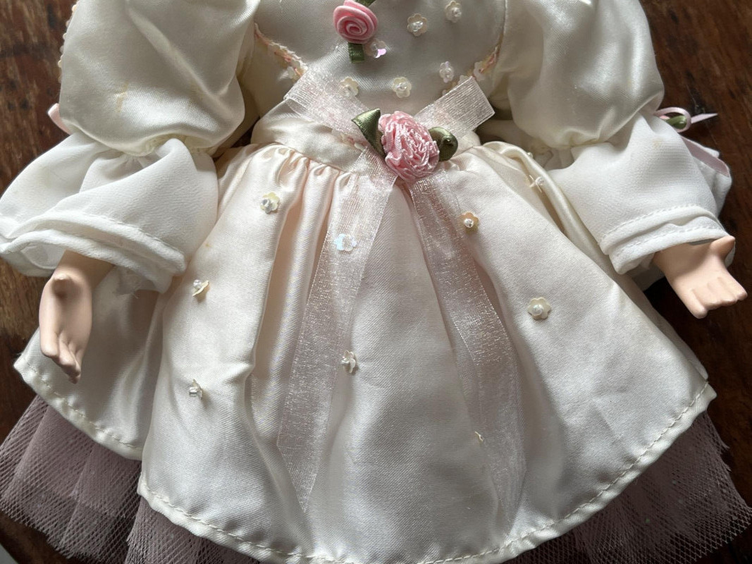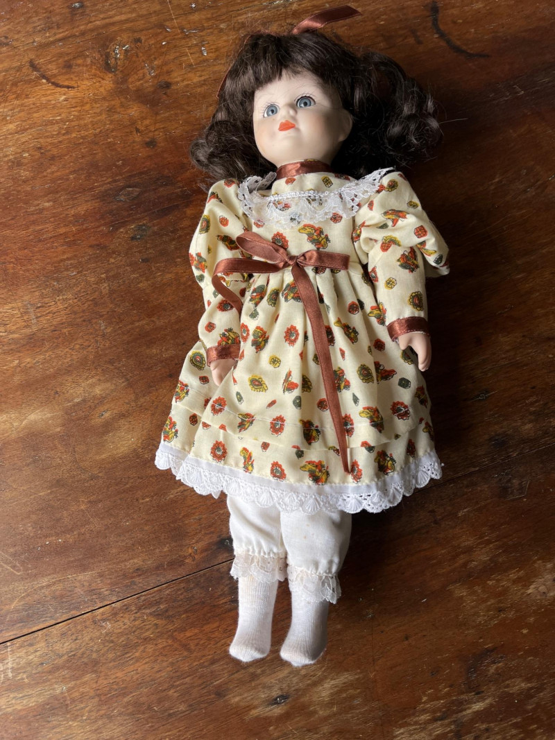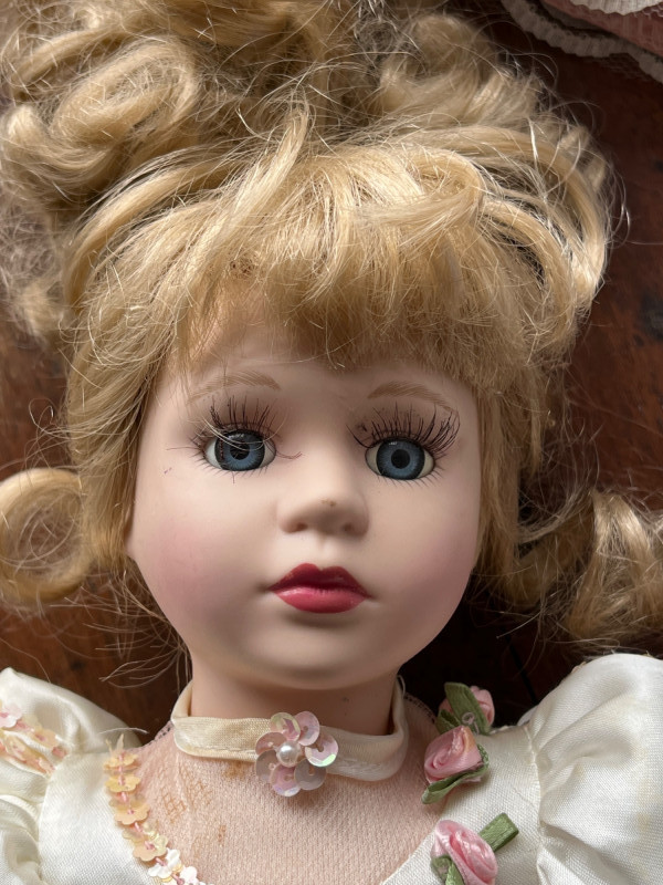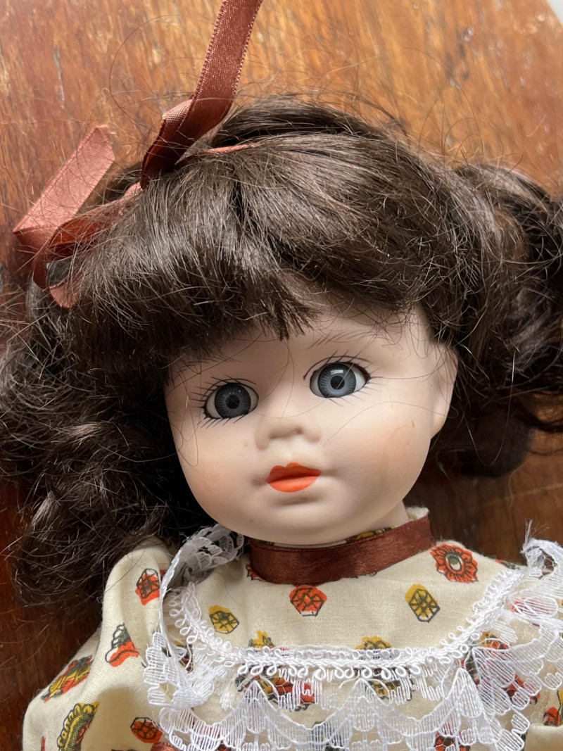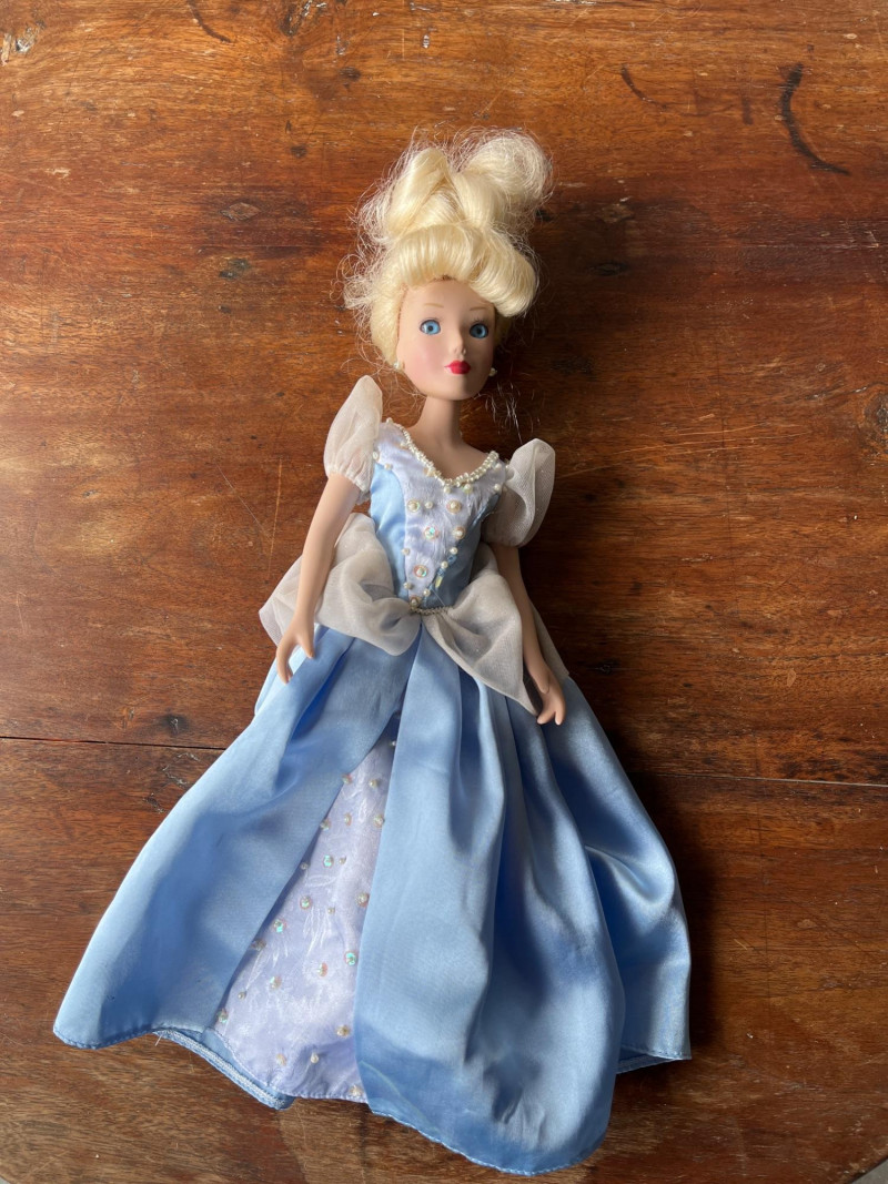 (4) Porcelain Dolls The Brass Key Victorian-style ballerina porcelain doll. 16” tall. Curly red haired Victorian-style porcelain doll. 16” tall. One foot is broken, see pictures for details. Disney’s Cinderella Keepsake Porcelain doll. 14” tall. Brunette porcelain doll with patterned dress. 16” tall Includes four stands.