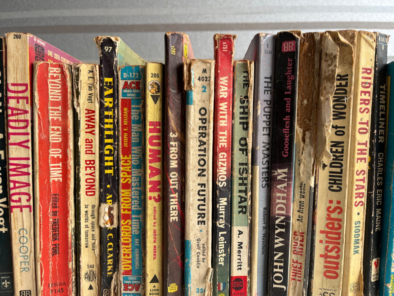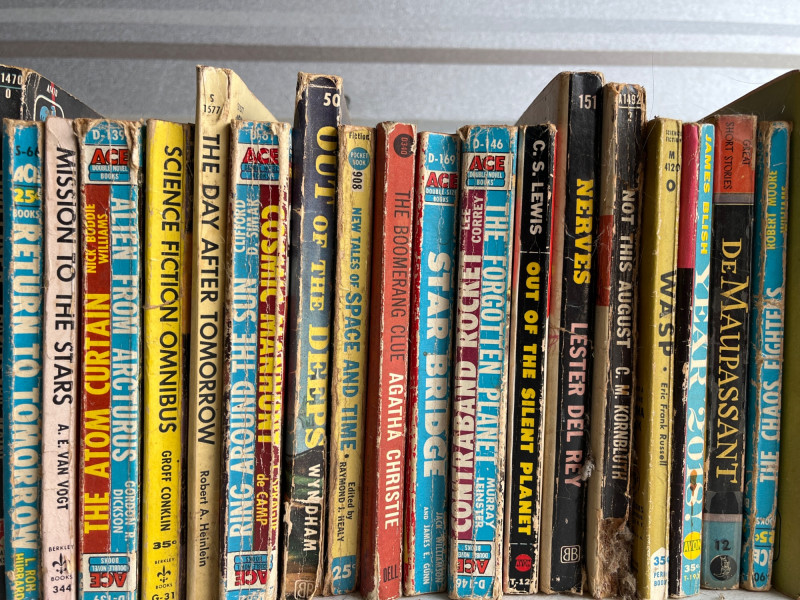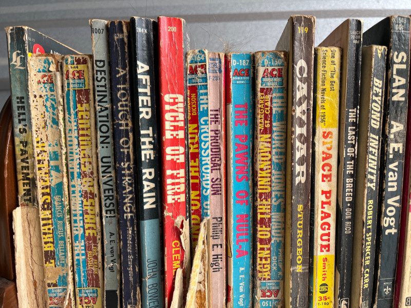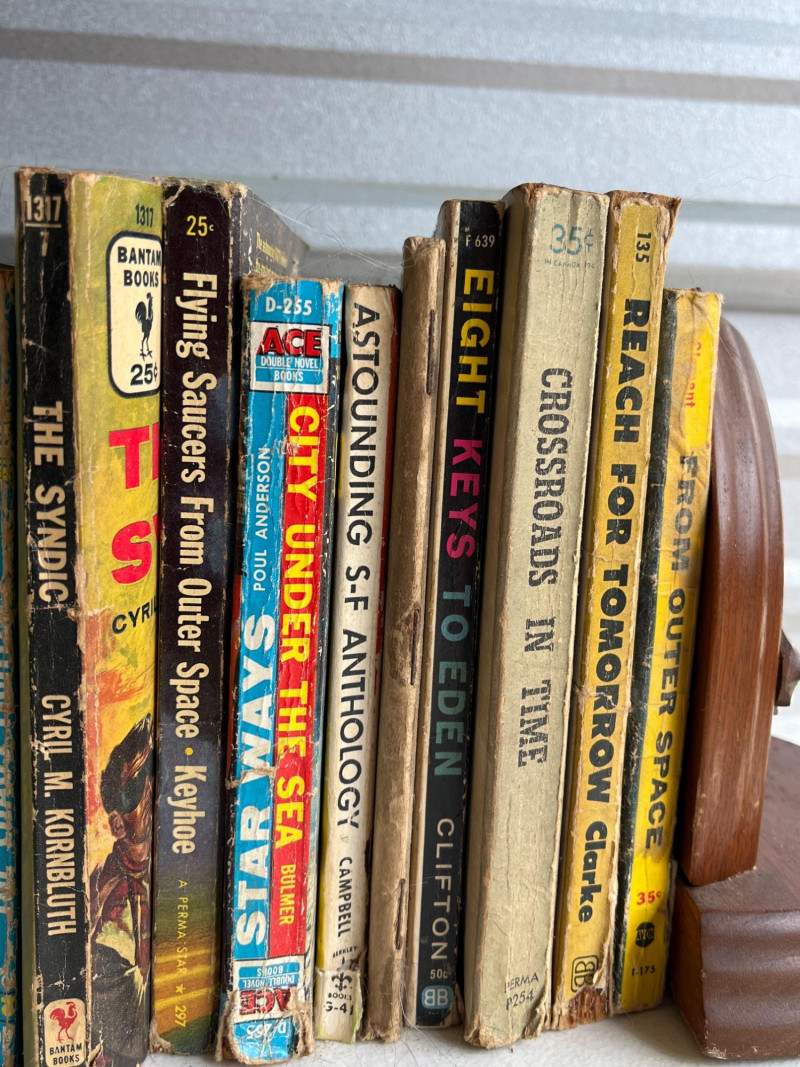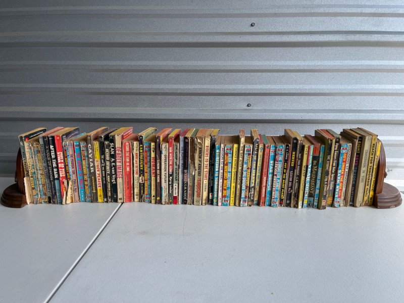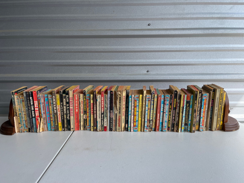 (59) Miscellaneous Paperback Books Deadly Image, Away and Beyond, Riders to the Stars, Return to Tomorrow, Out of the Deeps, and more! Fifty-nine books total! Solid walnut bookends included 6.5”Tx6”Wx4”D