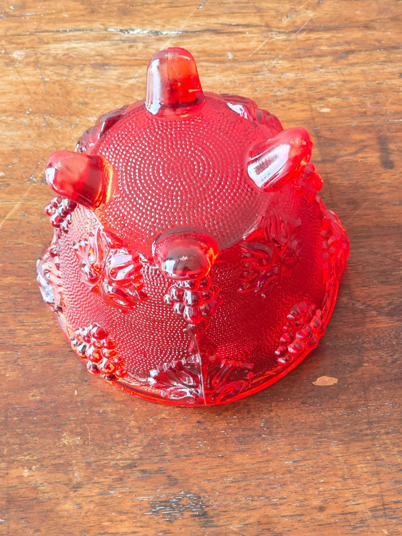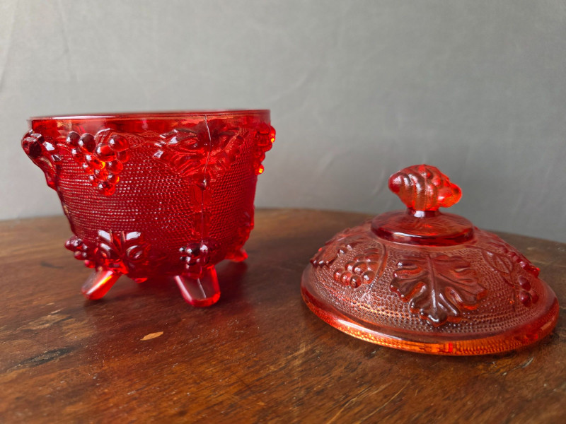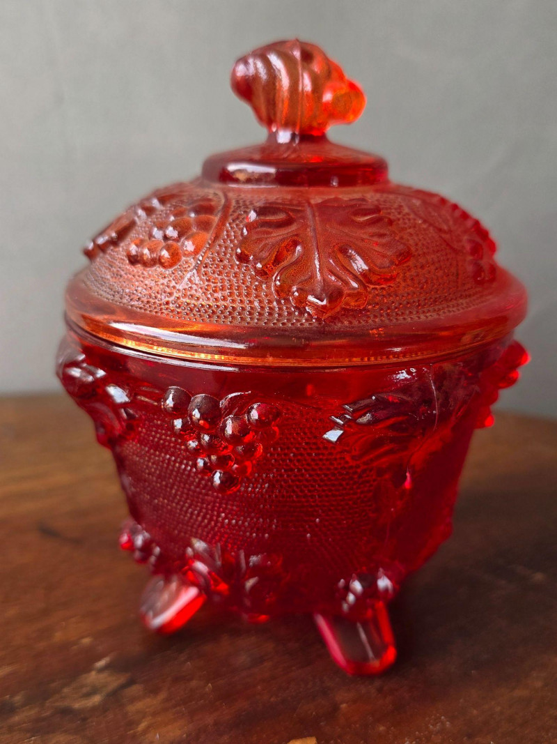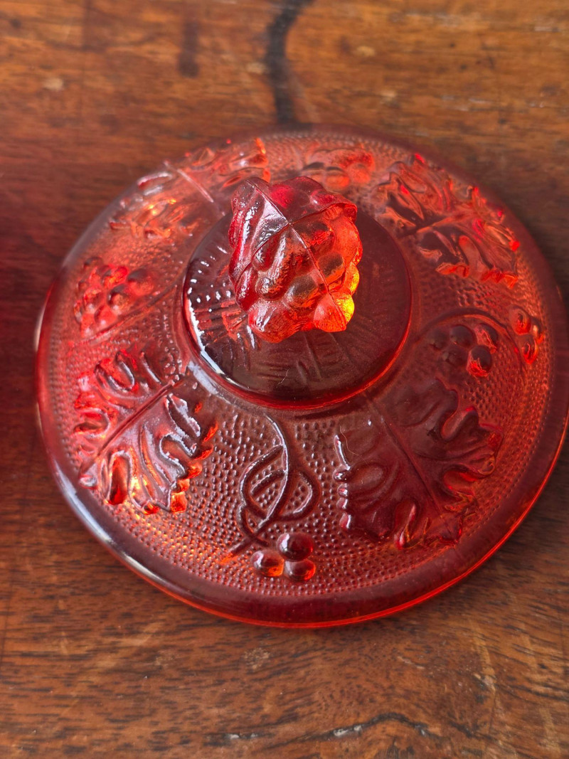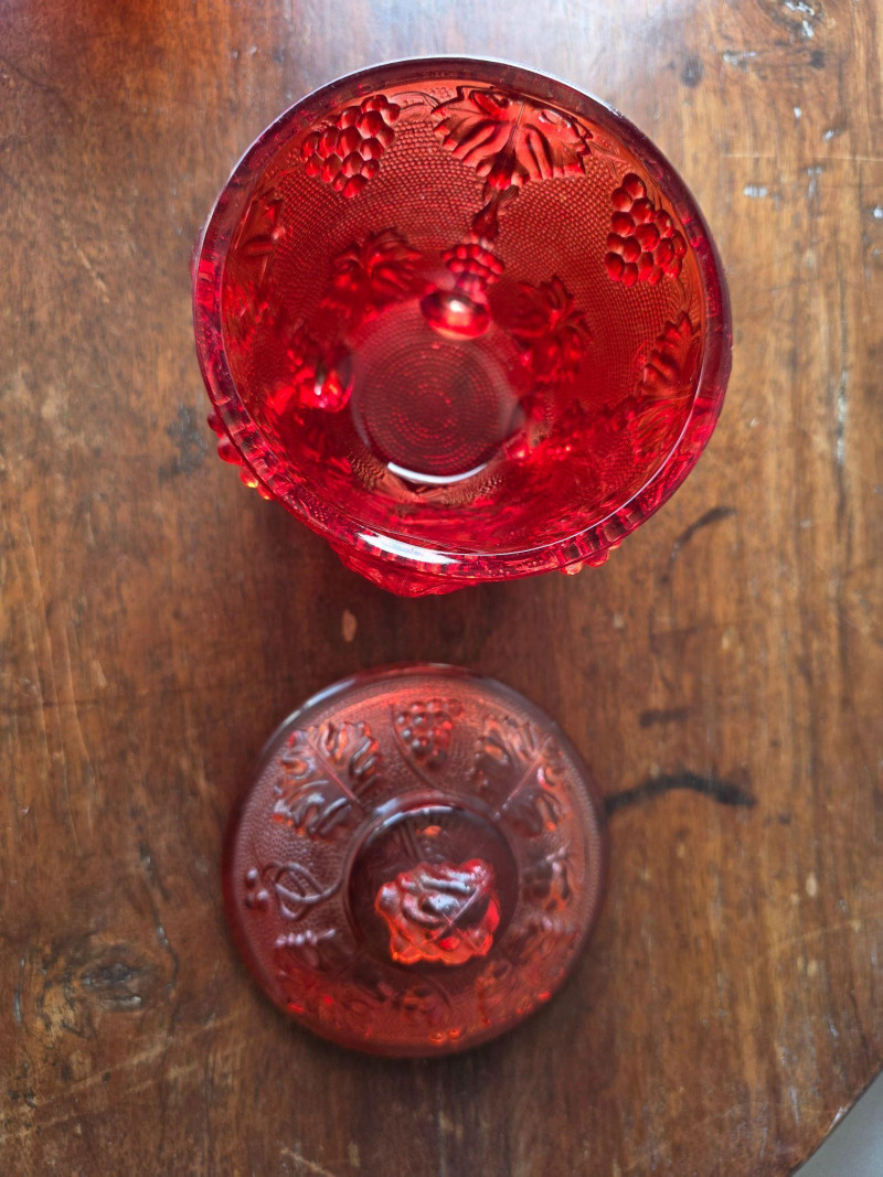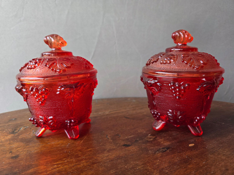 (2) Jeanette Harvest Grape Amberina Red Glass Footed Candy Dishes Pattern & Design: The glass features an embossed grape and leaf pattern. Color & Finish: The color is red carnival glass, sometimes described as ruby or having an amberina ombre effect. Features: Each dish is footed and includes a matching lid. Era: These are vintage collectible pieces, typically dating from the mid-century period No cracks or damage noted, see pics for condition 5.5"T x 4.35"W