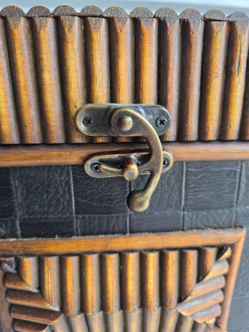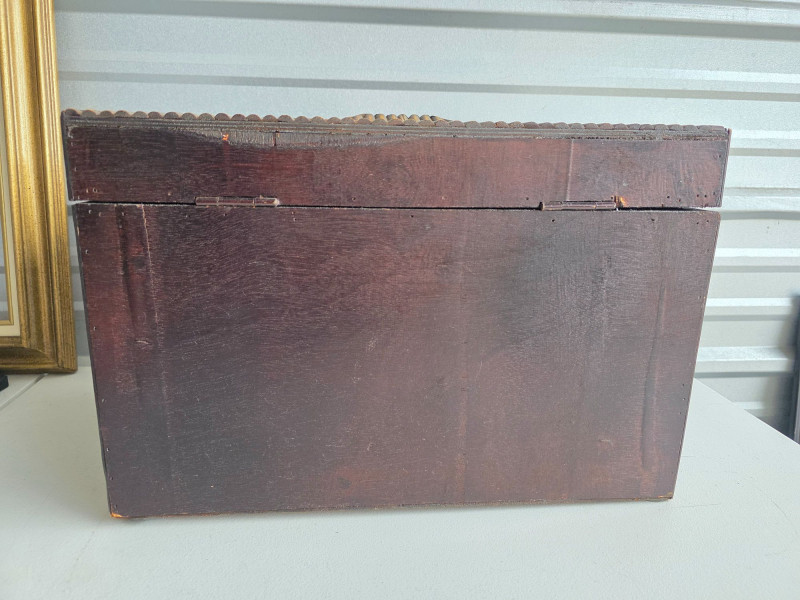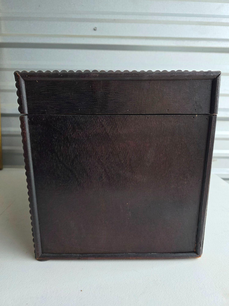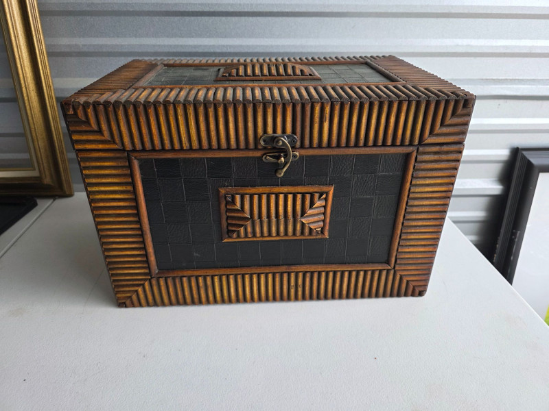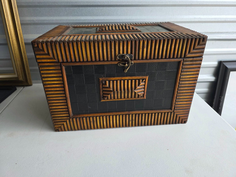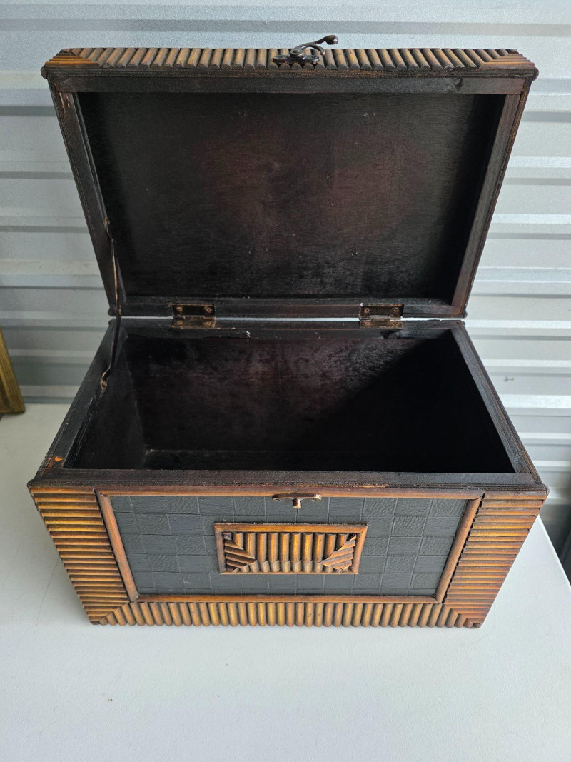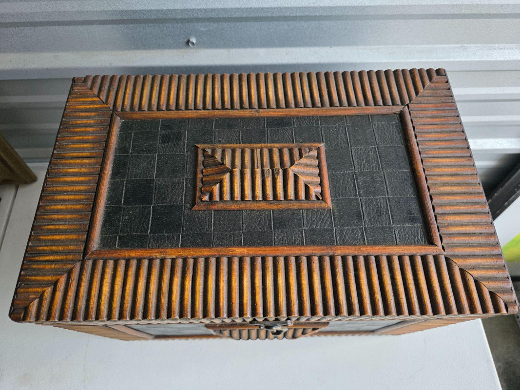 Vintage-Style Tramp Art Box This appears to be a modern version of a tramp art box Lightweight but beautiful, with intricate designs on the exterior and a painted black interior These were popularized as a form of folk art created by notch-carving reclaimed wood (often from cigar boxes) nto geometric shapes and layering them to create a three-dimensional effect These handmade boxes were popular from the 1870s through the mid-20th century See pics for condition 10.5"T x 16.5"W x 10.5"D