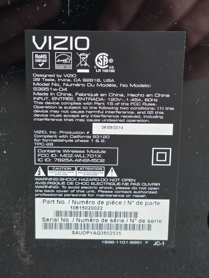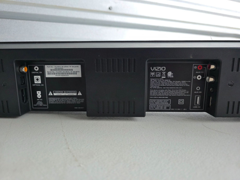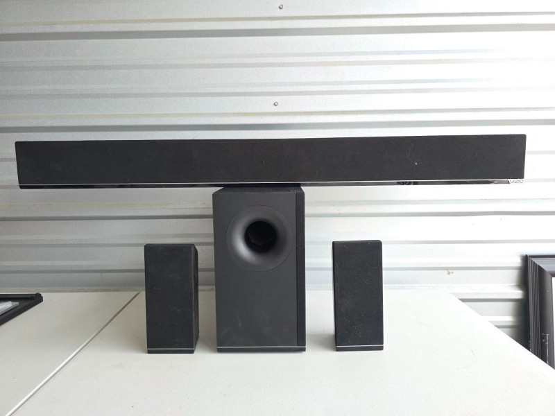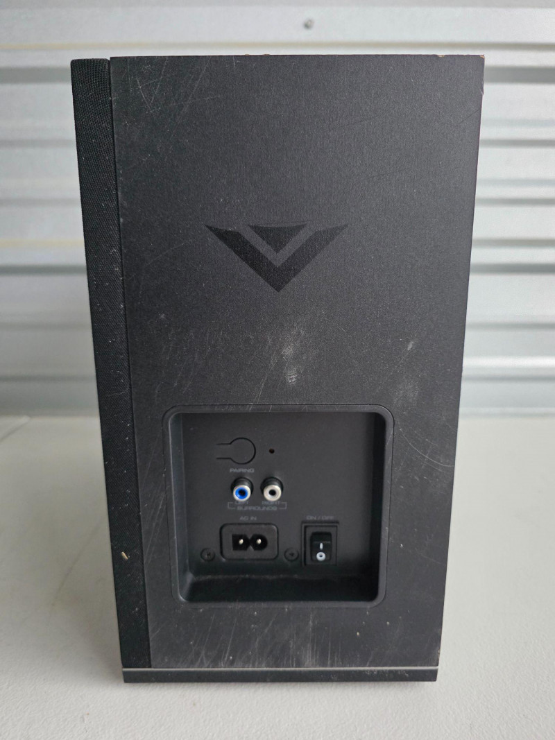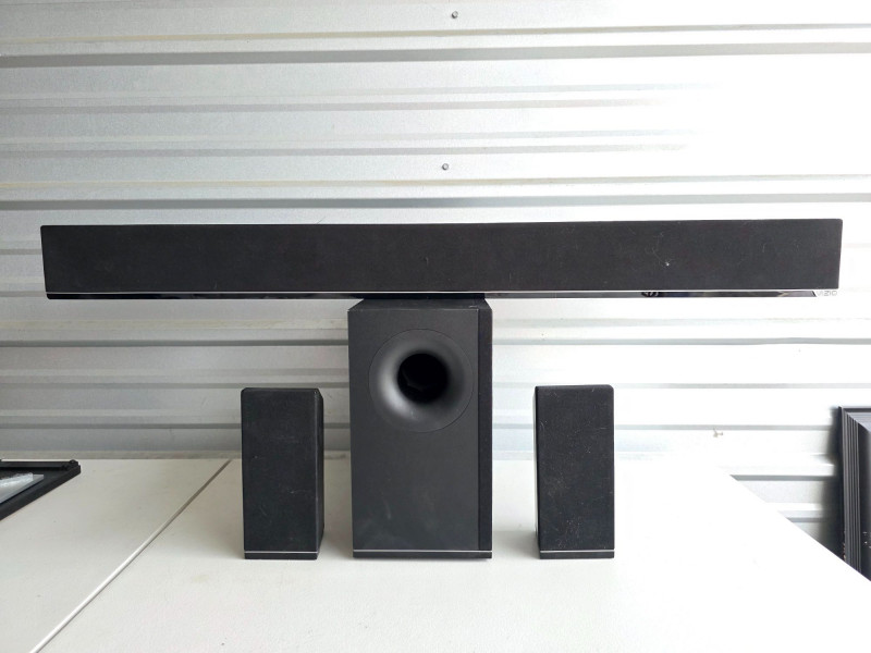 Vizio 5.1 channel Soundbar System Model #S3851w-D4 VIZIO S3851w-D4 is a 38" 5.1-channel soundbar system designed for 40"+ TVs Features a wireless subwoofer and wired rear satellite speakers Offers 100dB of sound, built-in Bluetooth for streaming, and supports Dolby Digital and DTS System Components include 38" 3-channel soundbar, wireless subwoofer, and two rear satellite speakers. Audio Performance: 100 dB SPL with less than 1% total harmonic distortion, with a 50Hz low-frequency response. Connectivity: Bluetooth, USB (for .WAV playback), digital optical, coaxial, and 3.5mm stereo RCA inputs. Rear Speakers are wired to the wireless subwoofer for surround sound. Both the soundbar and satellites are wall-mountable We told this worked by the client, however no cables were included for us to verify (no power or speaker cables included) Untested! Soundbar: 3.5"T x 38"W x 2 75"D Satellite Speakers: 7.5"T x 3.25"W x 2.75"D Subwoofer: 11"T x 6"W x 13.5"D