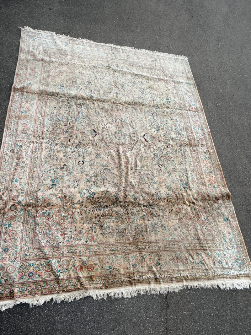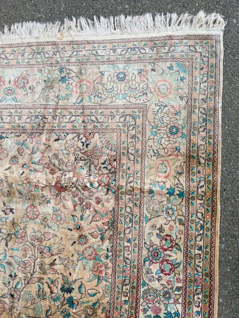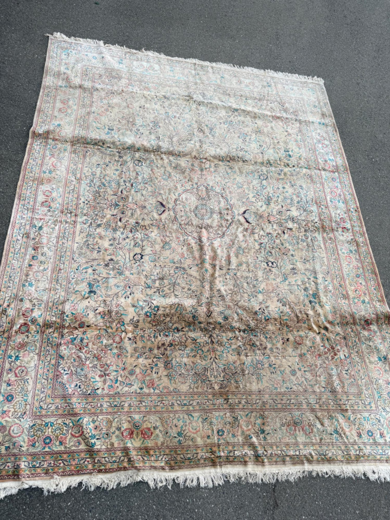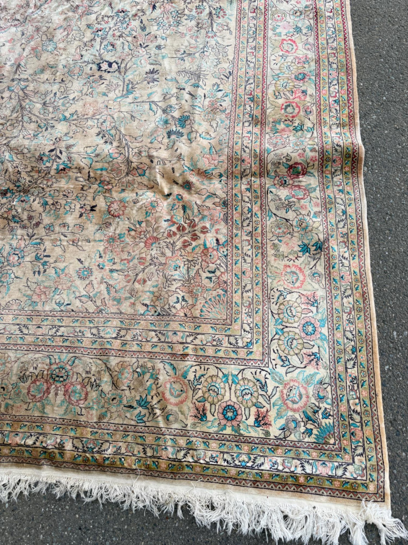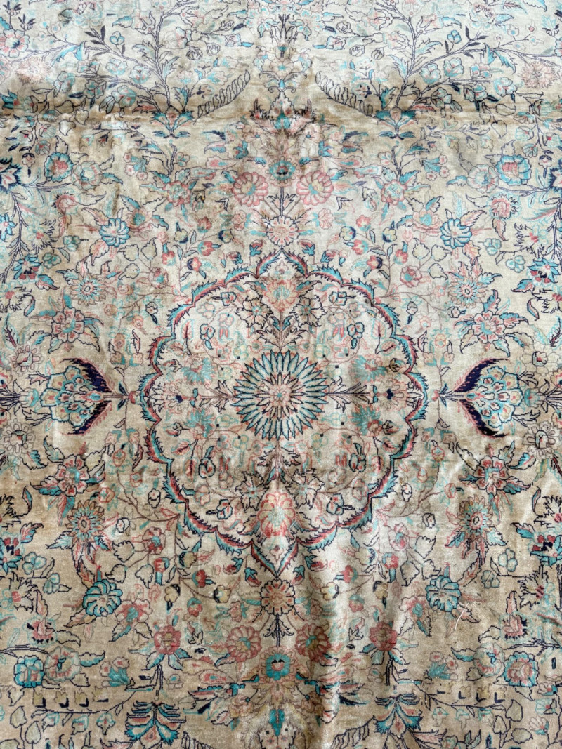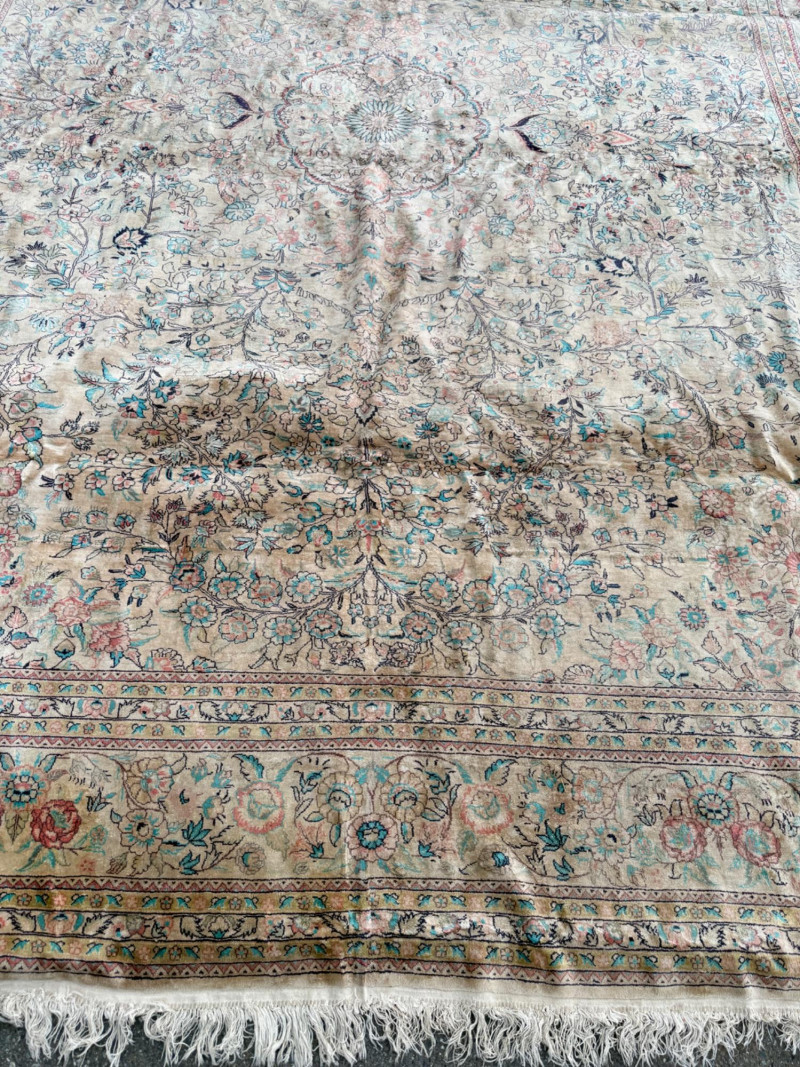 Hand Knotted Floral Room Rug 9’x11’ The prominent circular or star-shaped centerpiece often represents a lotus flower, a symbol of sacred significance in Persian culture. This "medallion-and-corner" layout is a hallmark of many prestigious Persian styles. The use of muted pastels—including soft pinks, light blues, and ivories—is frequently seen in Kerman (specifically those influenced by Western "French" floral designs) and Tabriz rugs. The delicate, flowery "detached floral spray" and soft hues are very characteristic of Kerman rugs from the mid-20th century Hand tied large room rug with soft pastels in a floral pattern. Cream background with the main colors of teal, pink and red. 2 smaller spots noted. No pet stains. Photographic discolorations are from folding. Includes a floor protector/no slip pad. Approximately 9’x11’