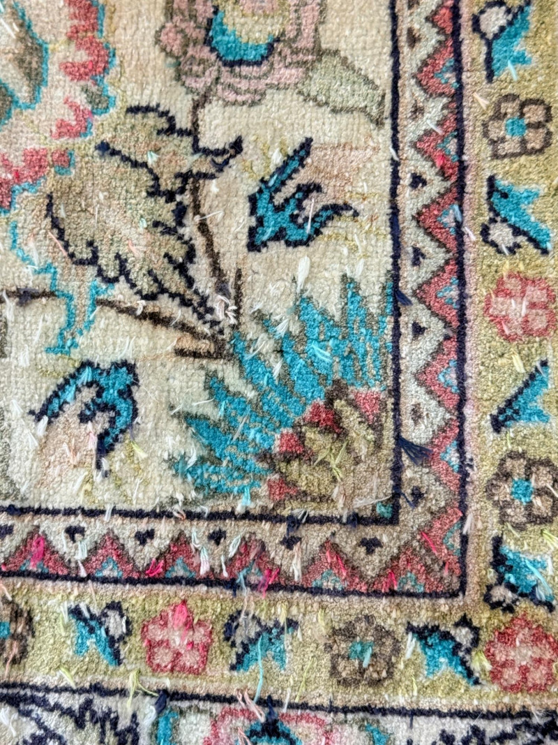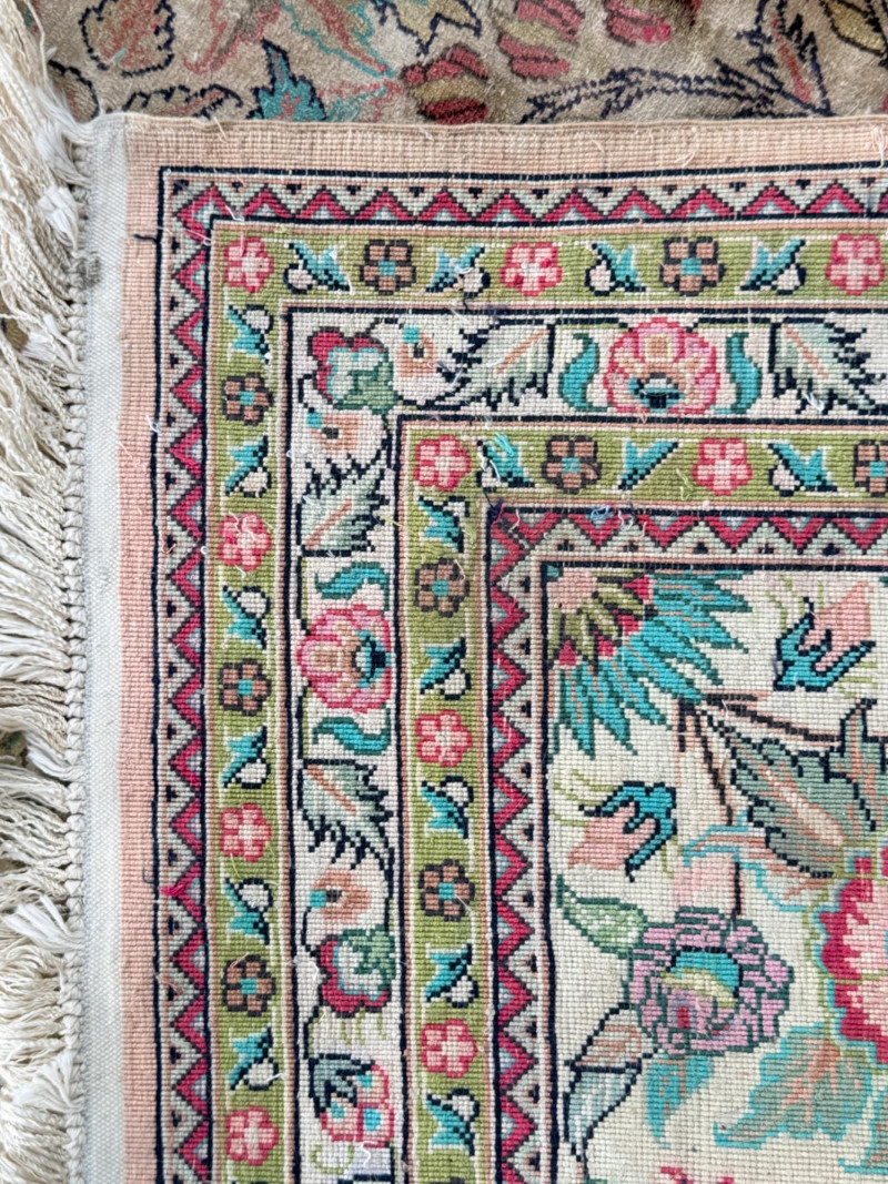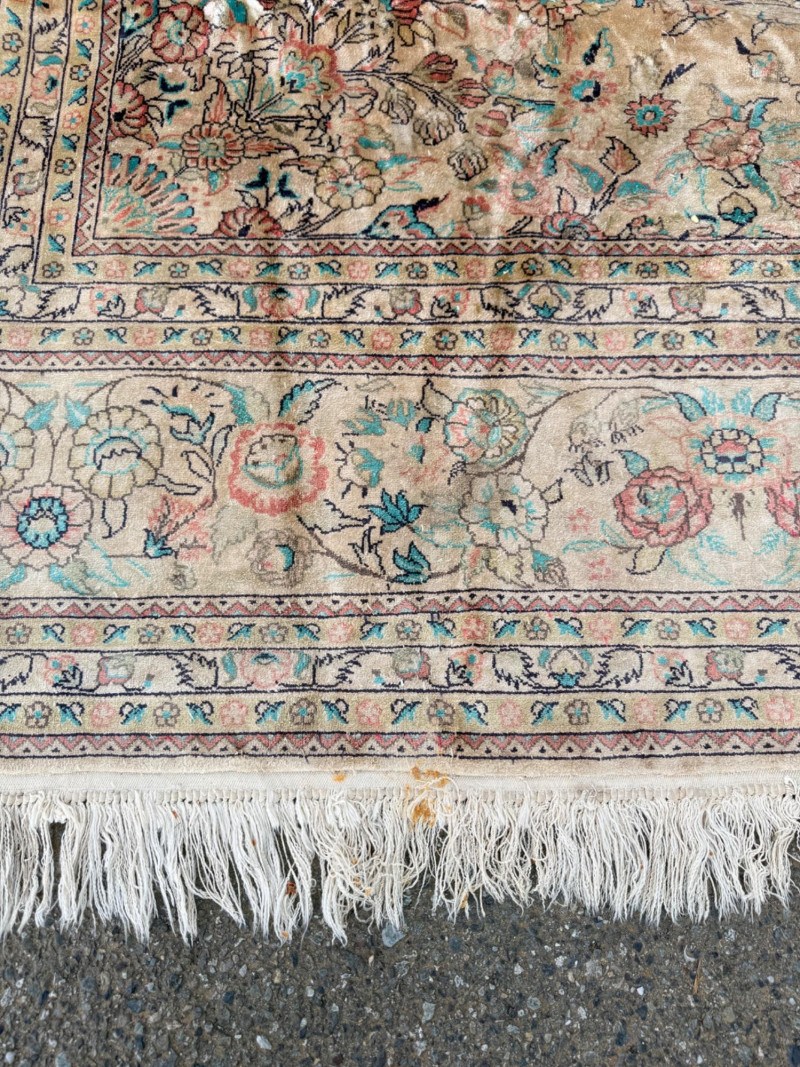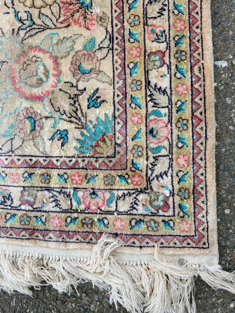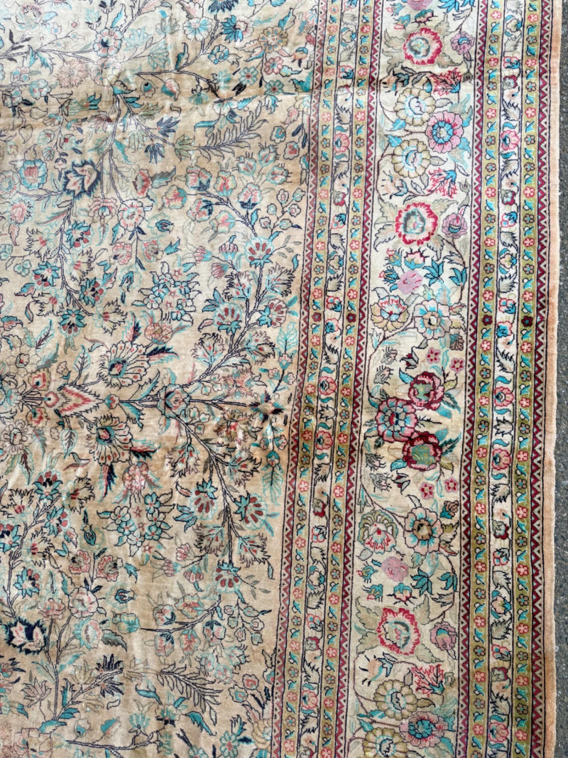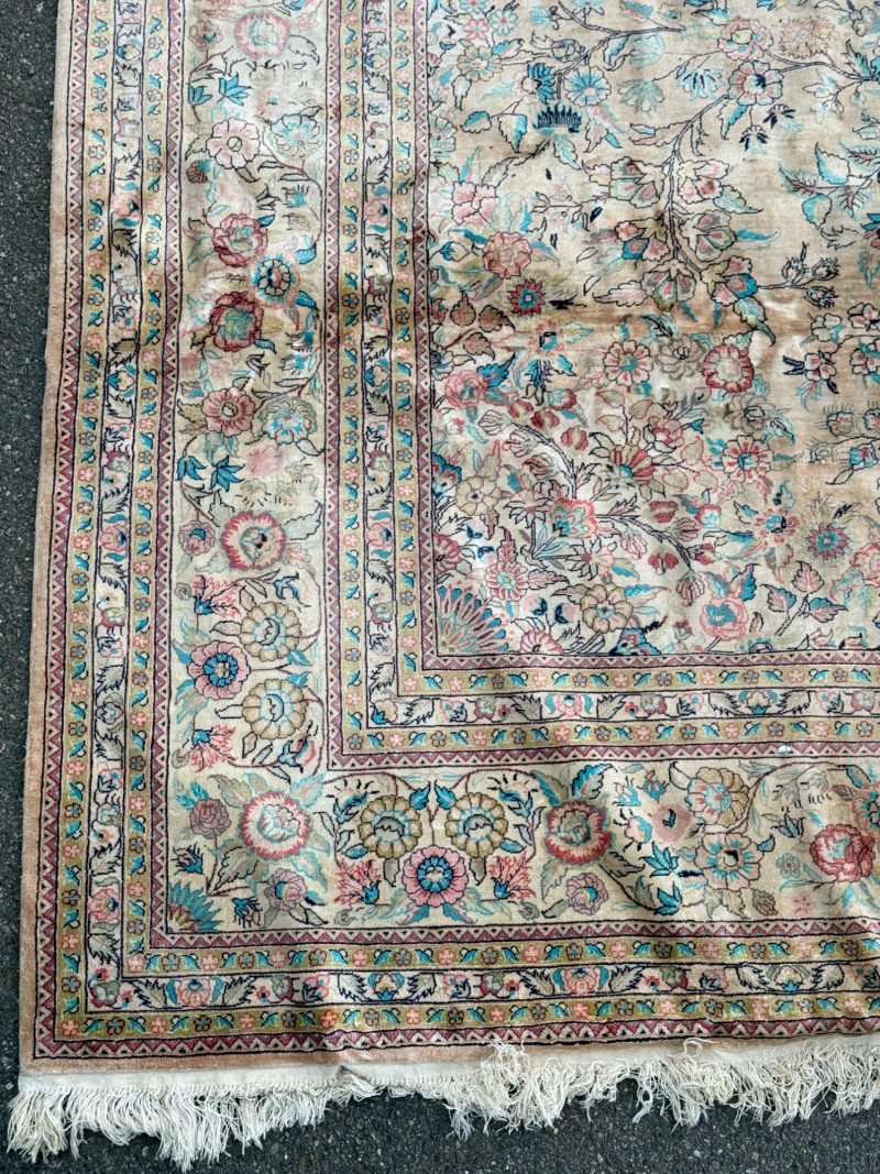 Hand Knotted Floral Room Rug 9’x11’ The prominent circular or star-shaped centerpiece often represents a lotus flower, a symbol of sacred significance in Persian culture. This "medallion-and-corner" layout is a hallmark of many prestigious Persian styles. The use of muted pastels—including soft pinks, light blues, and ivories—is frequently seen in Kerman (specifically those influenced by Western "French" floral designs) and Tabriz rugs. The delicate, flowery "detached floral spray" and soft hues are very characteristic of Kerman rugs from the mid-20th century Hand tied large room rug with soft pastels in a floral pattern. Cream background with the main colors of teal, pink and red. 2 smaller spots noted. No pet stains. Photographic discolorations are from folding. Includes a floor protector/no slip pad. Approximately 9’x11’