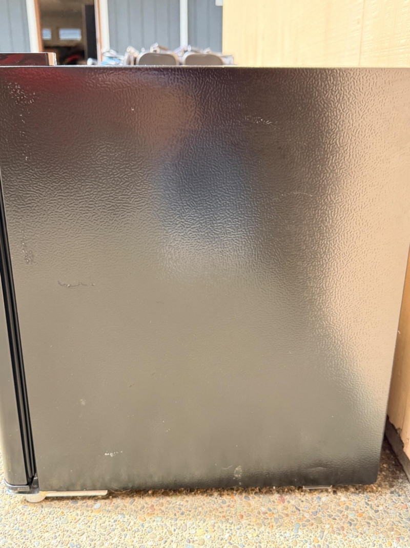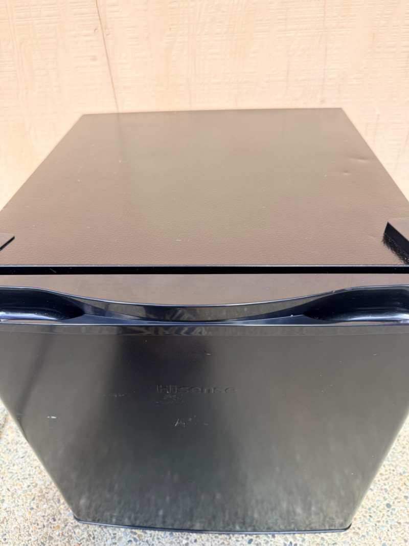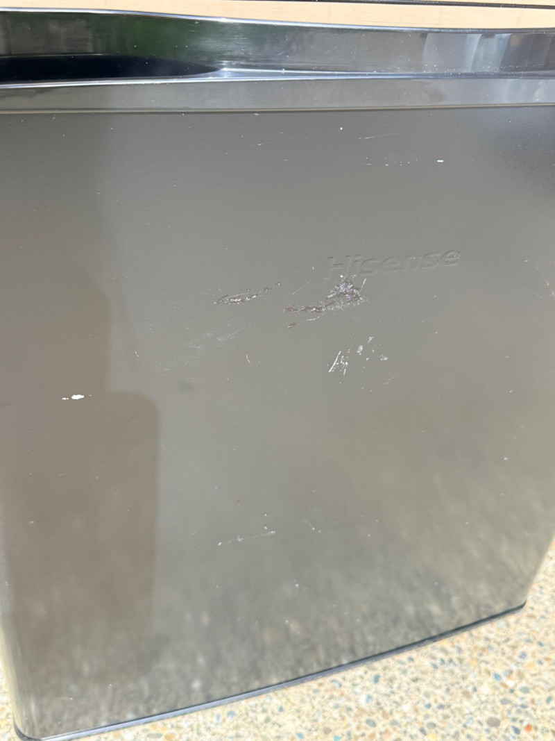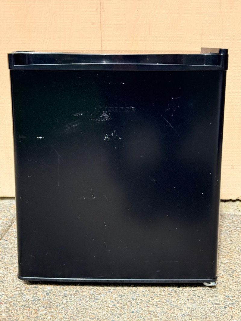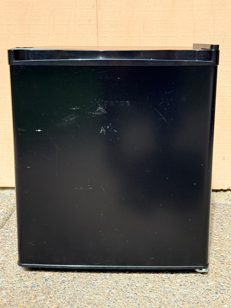 HiSense Compact Refrigerator Model #RR176DABE The perfect compact size of 17.5”x18.5”x20” The door can be adjusted to swing either side. Some shallow dings and paint scuffs. The interior is clean without odors.