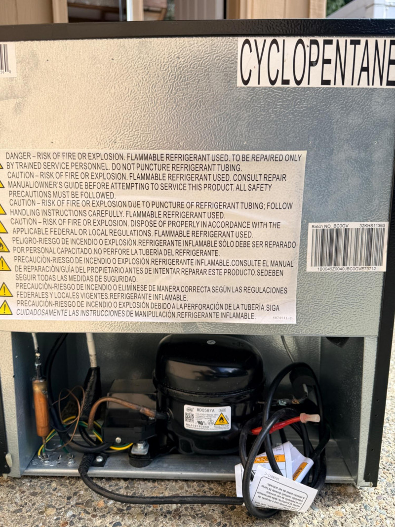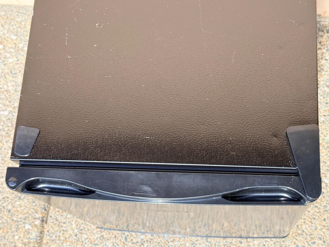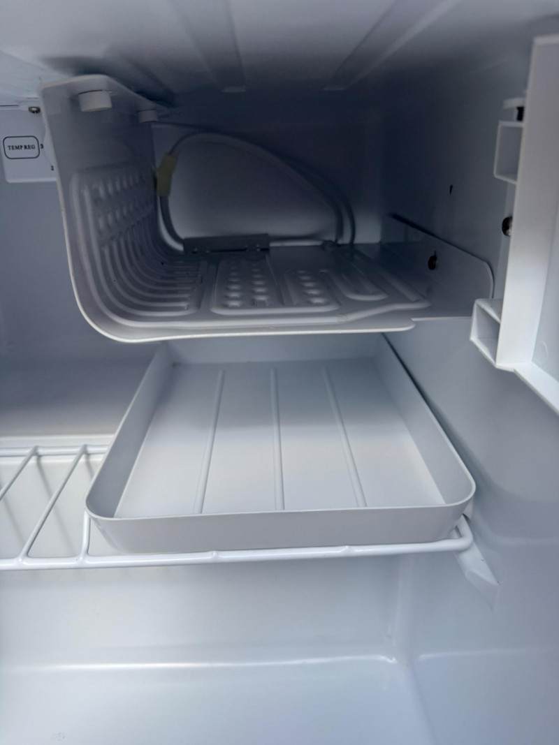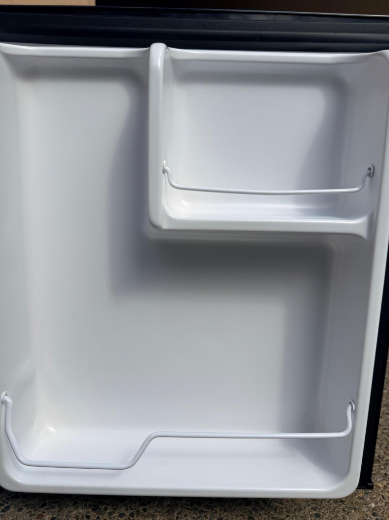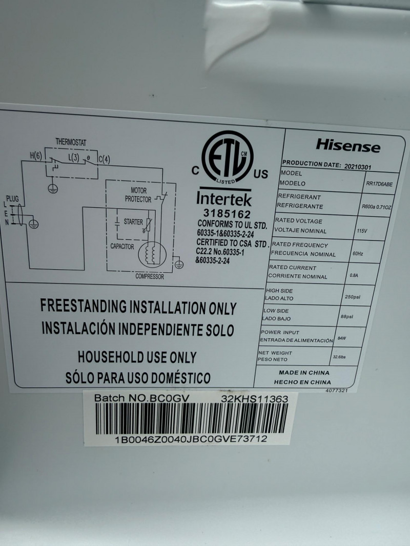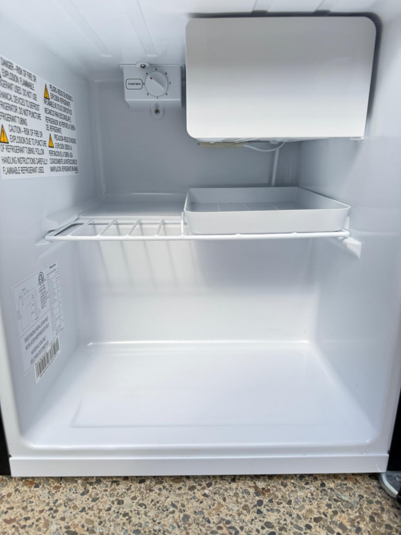 HiSense Compact Refrigerator Model #RR176DABE The perfect compact size of 17.5”x18.5”x20” The door can be adjusted to swing either side. Some shallow dings and paint scuffs. The interior is clean without odors.