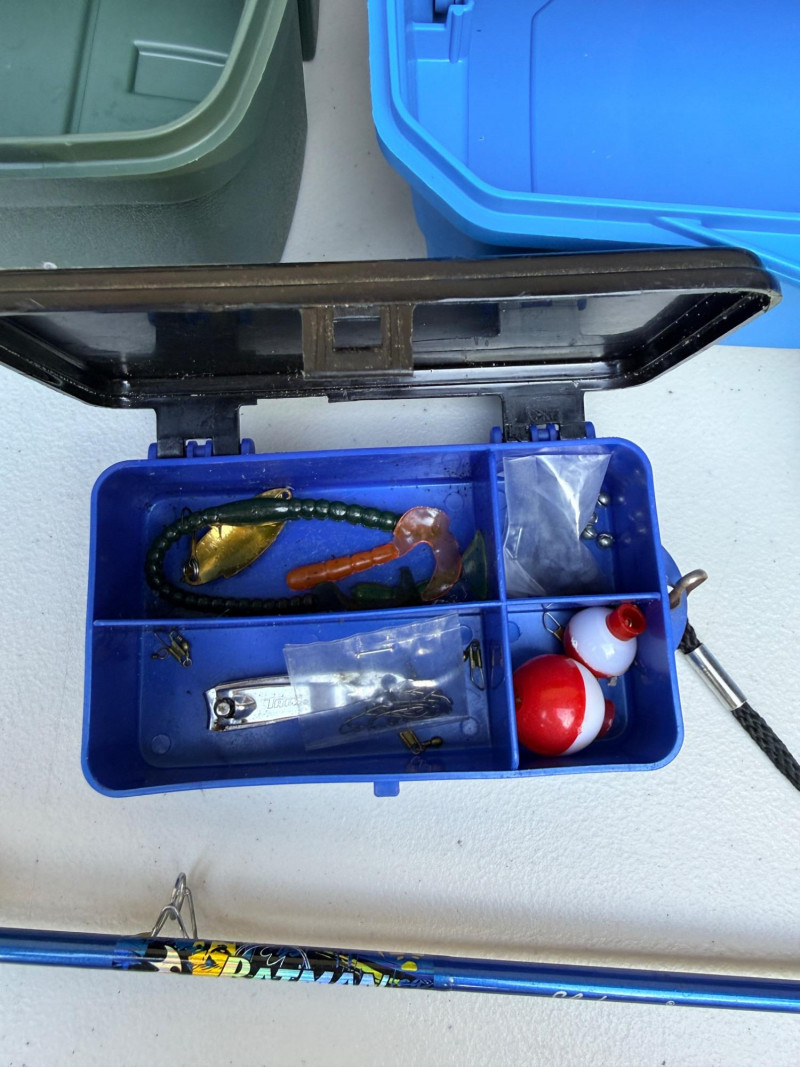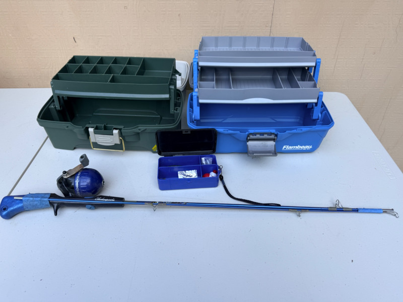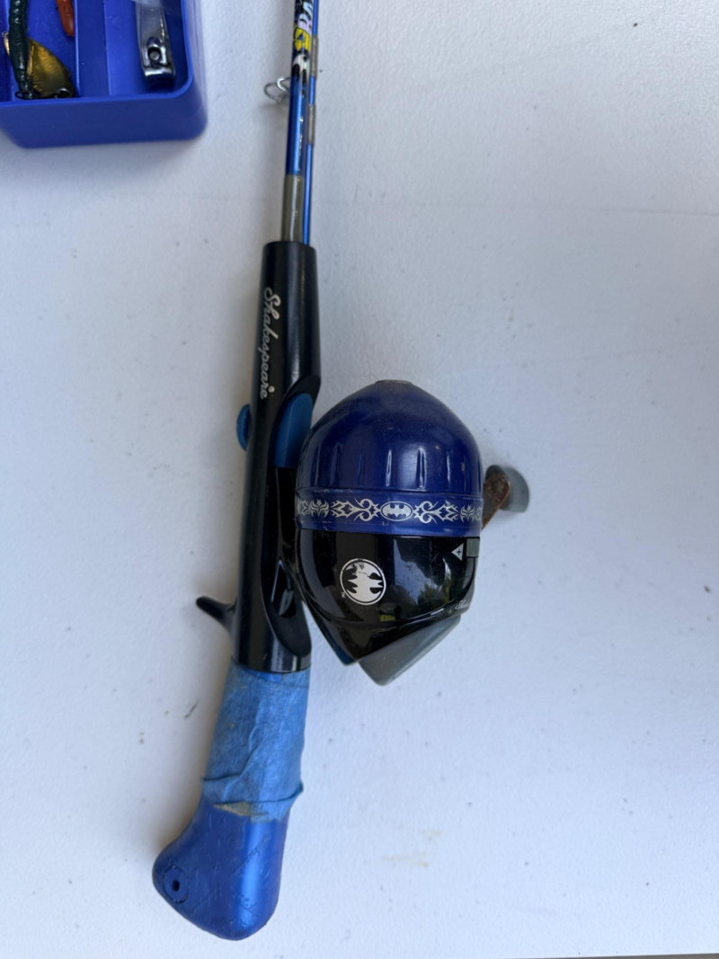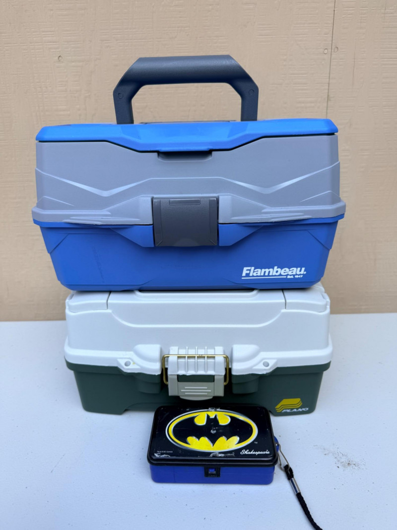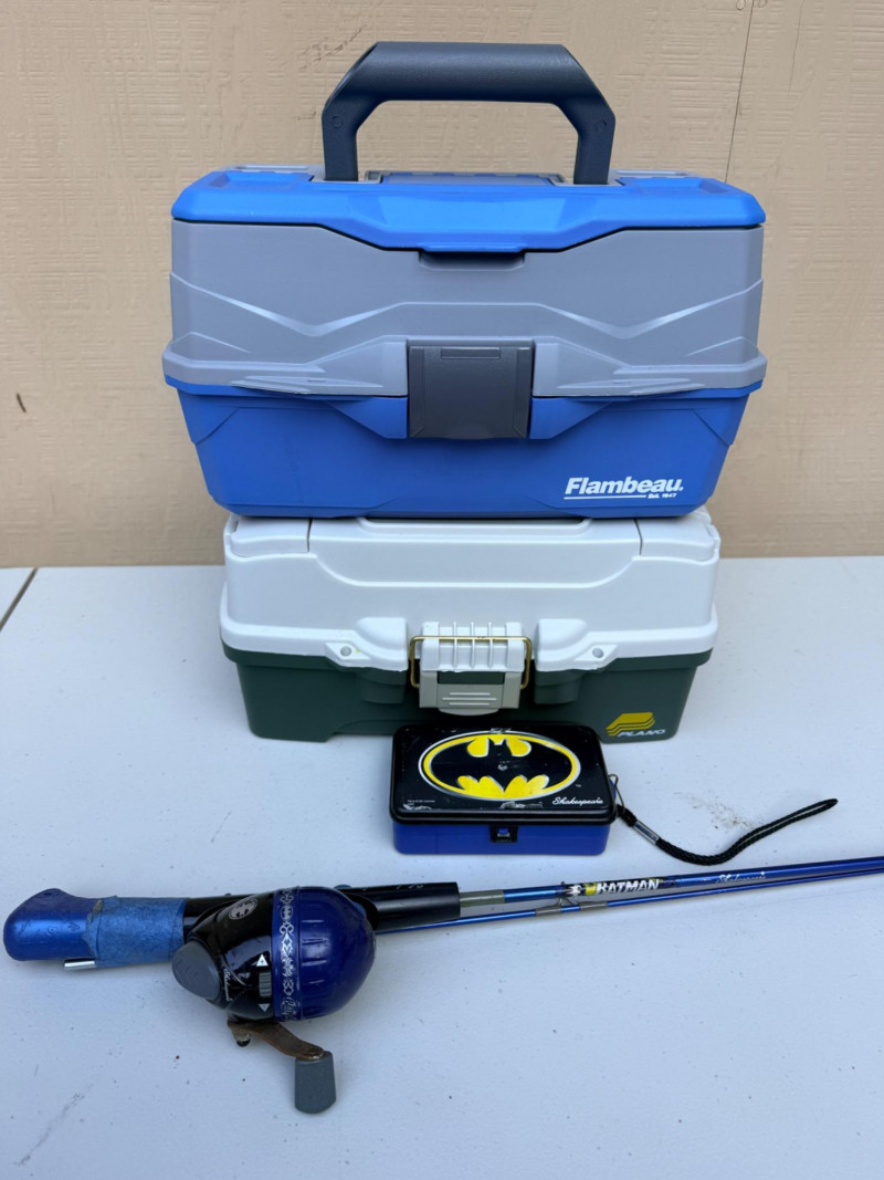 Tackle Boxes and Jr Batman Fishing Pole Shakespeare 5’ medium action pole & small lure box. Flambeau blue box 8”x14”x8” Plano tackle box.