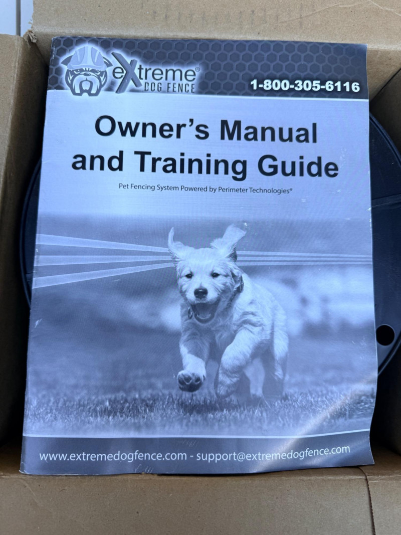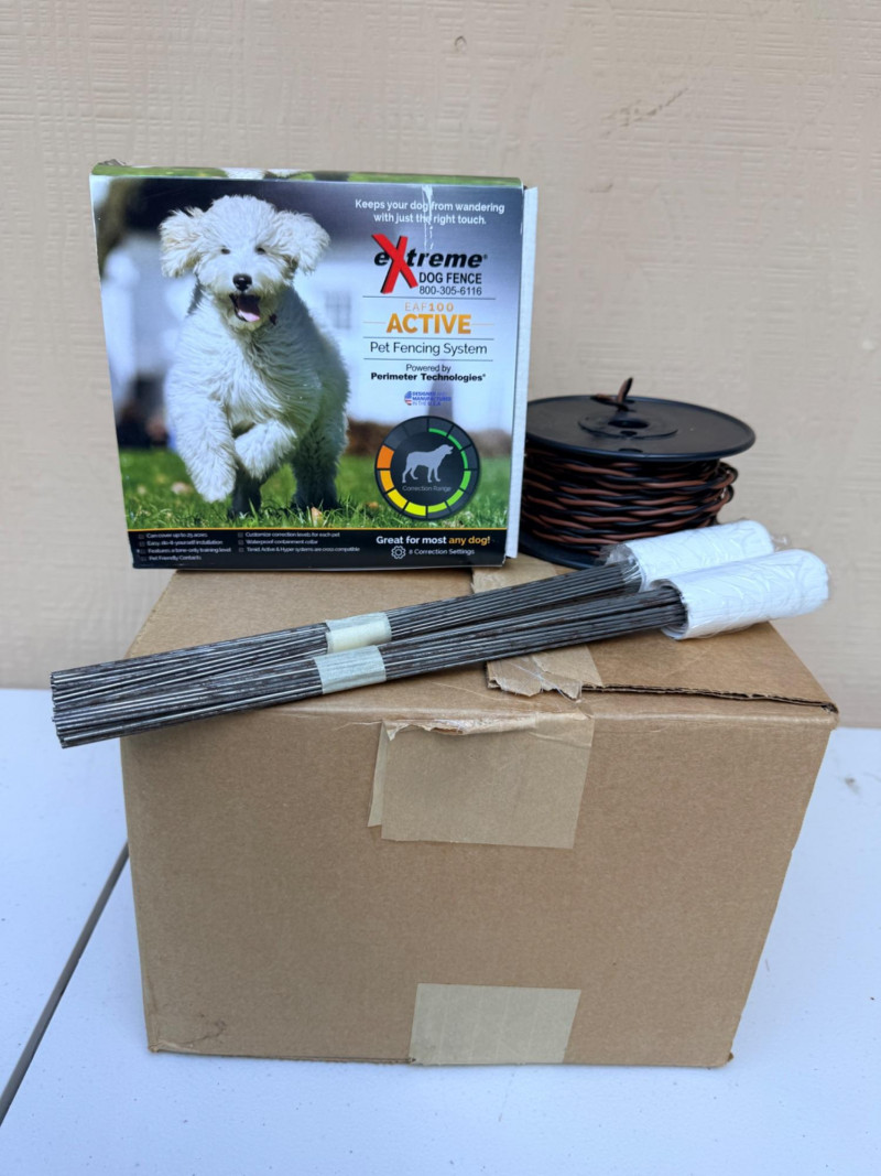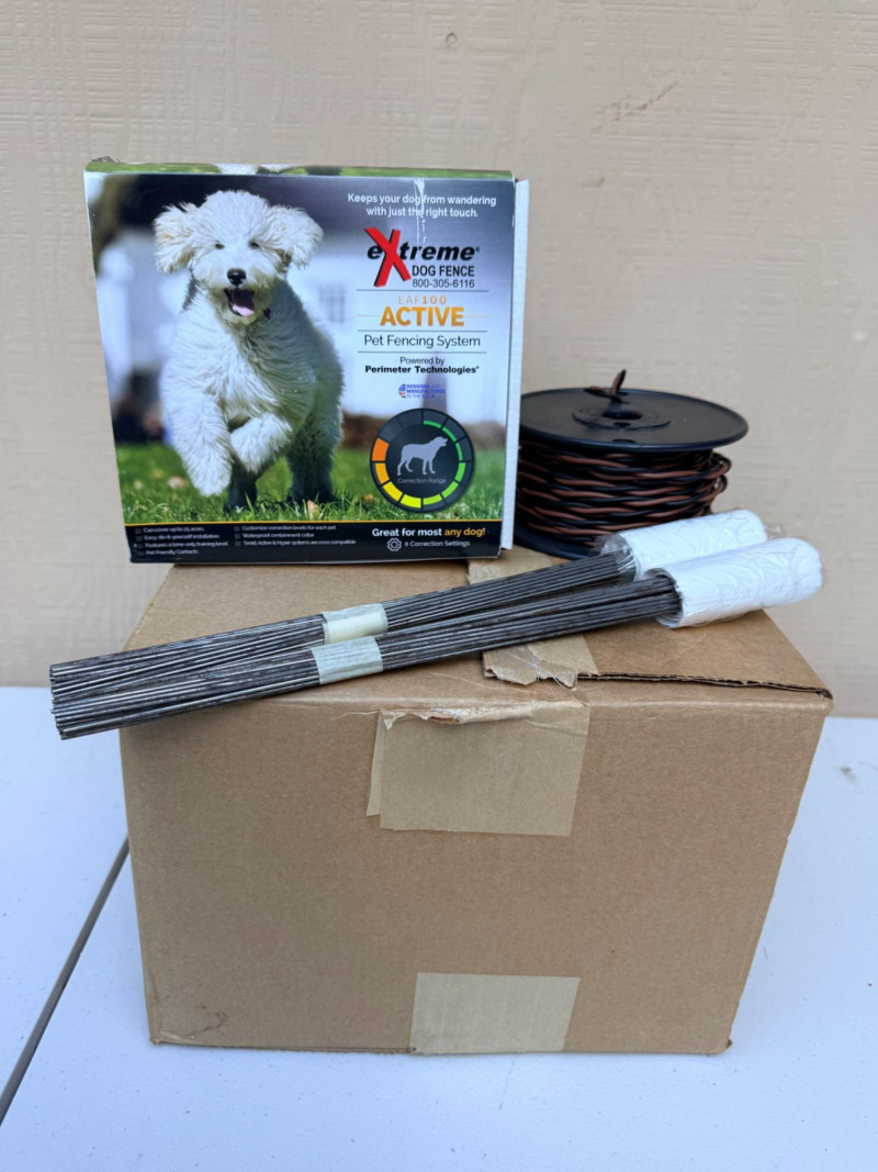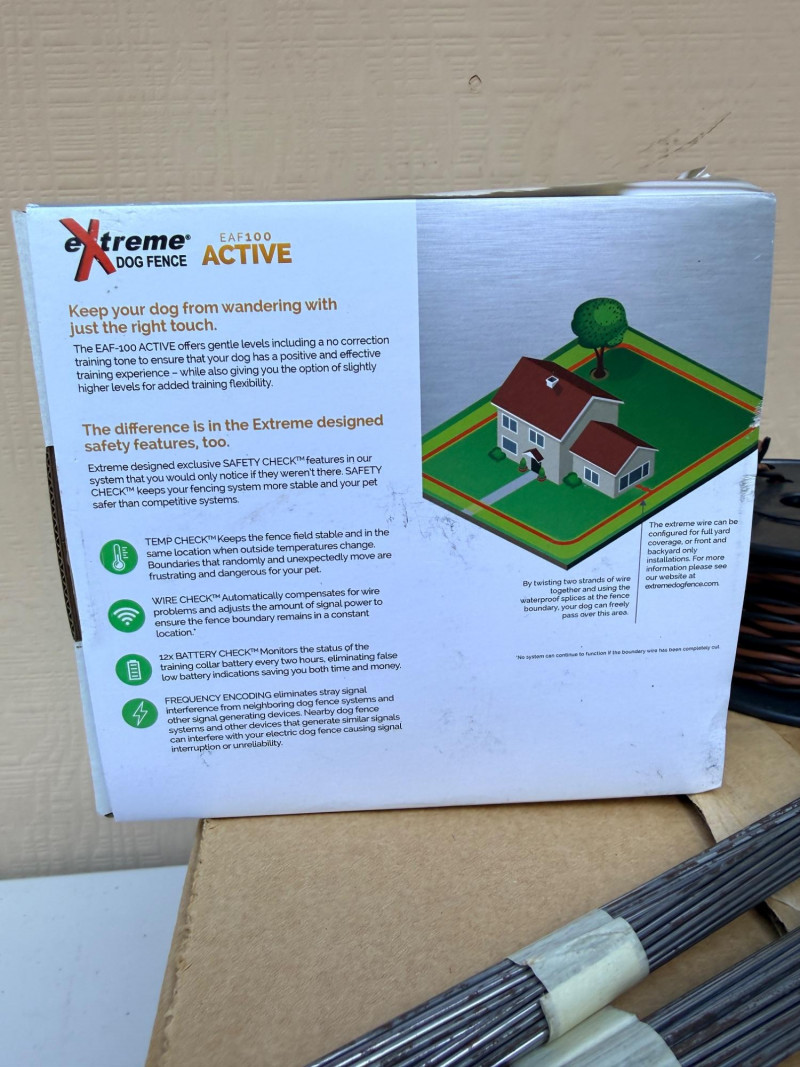Extreme Dog Fence EAF100 Active in-ground pet fencing system. Key features include: Covers up to 25 acres with customizable correction levels. Includes a waterproof containment collar and 14-gauge boundary wire. Powered by Perimeter Technologies to create a safe boundary for pets. Features a DIY-friendly installation design. New in box.