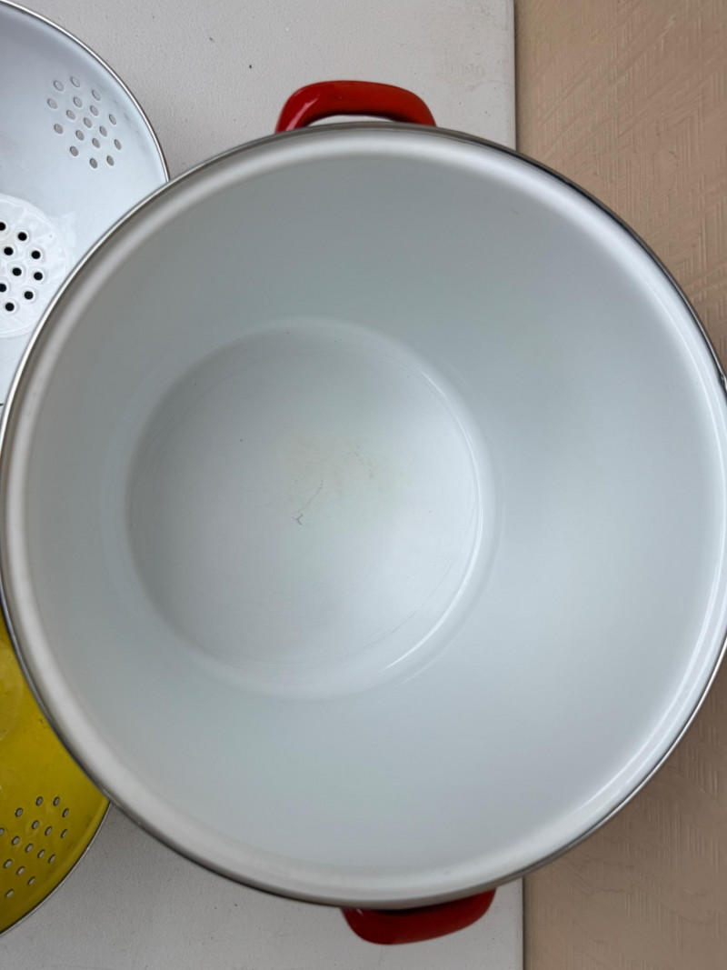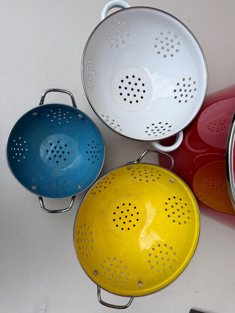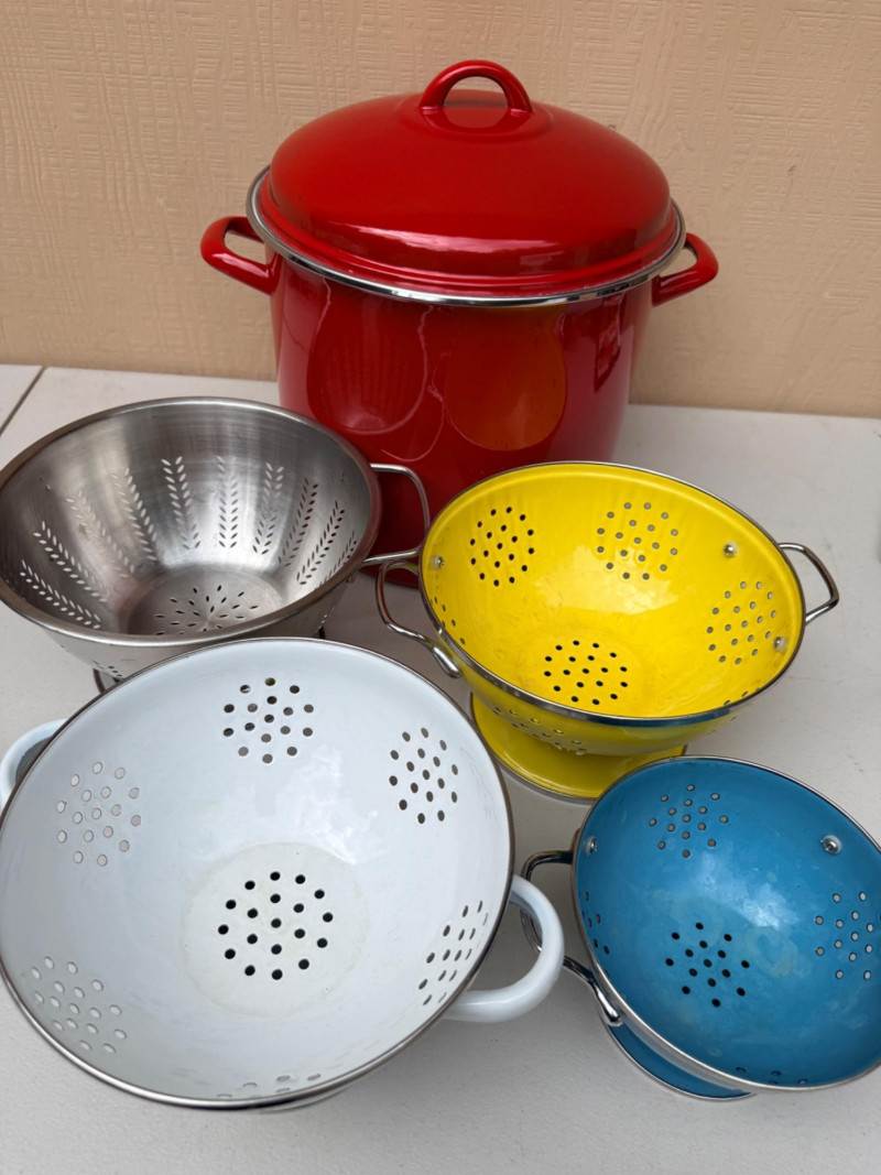 Yellow and white enameled colanders are 8.5”x5.5” Blue is 6.5”x4” Red Tools of The Trade 16qt stock pot is 11.5” diameter by 12” tall.