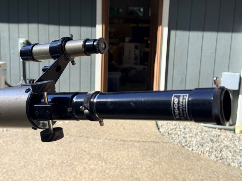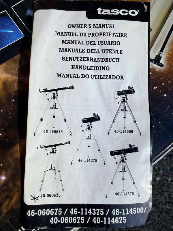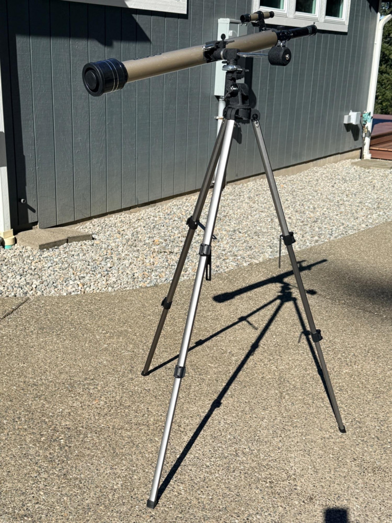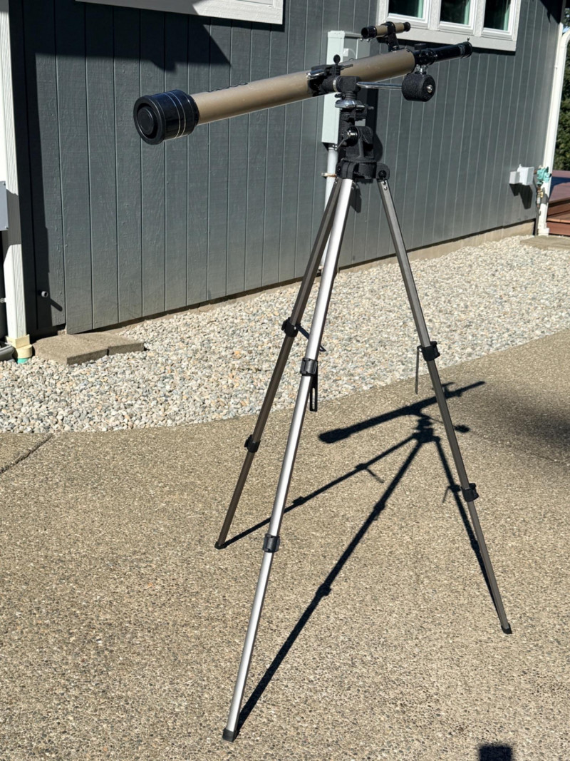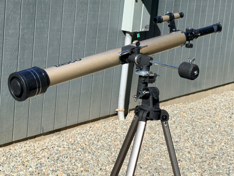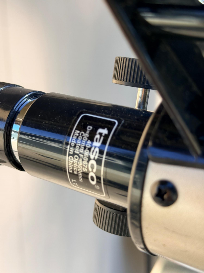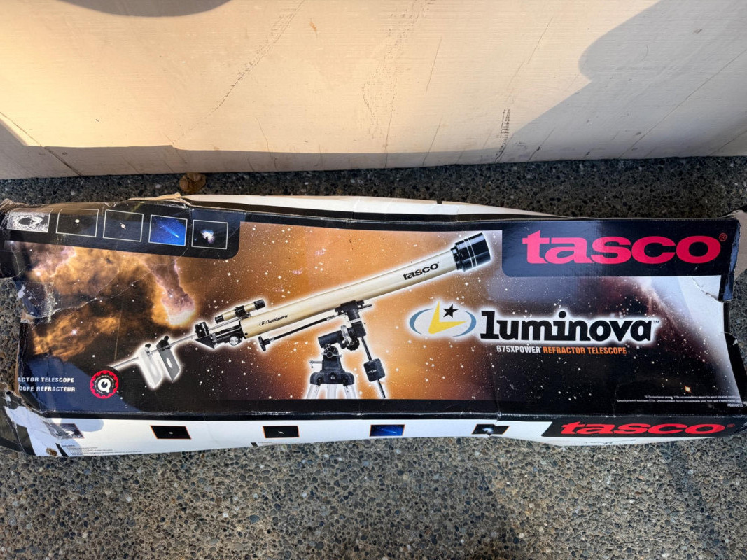 The Tasco Luminova 675x60mm Refractor Telescope (Model 40060675) is a 900mm focal length telescope designed for beginning amateur astronomers. While its marketing highlights an impressive 675x magnification, experienced users note that for a 60mm aperture, the maximum practical magnification is typically around 120x to maintain image clarity. Appears complete Tasco Luminova Refractor Telescope 675x60mm on 55” tripod.