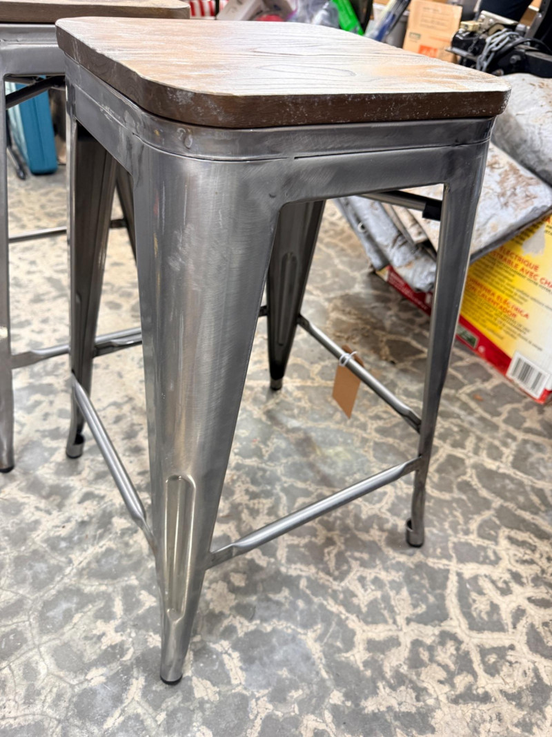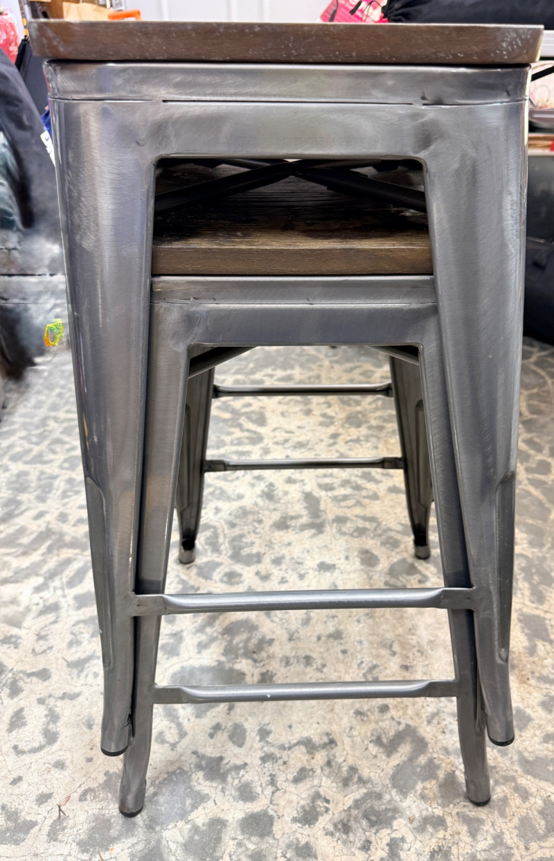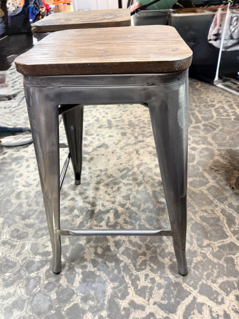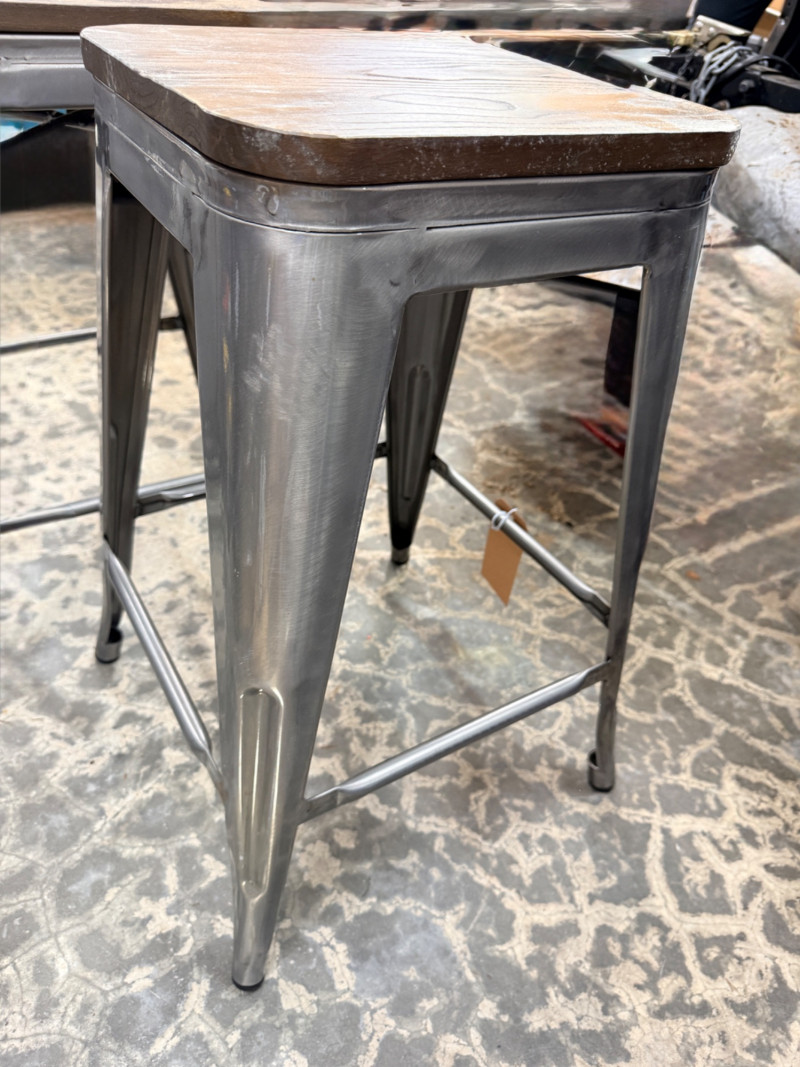 (4) 24" High Backless Clear Coated Metal Counter Height Stools Soho Style 12" x 12" Wood seats with brushed metal frame and tapered metal legs with a built-in footrest Some of the wood seats could use a refinishing or paint 24"T x 16"W x 16"D