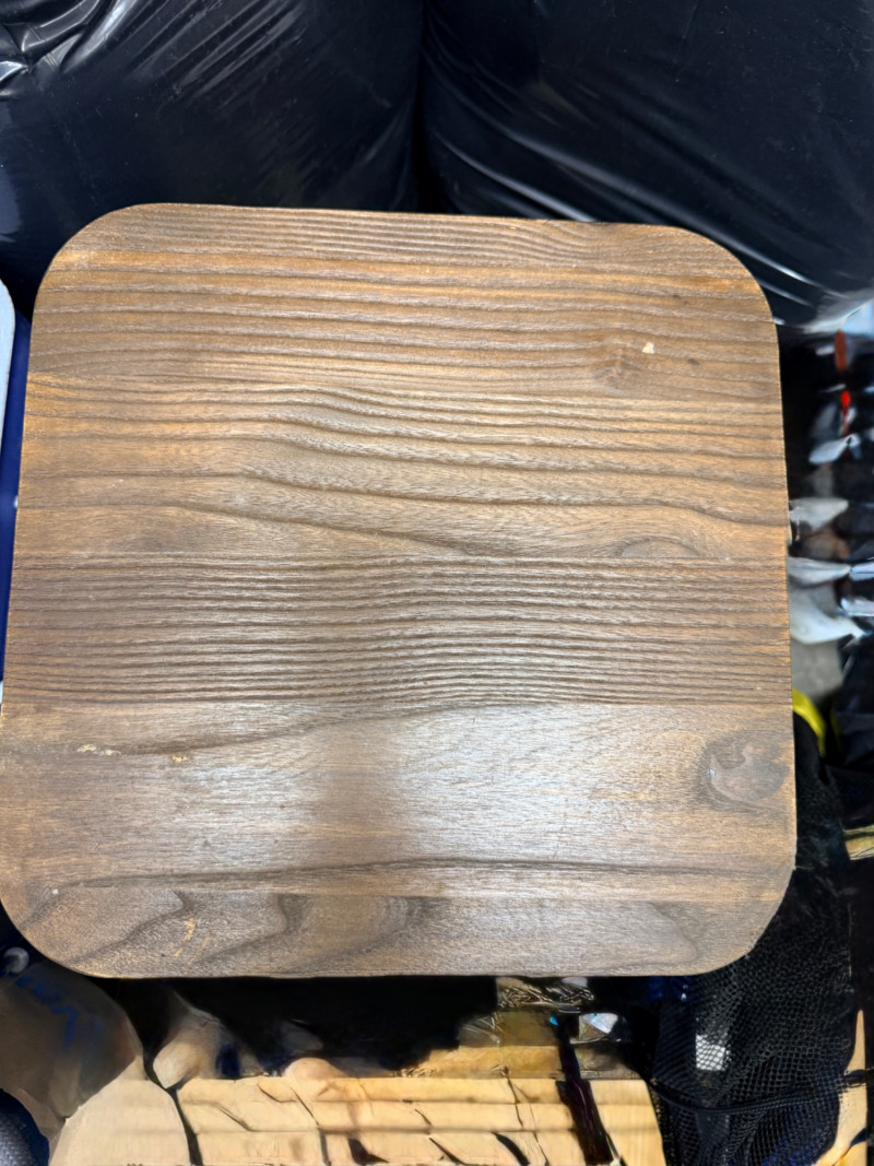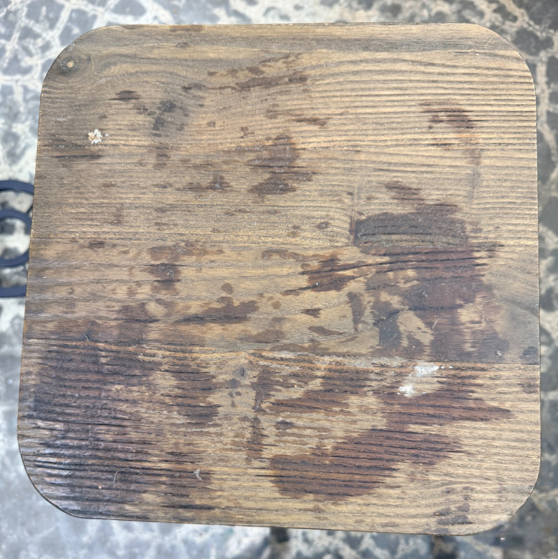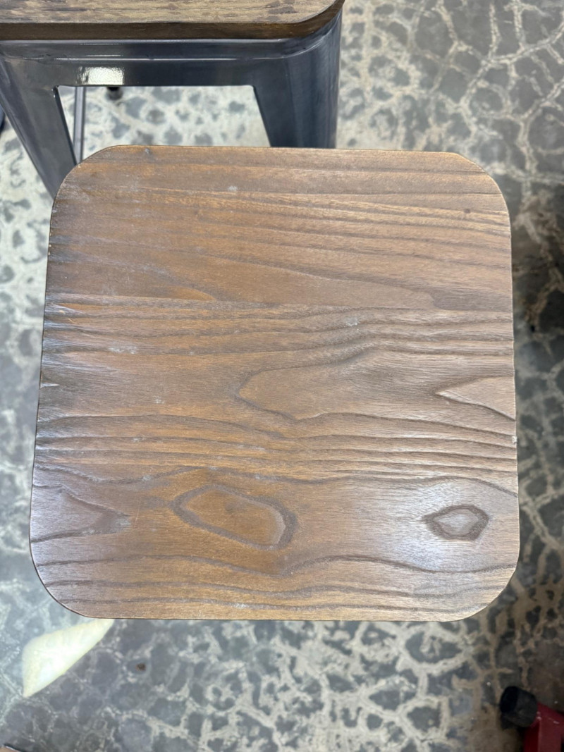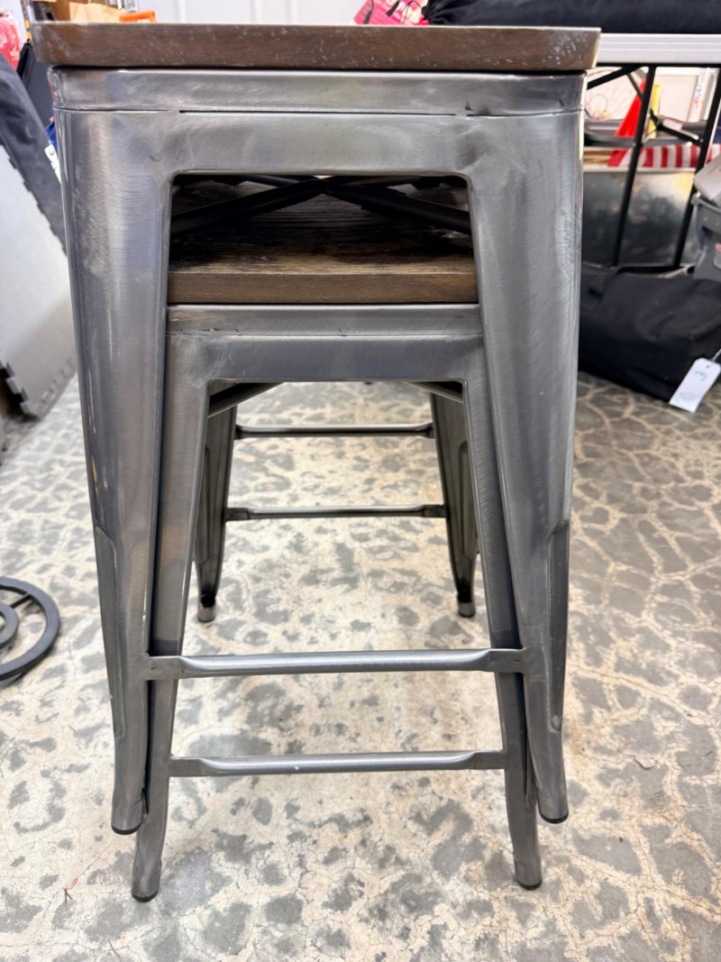 (4) 24" High Backless Clear Coated Metal Counter Height Stools Soho Style 12" x 12" Wood seats with brushed metal frame and tapered metal legs with a built-in footrest Some of the wood seats could use a refinishing or paint 24"T x 16"W x 16"D