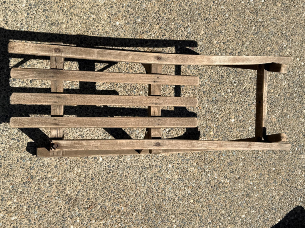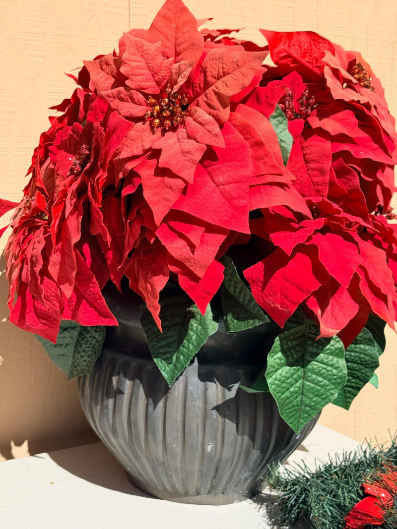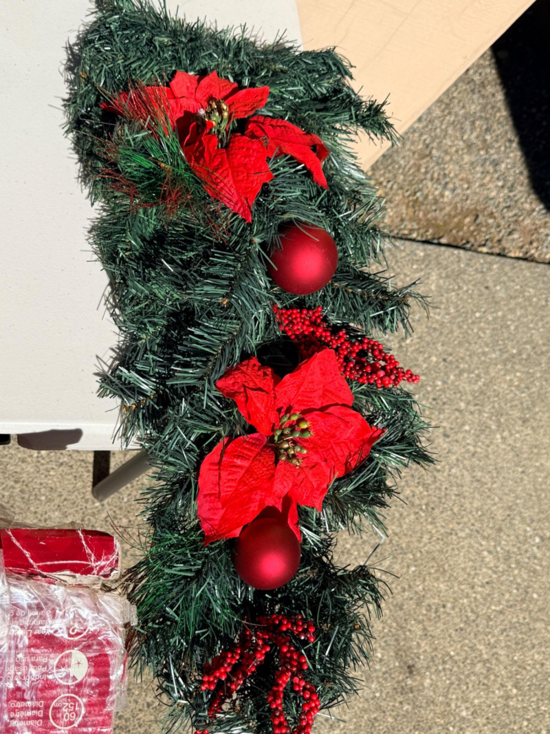Outdoor Christmas - 60” Lighted Wreath - Small Sled - Poinsettias 60” pre-lit wreath not tested Small sled with metal runners and one broken slat. 10”x13”x30” Small faux fir swag.